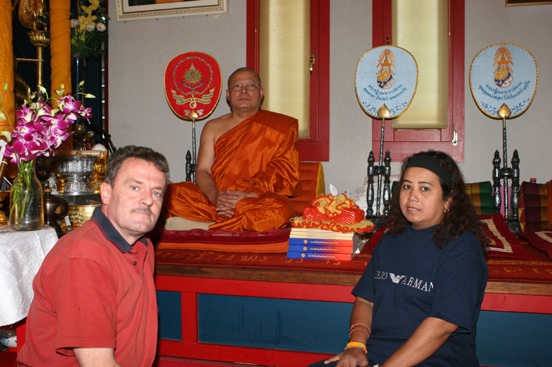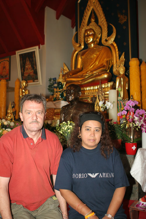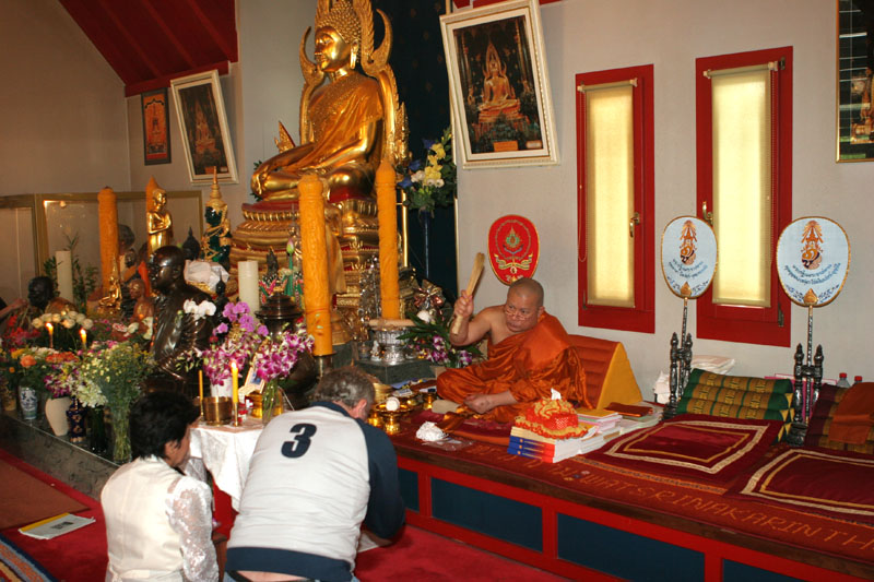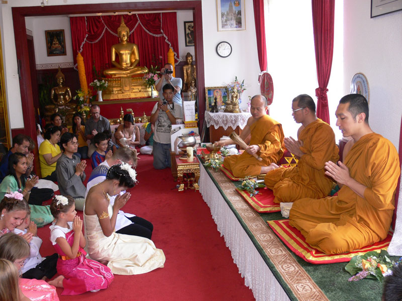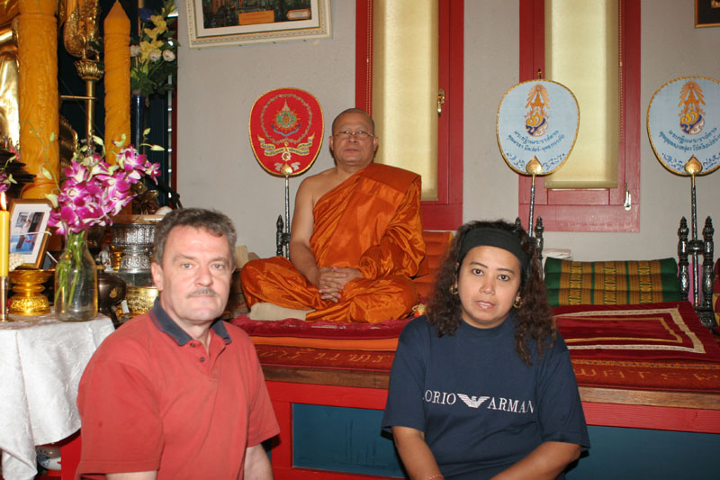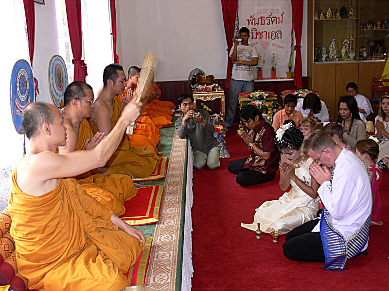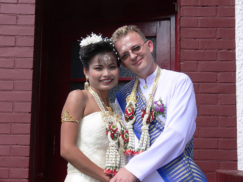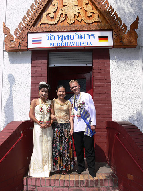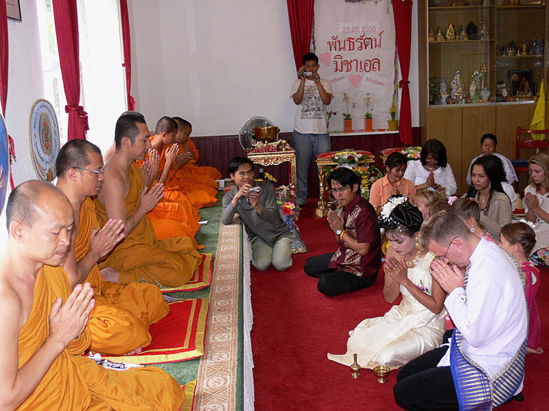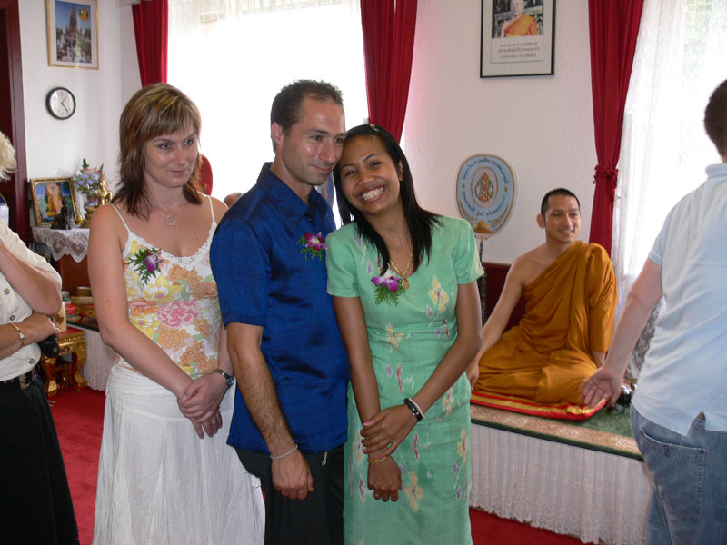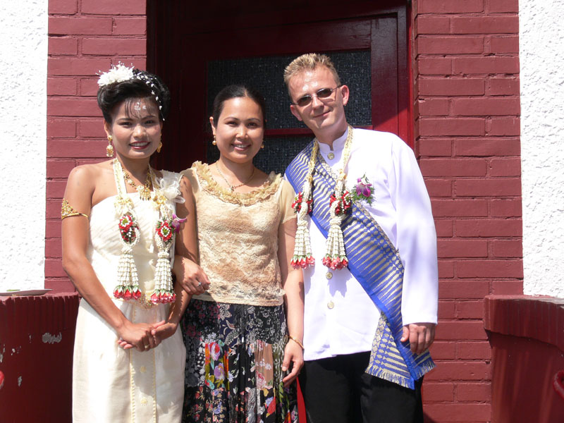 Aber nun begann der echte Stress. In nur drei Wochen eine Hochzeit im buddhistischen Stil auf die Beine zu stellen. Eigentlich war nur die standesamtliche Hochzeit (am 27.07.2006) im Rahmen der Familie geplant. Doch dann waren da der Achim, die Anke (14 Jahre Thailand-Erfahrung) und der Yad. Etwas Besonderes für Noi sollte es sein, sagten sie. Noi sollte ein wenig an ihre Heimat erinnert werden. Und so kam es, wie es kommen musste: eine kleine buddhistische Zeremonie musste her (erst als Überraschung für Noi gedacht). Geplant wurde eine halbe Stunde im Wat Buddhavihara. Doch daraus wurde mehr und mehr. Wie die lieben Thais ja so sind, wenn es um eine Feier geht. Noi musste also eingeweiht werden. Dann Gespräche mit den Mönchen und den Thais im Wat; organisieren und planen war angesagt. Es habe schon lange keine Hochzeit mehr im Wat gegeben, hieß es. Und wenn schon Hochzeit, dann auch richtig. Aus der halben Stunde wurden dann etwa vier Stunden (gut, dass es nicht zwei Tage, wie in Thailand üblich, waren).