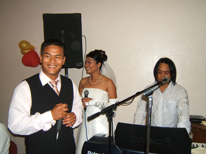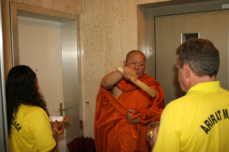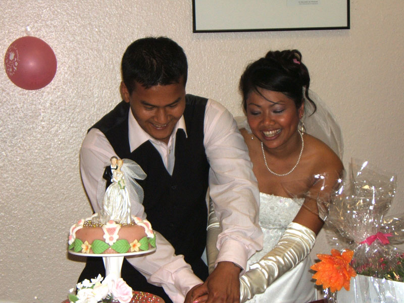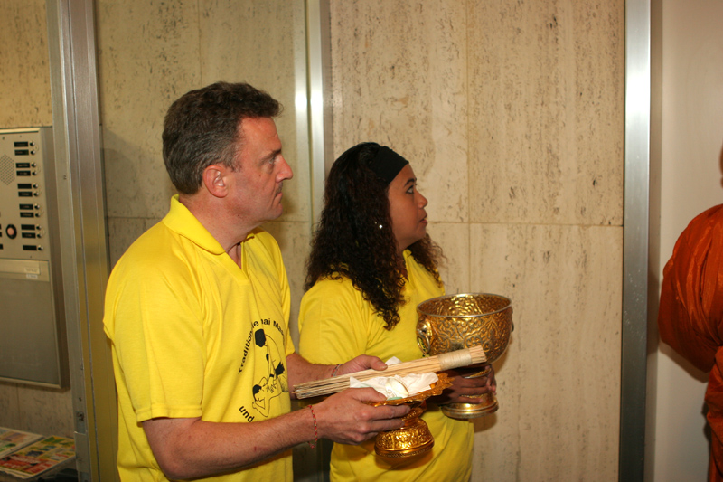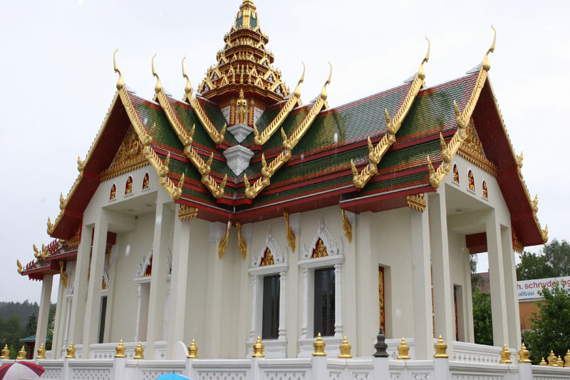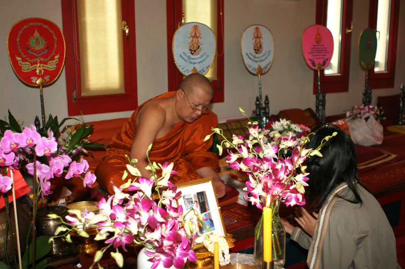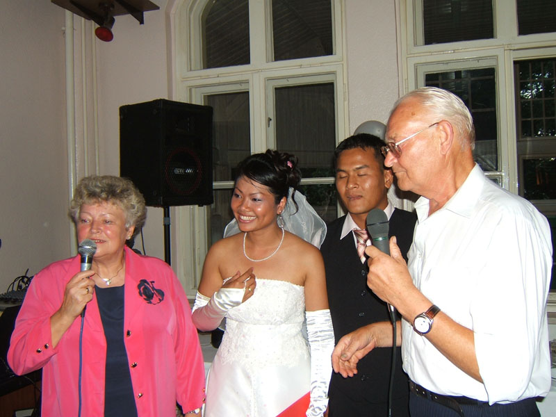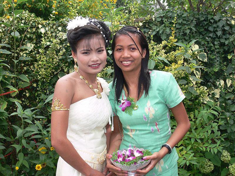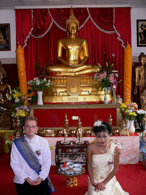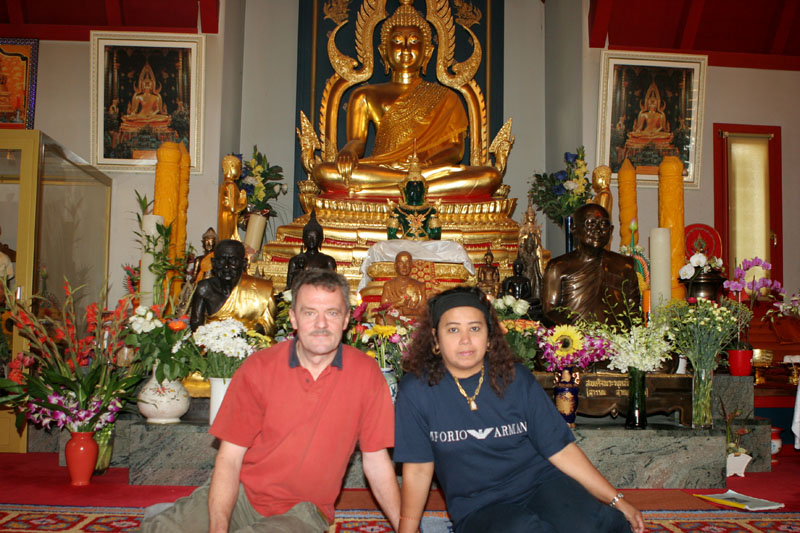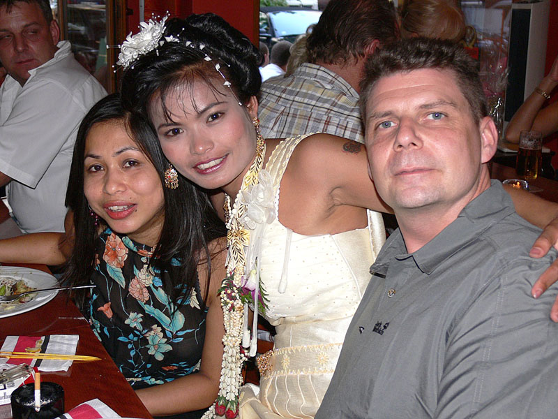 Aber nun begann der echte Stress. In nur drei Wochen eine Hochzeit im buddhistischen Stil auf die Beine zu stellen. Eigentlich war nur die standesamtliche Hochzeit (am 27.07.2006) im Rahmen der Familie geplant. Doch dann waren da der Achim, die Anke (14 Jahre Thailand-Erfahrung) und der Yad. Etwas Besonderes für Noi sollte es sein, sagten sie. Noi sollte ein wenig an ihre Heimat erinnert werden. Und so kam es, wie es kommen musste: eine kleine buddhistische Zeremonie musste her (erst als Überraschung für Noi gedacht). Geplant wurde eine halbe Stunde im Wat Buddhavihara. Doch daraus wurde mehr und mehr. Wie die lieben Thais ja so sind, wenn es um eine Feier geht. Noi musste also eingeweiht werden. Dann Gespräche mit den Mönchen und den Thais im Wat; organisieren und planen war angesagt. Es habe schon lange keine Hochzeit mehr im Wat gegeben, hieß es. Und wenn schon Hochzeit, dann auch richtig. Aus der halben Stunde wurden dann etwa vier Stunden (gut, dass es nicht zwei Tage, wie in Thailand üblich, waren).