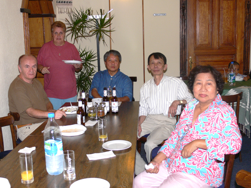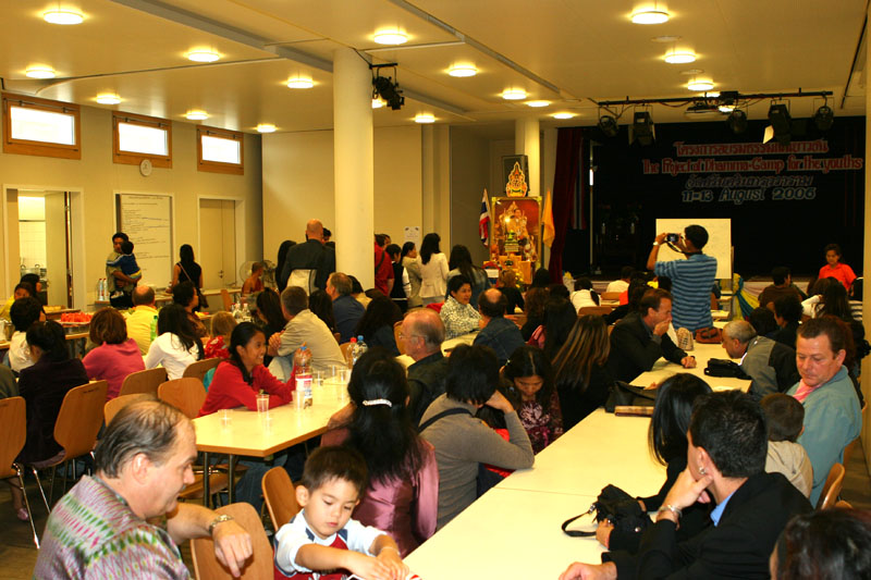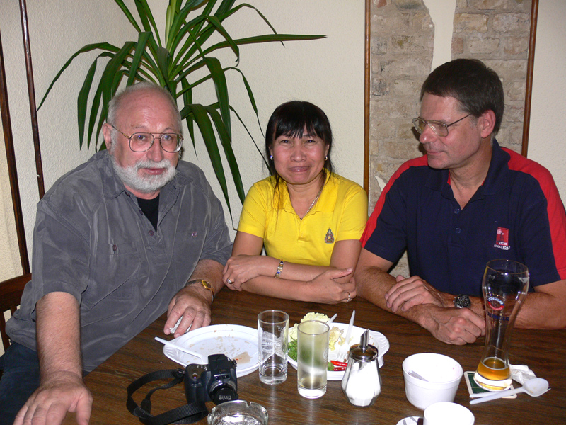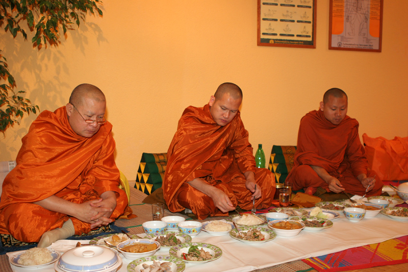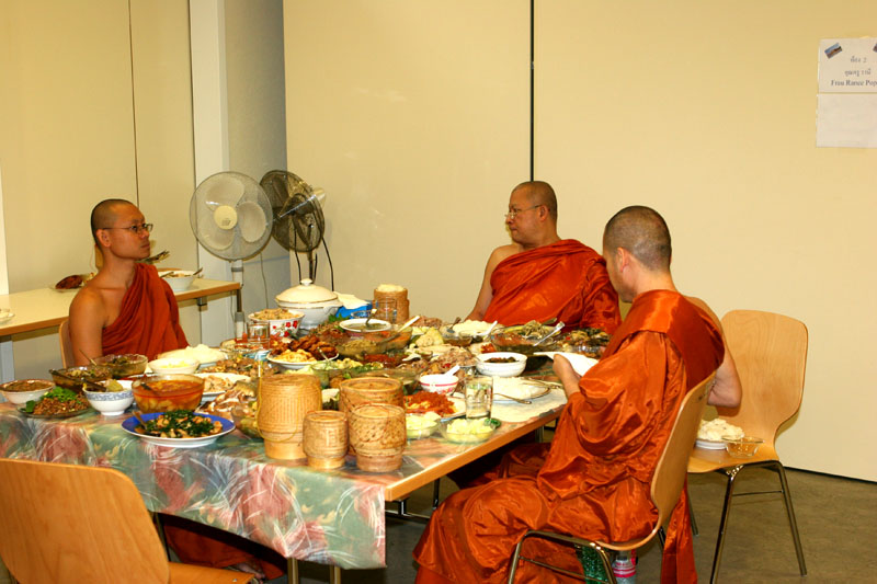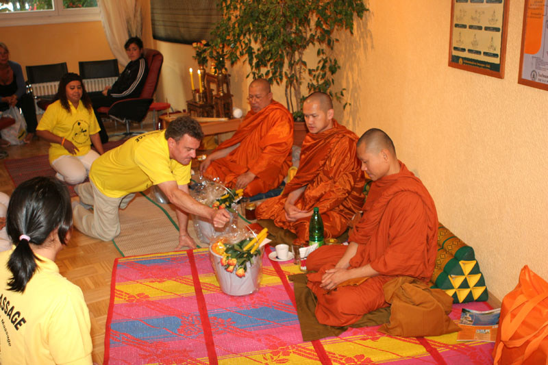 Ab ca. 11.00 Uhr erst einmal zum Beten zu den Mönchen. Wir hatten natürlich Ehrenplätze ganz vorne. Verstanden habe ich natürlich nichts, aber es klang alles gut. Gut, dass Yad wenigstens einiges erklärt hat. Da kommt man sich nicht so dumm vor. Dann das Essen der Mönche um 12 Uhr. Eigentlich dachte ich, es wäre schon alles vorbei; aber denkste. Das war nur der Anfang. Zwischenzeitlich machte Helmut wieder einige Fotos. Und dann bekamen auch wir wieder etwas zu essen. Toll haben die Thais hier etwas vorbereitet. Nach dem Essen wieder hinein und sitzen und beten. Auch nass wurden wir. Wir übergaben an die Mönche Geschenke und erhielten ein Buch als Geschenk. Diesmal wurde mir alles übersetzt von Wichien. Ein schönes Gefühl etwas zu verstehen.