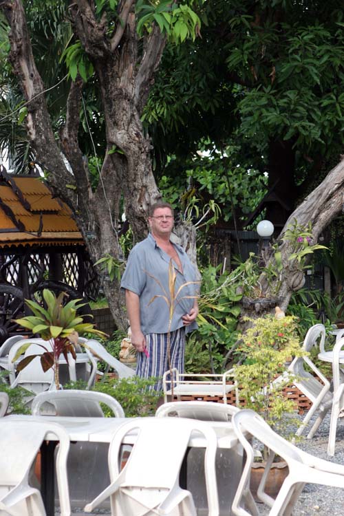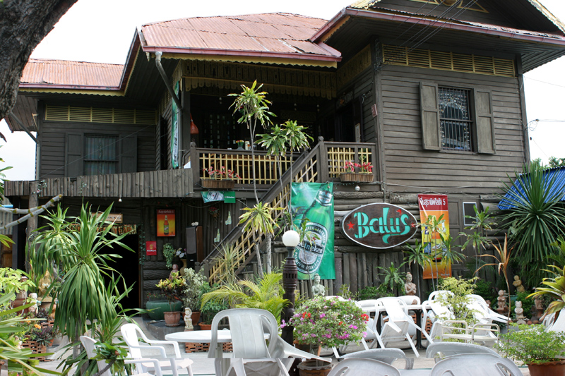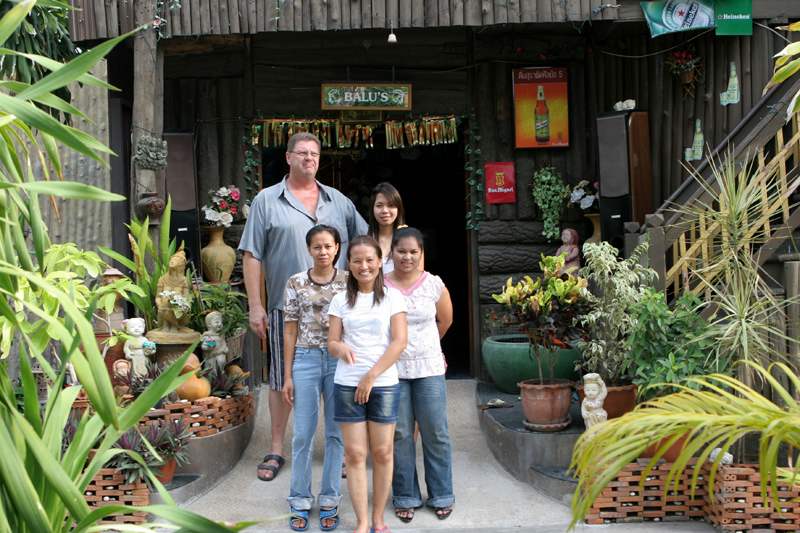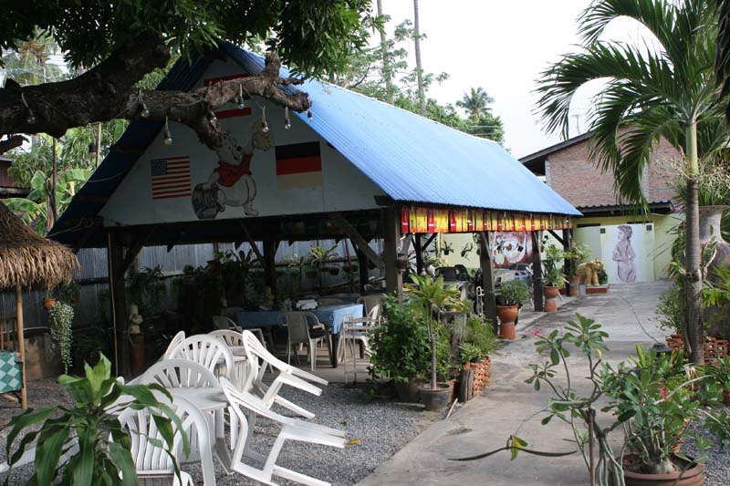 Ebenso gut aufgehoben fühlt man sich bei Ralf Pischke in Balu's Restaurant. Der deutsche Bär misst stattliche 198 cm bei 145 Kilo. Er arbeitete früher bei der Polizei und urlaubte 1975 das erste Mal in Thailand. Fest stationiert in Korat ist Balu seit Februar 1997. Das Grundstück in der Mahattai Road, auf dem er residiert, war ein Glückstreffer. Selbiges wurde dem Besitzer von Ihrer Majestät dem König für besondere Verdienste überreicht und darf nicht verkauft werden. Als Pächter ist das für Balu eine sichere Sache, und so wurden die Pforten des Restaurants am 1.10.98 geöffnet. Mit Hilfe seiner Lebenspartnerin Paiwan ließ es sich für den Hobbykoch recht gut an. Inzwischen (und nach etlichen Versuchen) stellt er sogar eigene Bratwürste her und hat Abnehmer bis in entferntere Gegenden. Das aus Holz gebaute Gebäude ist 100 Jahre alt, steht unter Denkmalschutz und ist ein Anziehungspunkt für gefräßige Termiten. Es muss daher viel Aufwand getrieben werden, um die nimmersatte Plagegeister fernzuhalten. Aber auch das wird mit Bärenruhe erledigt.