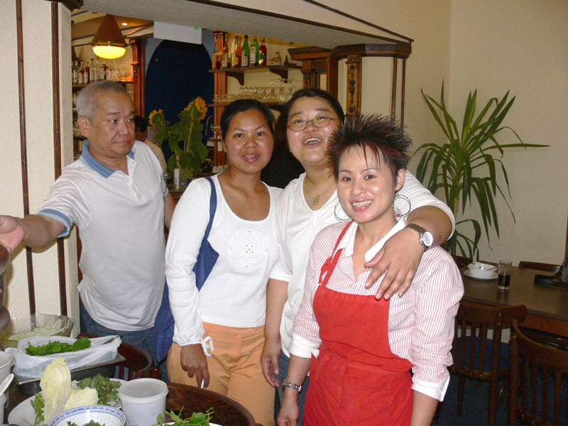 Dann ab ca. 15.00 Uhr ins Restaurant "Moon Thai" in die Knesebeckstraße. Die haben extra das Restaurant für uns geschlossen. Super geschmückt mit Ballons, Girlanden, Blumen und viel Obst. Das Beste: eine riesige Wassermelone mit unseren Namen. Es gab ein reichhaltiges Buffet nach thailändischer Art (natürlich nicht so scharf) und Getränke ohne Ende. Nach und nach kamen dann weitere Gäste. Od mit Wim, Jimmy mit Eddi, Udo mit Sonja und Omi (frisch aus Thailand), Frank mit Nong und Tum (Chefin des Thai-Thek), Jenny mit Mama, Mathias vom FARANG (spät, aber er kam) und viele viele weitere Farangs.