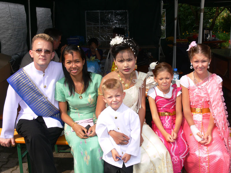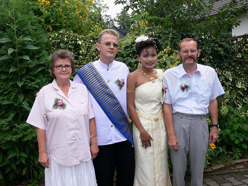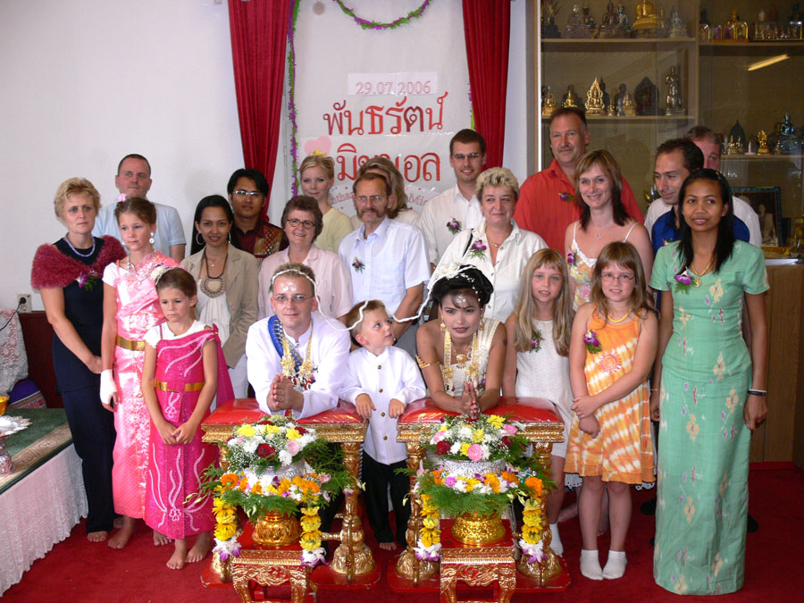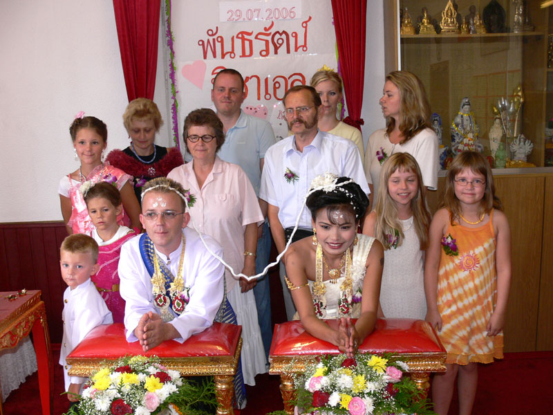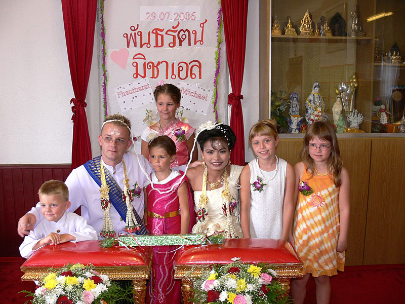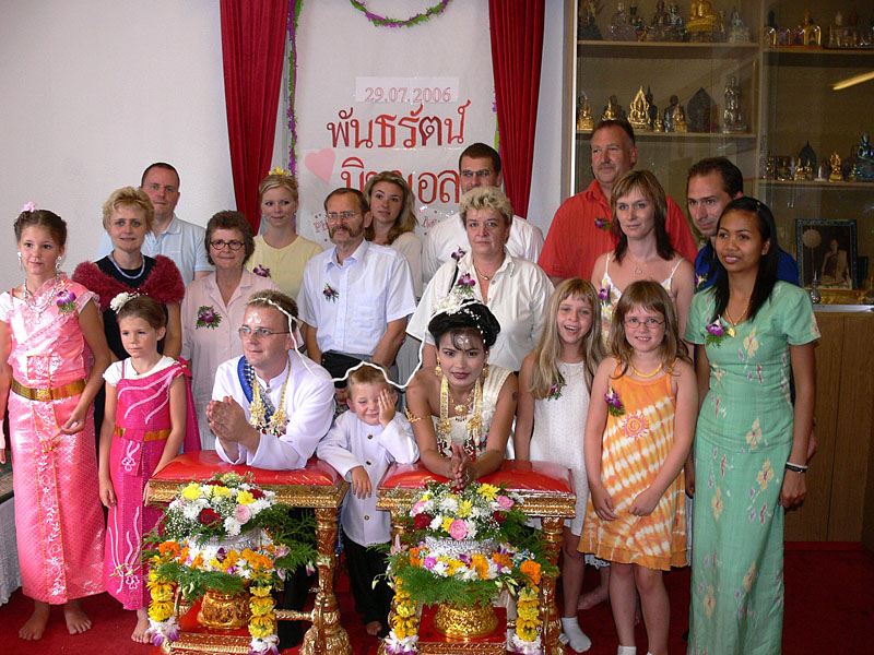 Am 29.07.2006 um 5.30 Uhr morgens ging es dann los für uns. Noi musste zum Friseur. Kaum geschlafen und aufgeregt setzte ich sie um 6.30 Uhr ins Taxi. Dann meinen drei Kindern die thailändischen Trachten anziehen (extra in Thailand anfertigen lassen) und auch mich zu recht machen. Gut, dass hier noch meine Schwester Diana und mein Bruder Thomas (unser Chauffeur) geholfen haben. Und dann alle um 9.00 Uhr zum Friseur. Da sah ich meine Zukünftige. Ein vanillefarbenes Kleid mit vielen Goldverzierungen, hochgesteckte Haare und ein typisch weiß geschminktes Gesicht. Einfach atemberaubend war der Anblick für mich. Schnell noch meine beiden Töchter Maike und Svenja frisieren lassen, die extra bestellten Blumen abholen in DAO's Asia Shop (frisch eingetroffen vom Flughafen Bangkok). Und dann alle zusammen (Yad und Freundin Gift waren auch schon da) zum Wat Buddhavihara. Eintreffen gegen 10 Uhr. Hier warteten schon Achim + Anke mit einem reichhaltigen Frühstücksbuffet. Die Thais waren fleißig dabei, die Blumengestecke herzurichten. Noi war natürlich sehr aufgeregt. Helmut kam und begann sofort die ersten Fotos zu schießen. Nach und nach traf dann auch meine Familie (Eltern, vier Geschwister und zwei Nichten) ein. Auch Phon und Toto aus Frankfurt sowie Annette und Christian aus Berlin waren dabei. Nun ging es also langsam los.