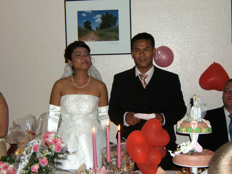 Dann ab auf die Hocker, Arme nach vorne und warten. Ein weißes Band wurde uns als Symbol der Verbundenheit um die Köpfe gebunden (ob das hält?). Dann wurde uns von allen Anwesenden (bestimmt über 50 Personen) Wasser über die Hände gegossen in Verbindung mit Glückwünschen. Ich sage Euch, meine Hände waren anschließend vielleicht aufgeweicht. Der beste Spruch natürlich von Achim: "Könnt Ihr Euch nicht alleine waschen?" Dann wieder etliche Fotos machen, und es war vorbei. Ein Hochzeitsbuch wurde uns übergeben. Hier haben uns alle ihre Glückwünsche eingeschrieben. Eine tolle Erinnerung. Vielen Dank dafür.