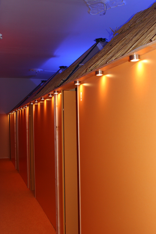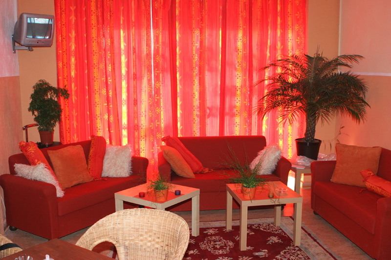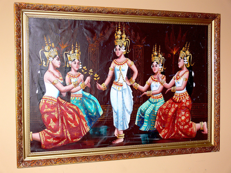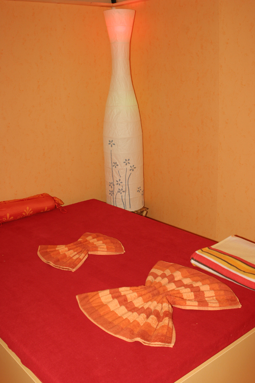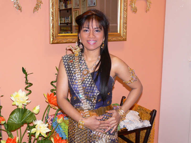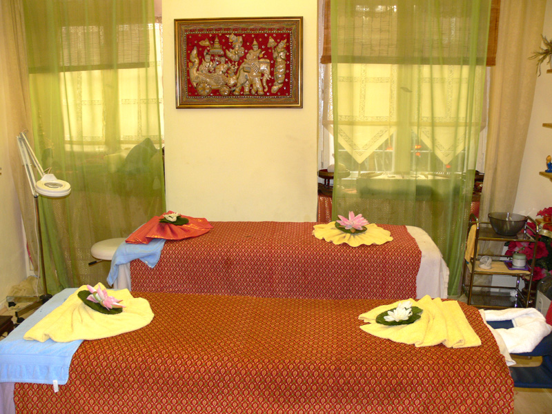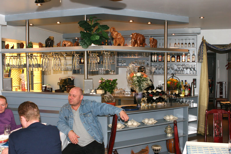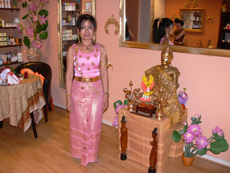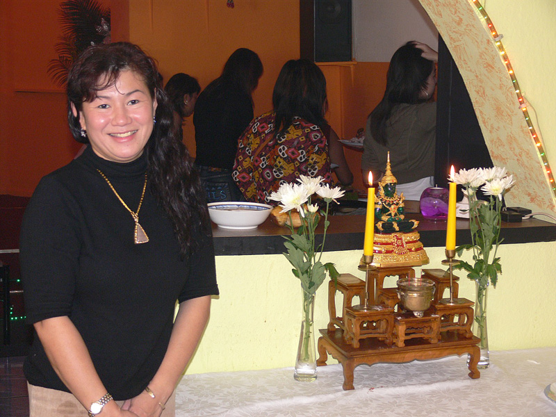 Betritt man das Thai-Restaurant, fällt zuerst die rechte Wand auf. Große Landschaftsmotive, golden eingefasst, mit dunklem Holz vertäfelt, schaffen ruhige Atmosphäre. Auf der linken Seite hängt ein schwerer Wandteppich. Das Motiv zeigt mittig ein Boot, umrahmt von vielen kleinen Elefanten. Daneben ist ein kleiner Raum, der heute als Buffet benutzt wurde. Im hinteren Teil befindet sich neben weiteren Tischen die halbrunde Bar. An Gästen wird es bestimmt nicht mangeln; denn erstens liegt das Thai-Elephant zentral und zweitens verwöhnt Köchin Pee Noi, die aus dem dazugehörigen Praya Thai mit hierher gezogen ist, die Gaumen der Gourmets. Davon konnte man sich beim Gratisessen überzeugen.
