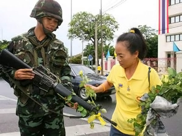 Vor einigen Monaten nun tat der König etwas sehr interessantes: auf sein Geheiß hin zeigten alle Thai-Fernsehsender den berühmten Video-Clip vom Jahr 1992, wo der König öffentlich den damaligen Premierminister und den damaligen Oberbefehlshaber der Armee tadelte, bezüglich der blutigen Zerschlagung der Studenten-Revolte. In diesem Clip krochen beide auf allen Vieren zum Königsthron. Sofort nach Ausstrahlung des Clips traten beide vom Amt zurück und die Unruhen waren beendet.