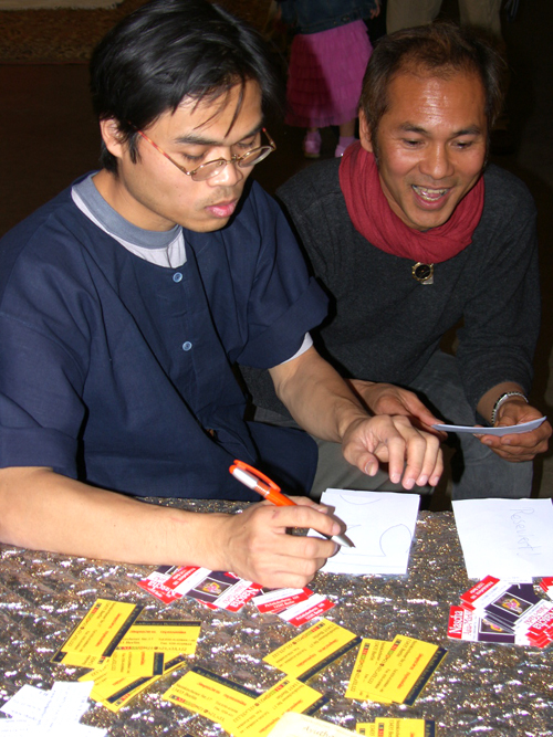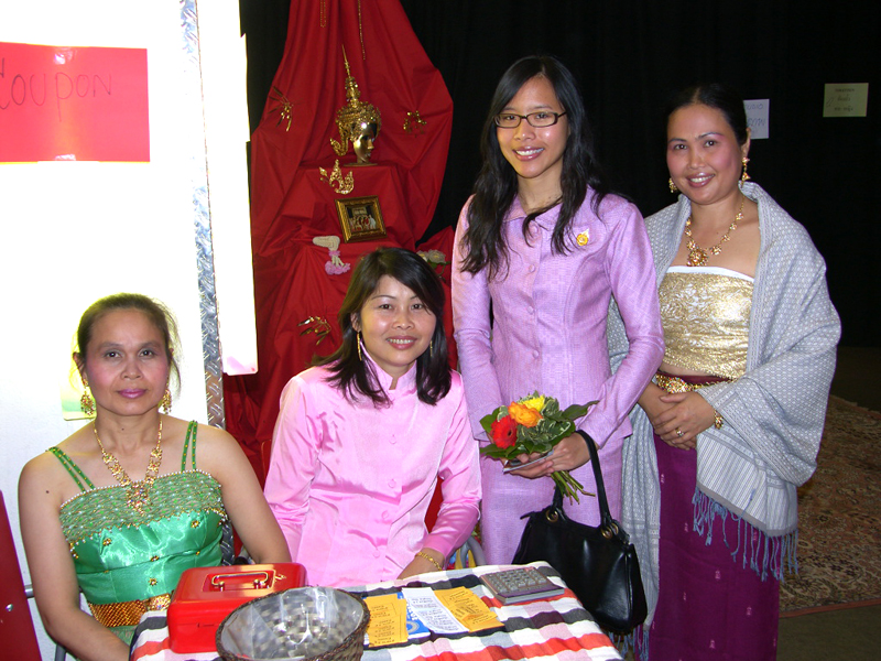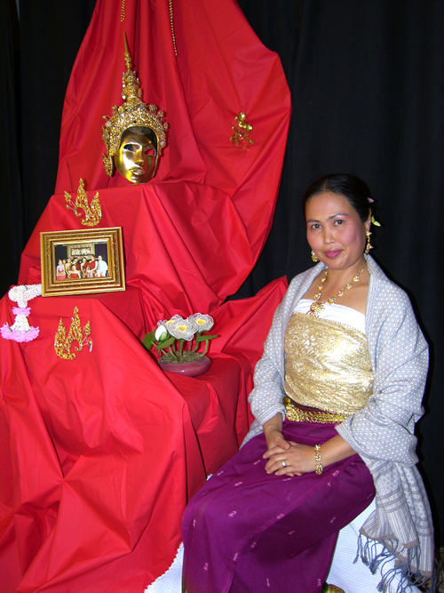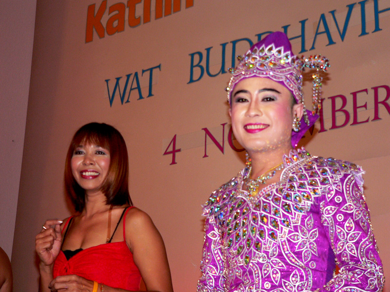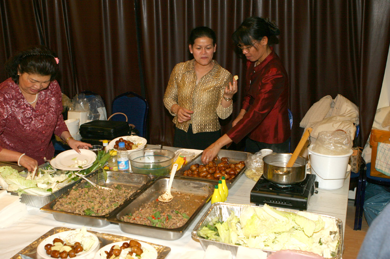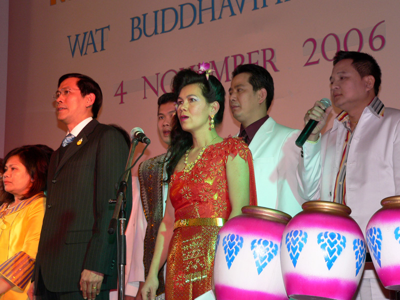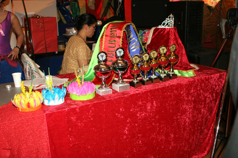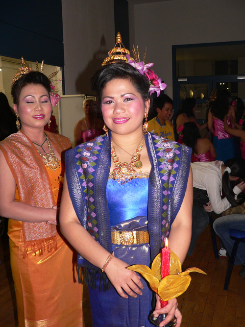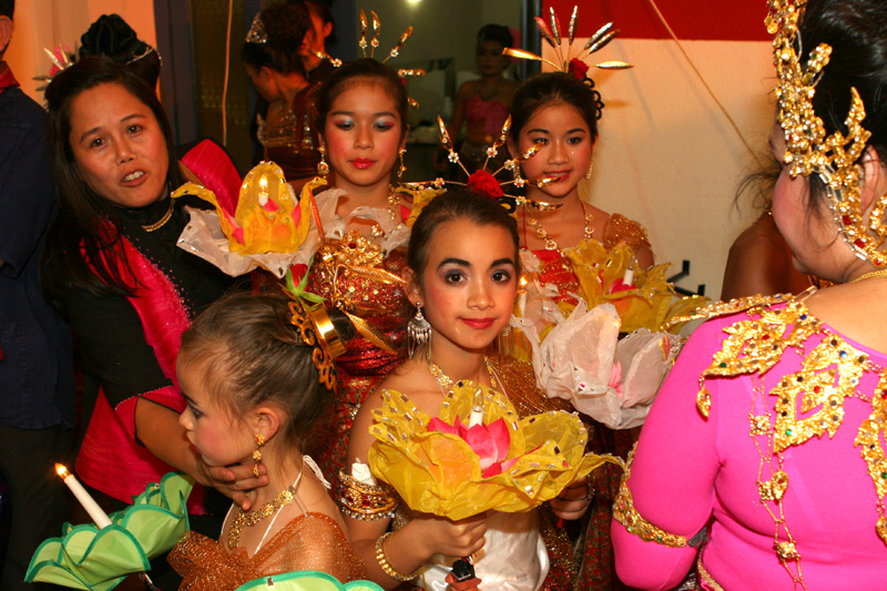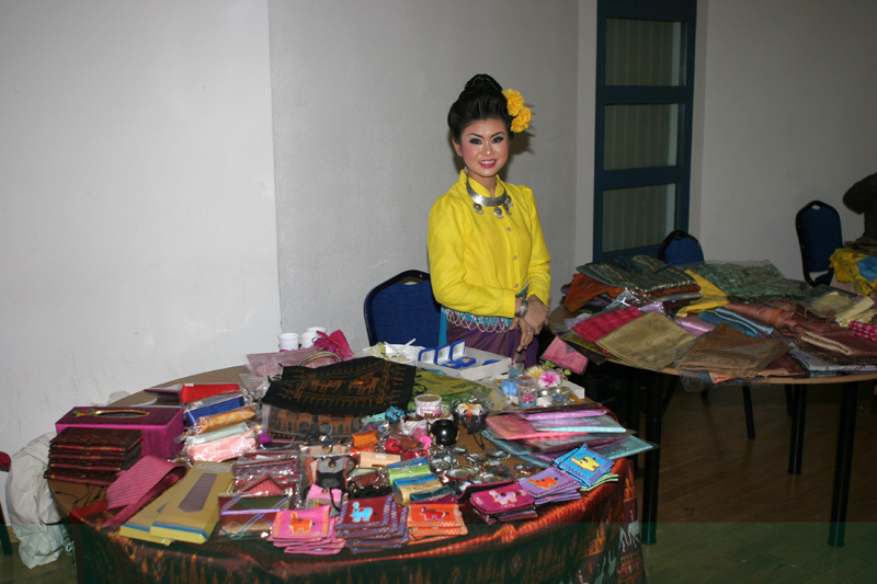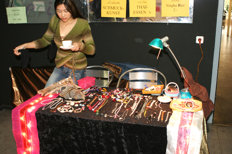 Draußen vor dem Festsaal waren im Foyer viele Stände aufgebaut. Da gab es Textilien, Thai-Seide, viele CDs, Kunsthandwerk, eine Live-Thaimassage und eben auch die Krathongs.