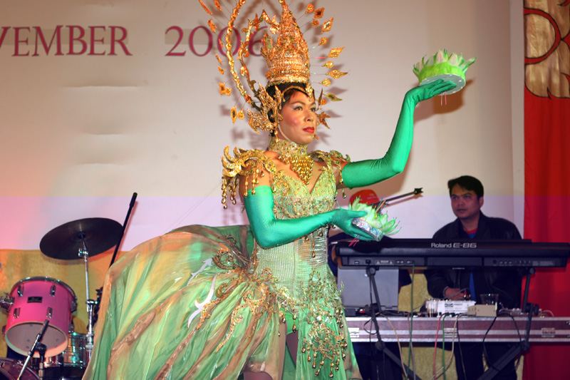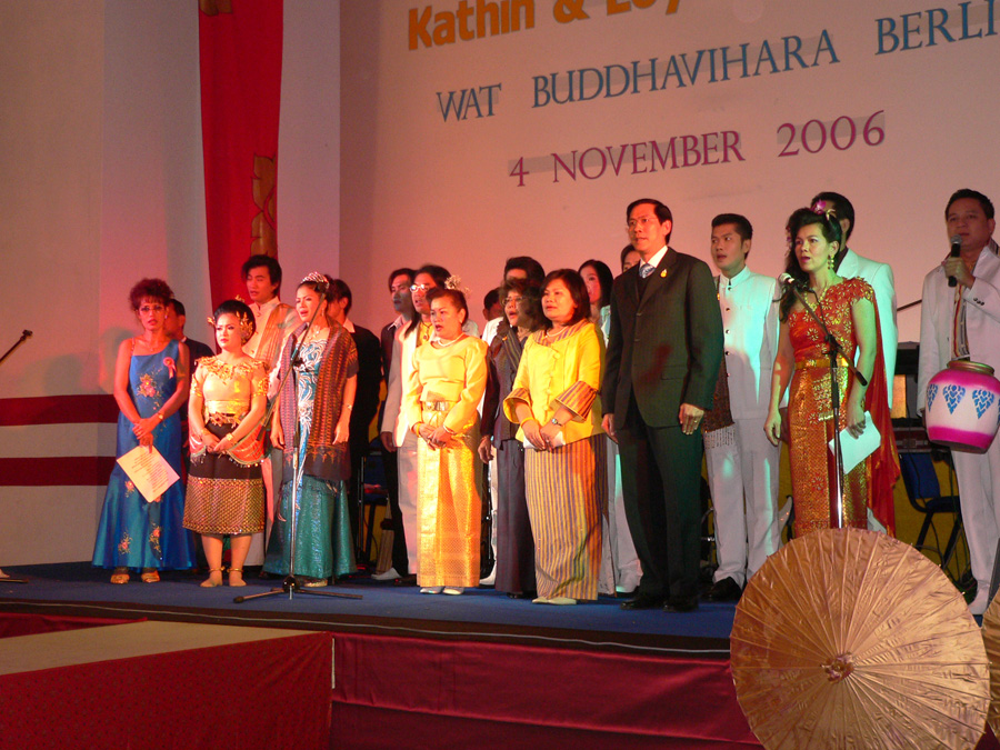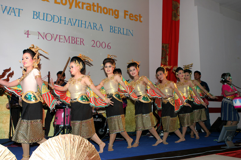 Die Zahl der Feiernden muss so um die 500 Menschen betragen haben. Vielleicht waren es auch noch mehr, die sich am 4. November im sogenannten Pankowpark im Norden Berlins eingefunden hatten, um ihr alljährliches Loy Krathong Fest zu feiern. Wie immer vormittags mit religiösen Zeremonien und kleinem Programm, und abends dann ein schönes gemeinames Fest mit allem, was dazu gehört: Mit Essen und Trinken, Miss-Wahl, Tanzen und Singen, eine Tombola sowie mit der großer Bühnenshow.