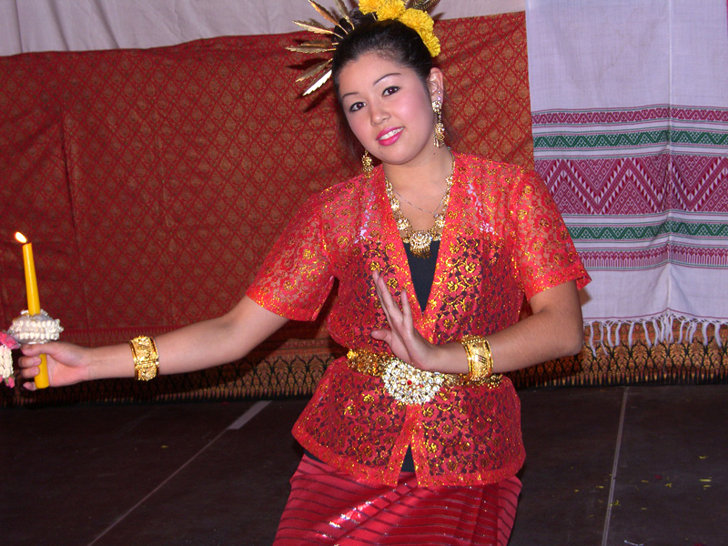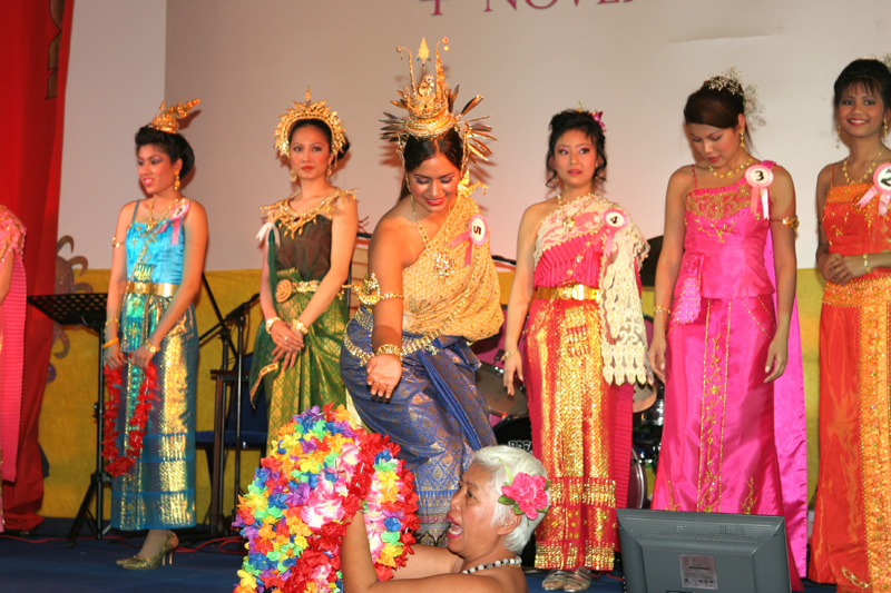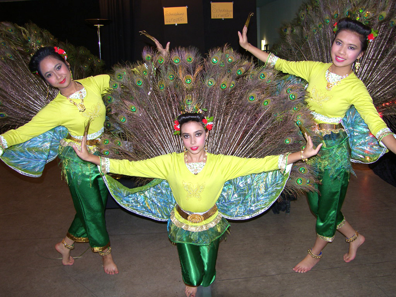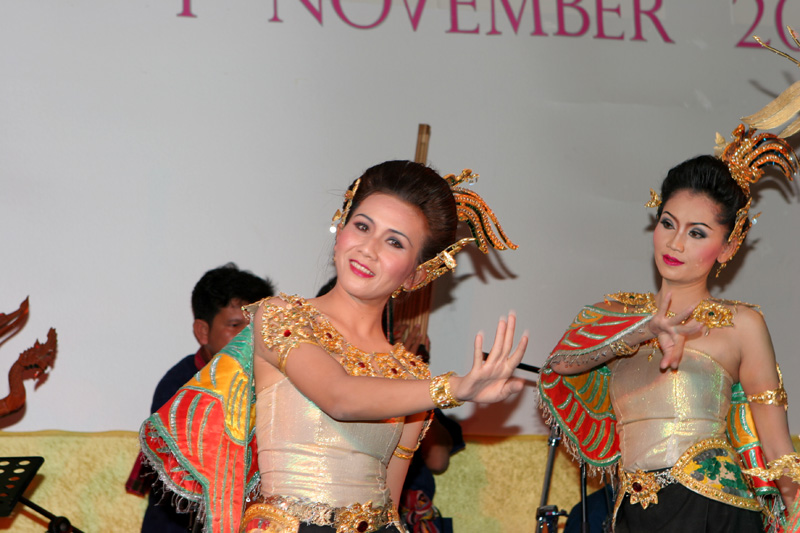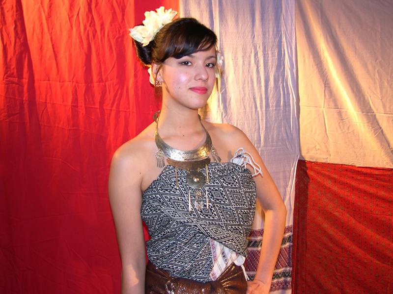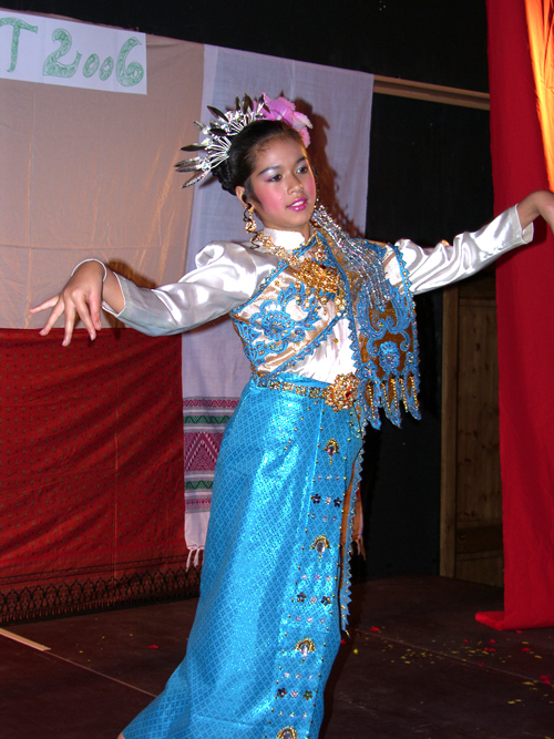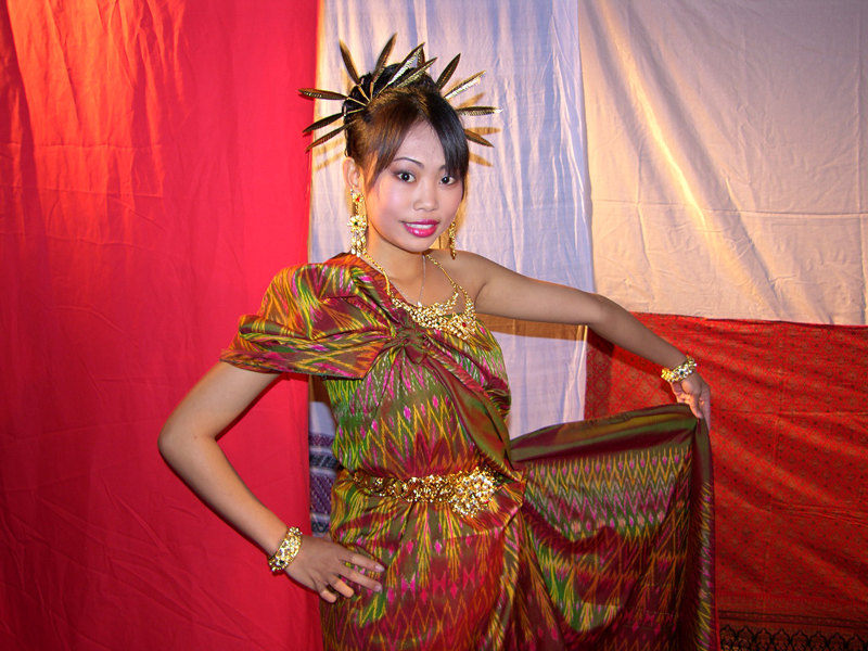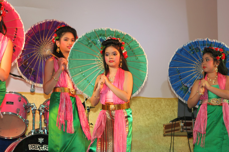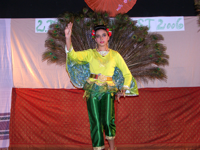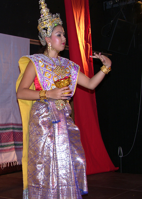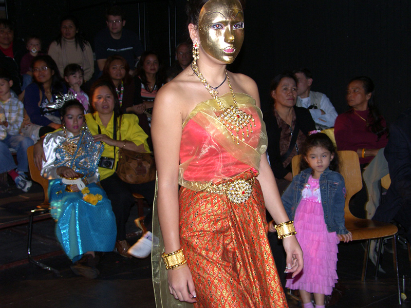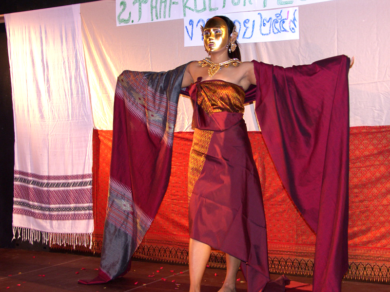 Nach dem Vortrag des Königsliedes (selbstverständlich standen alle auf) folgte die erste Darbietung: ein Tanz aus dem nördlichen Chiang Mai. Danach kamen die Jüngsten zum Zug. Darunter auch die dreijährige Lena, die schon mit dem Dress geboren zu sein scheint. Anschließend folgte ein aufgelockerter Tanz der Teens mit moderner Musik. Die anschließende Modenschau zeigte, dass man sich, oder besser, dass Frau sich mittels Bindetechnik hervorragend einkleiden kann, ohne den Schneider zu bemühen. Die dazu verwendeten Stoffe kommen hauptsächlich aus dem Isaan.