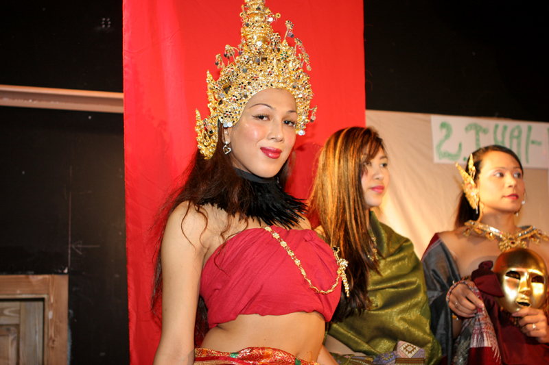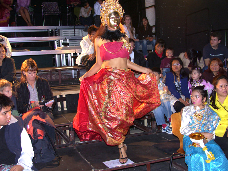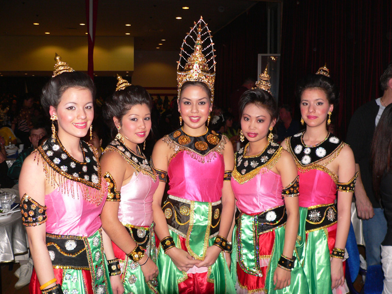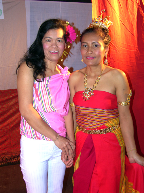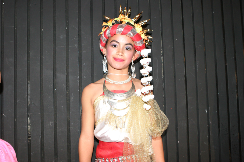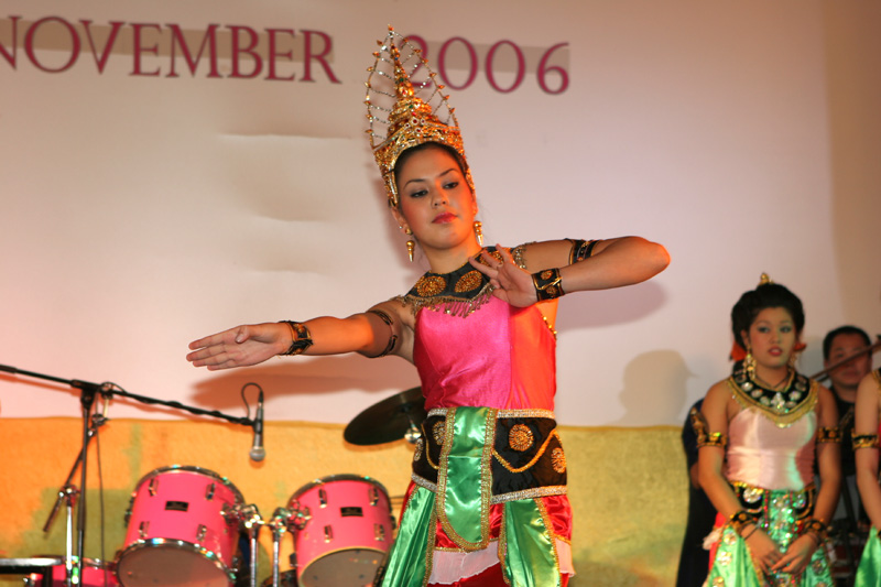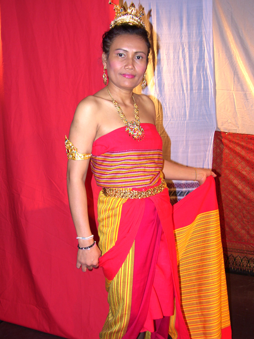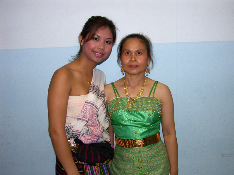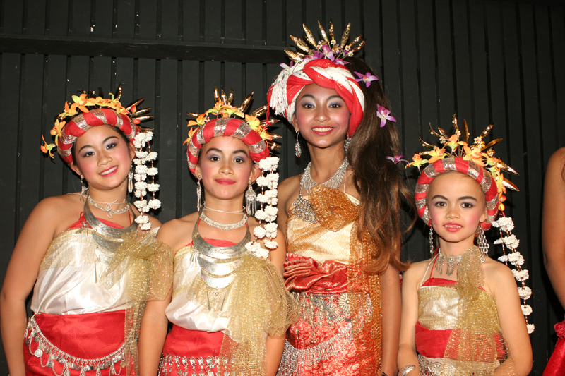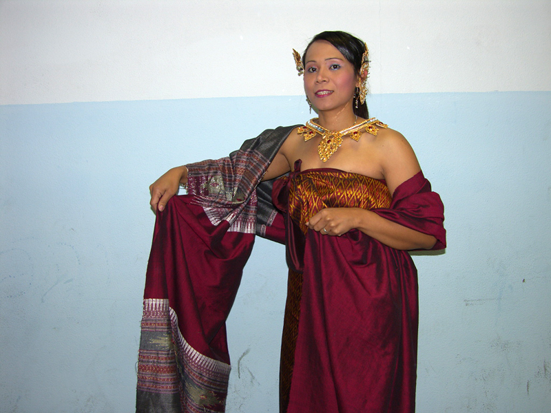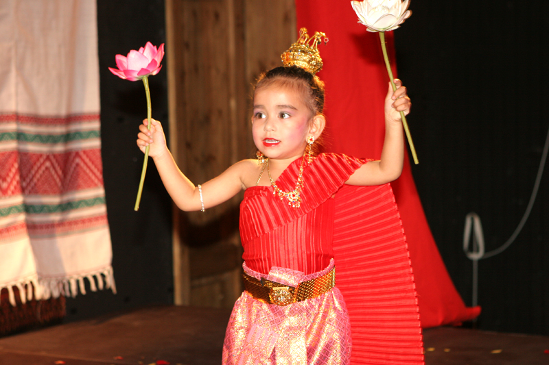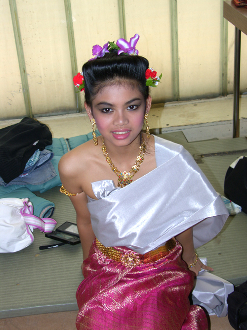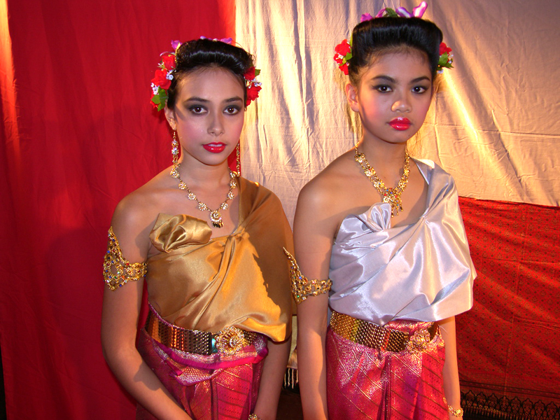 Nach dem Vortrag des Königsliedes (selbstverständlich standen alle auf) folgte die erste Darbietung: ein Tanz aus dem nördlichen Chiang Mai. Danach kamen die Jüngsten zum Zug. Darunter auch die dreijährige Lena, die schon mit dem Dress geboren zu sein scheint. Anschließend folgte ein aufgelockerter Tanz der Teens mit moderner Musik. Die anschließende Modenschau zeigte, dass man sich, oder besser, dass Frau sich mittels Bindetechnik hervorragend einkleiden kann, ohne den Schneider zu bemühen. Die dazu verwendeten Stoffe kommen hauptsächlich aus dem Isaan.