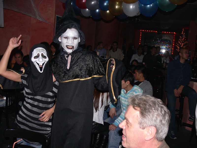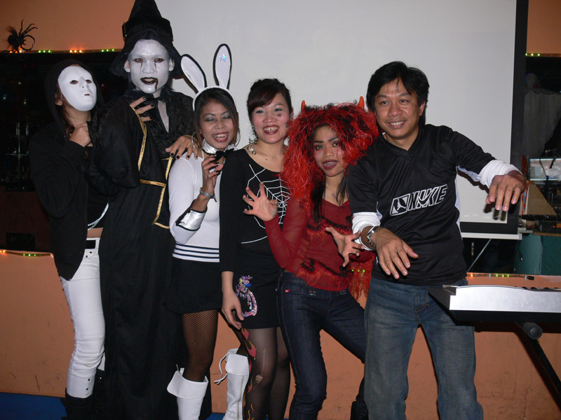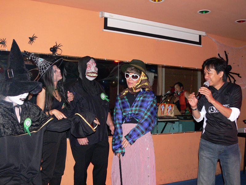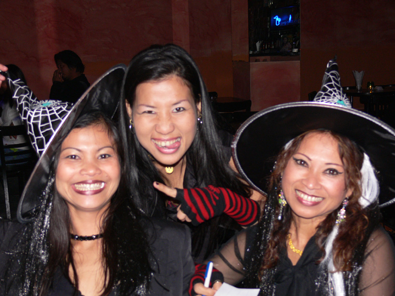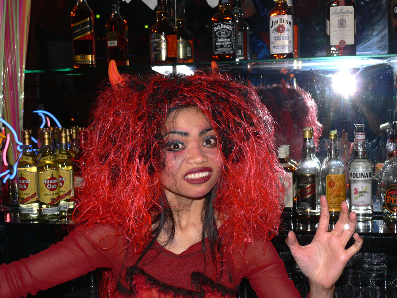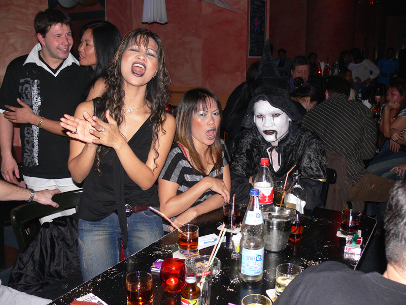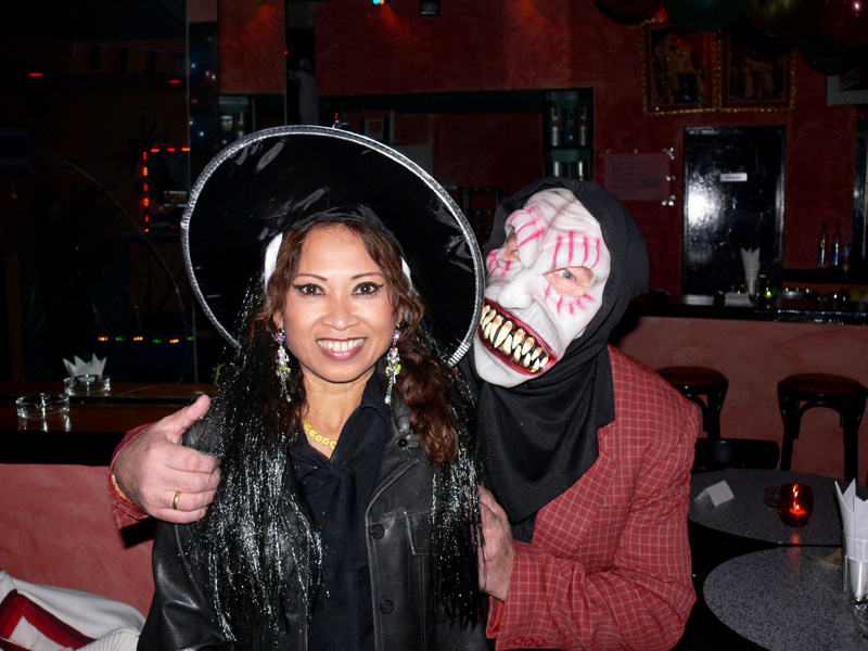 Bereits am 28. Oktober fand die schaurig schöne Halloween-Party in der STARS Disco statt. Bizarre Gestalten der Nacht, so manche Fee aus Harry Potter und andere Gestalten bevölkerten zur Gruselstunde die ausgeschmückte Szenerie. Prim war exzellentes rotes Teufelchen mit D-Jane Hanni, Toan war mal Mafia, mal Monster. Immer aber bei der Sache. Selbst die schon obligatorischen Sex-Sternchen für die Erotik-Show kamen in Maske und mit Lederpeitsche. Großes Hallo! Süße Namwahn (unser Titelmädchen) zauberte mit Sabina u.a. eine flotte Tanznummer. Das originellste Kostüm wurde auf der Bühne gewählt. Natürlich gab es auch wieder die 1-Baht Goldkette aus den Eintrittskarten. Die jubelnde Hübsche rechts hier hatte das goldene Glück auf ihrer Seite. Fazit: Thematische Partys sind top!