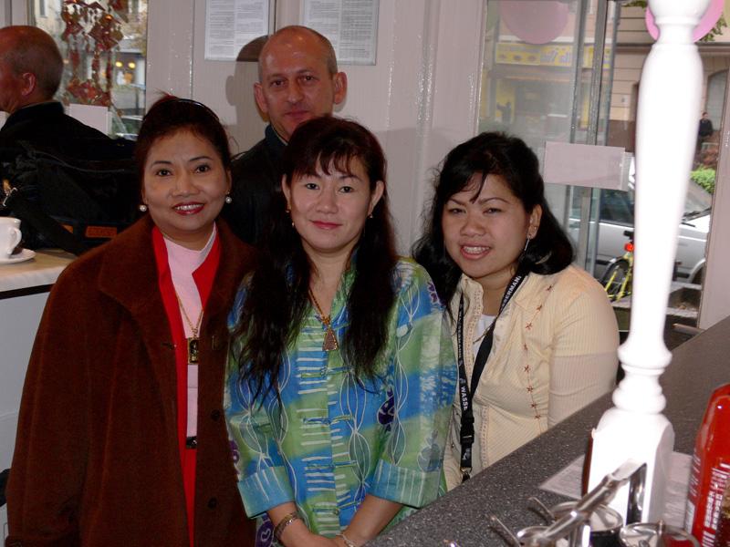 Die THAIGER Bar befindet sich in Berlin-Schöneberg in der Torgauer Straße, ganz dicht am neuen Verkehrsknoten Südkreuz. Betreiber sind Kwan & Ronald. Am 5. November wurde das Einjährige mit satter Live-Mucke (viel Santana) und Buffet gefeiert. Gekommen waren in der Stadt bekannte Namen: Lilly & Toi vom R.C.A., Tum & Ott (Thai Thek), Dia vom New Bangkok, auch Kek, Kanokwan und das Golden Bhudda Team. Schlag Mitternacht knallten die Sektkorken. Der Grund: Chefin Kwan hatte Geburtstag. Doppelter Grund für einen unterhaltsamen Abend für die anwesenden Chefs von Thai-Musik-Cafés in Berlin. Das war schon bei der Einweihung so. Viel Glück weiterhin, und Happy Birthday! Mathias Heinrich
