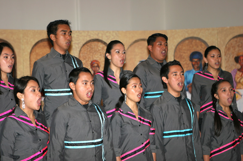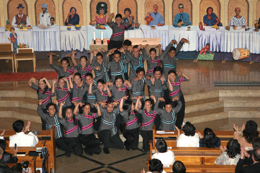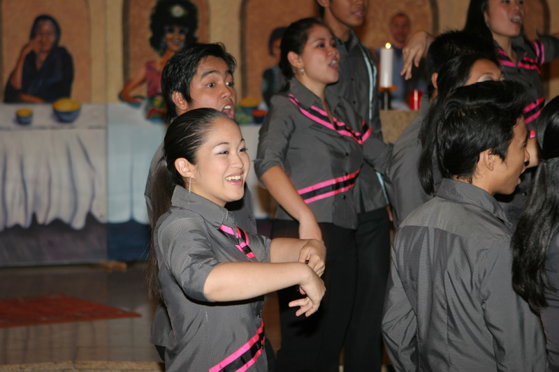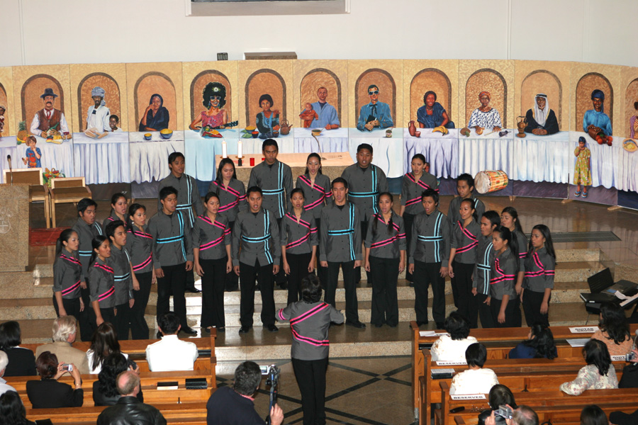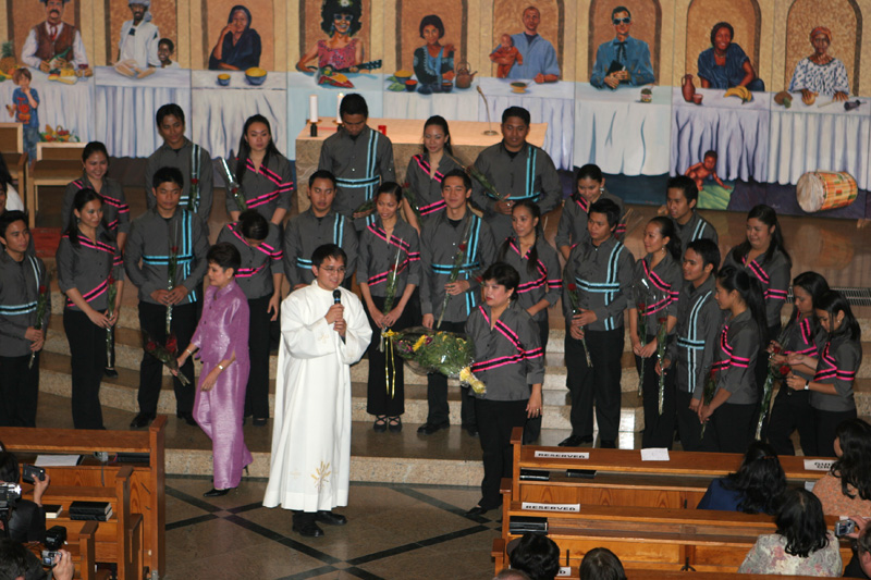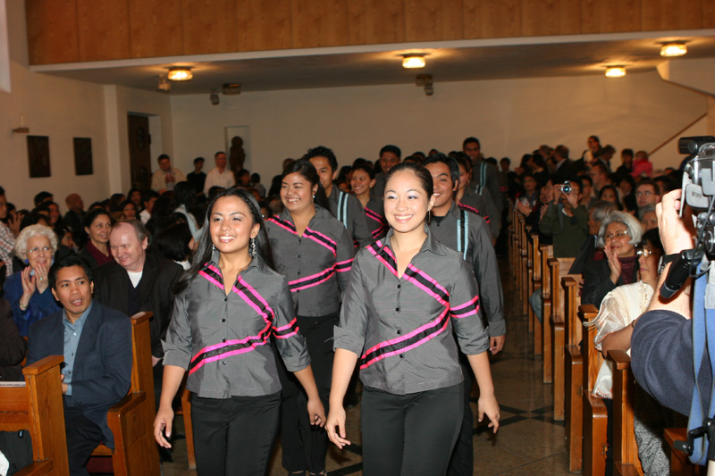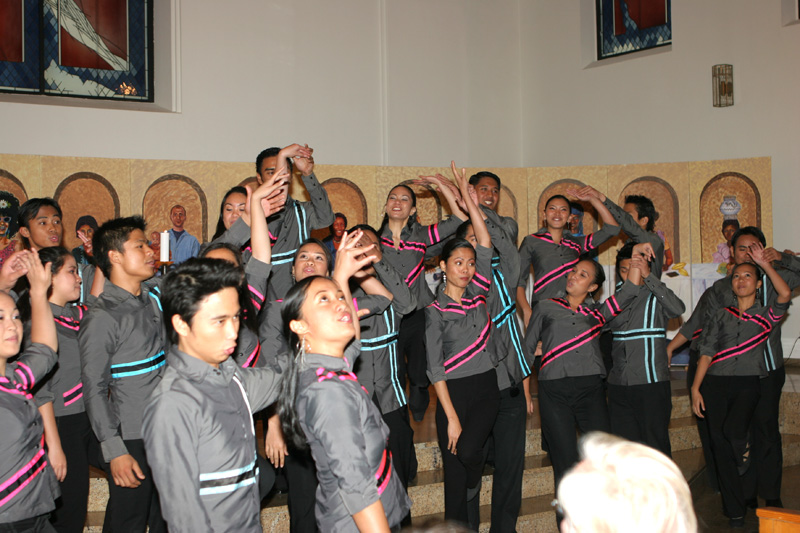 Nach Abschluss des religiösen Teils folgt der Einmarsch des Chores. Genauer gesagt, des University of the Philippines Concert Chores unter der Leitung von Pauline Barreiro. Er umfasst 28 Mitglieder, wurde 1962 gegründet und hat seit 1999 Auftritte auf der ganzen Welt. Gerade kehrte die Truppe von einer Tournee zurück, wobei Berlin die letzte Station ist. Zuerst werden Volkslieder gesungen. Ein Lied handelt von Kindern, die versuchen, Krebse zu fangen und feststellen, dass diese Angelegenheit gar nicht so einfach ist. Ein anderes handelt von dem schwierigen Transport von Gütern mit Pferd und Karre auf unbefestigten Straßen. Anschließend wurden die in eigener Weise gecoverten Songs von ABBA wie Fernando und Dancing Queen als Potpourri vorgetragen. Dazu eine super Performance. Diese Show war perfekt. Spätestens jetzt wurde jedem klar, warum dieser Chor auf lange Zeit ausgebucht ist. Verabschieden wollten sich die Sänger mit dem Song I believe I can fly.