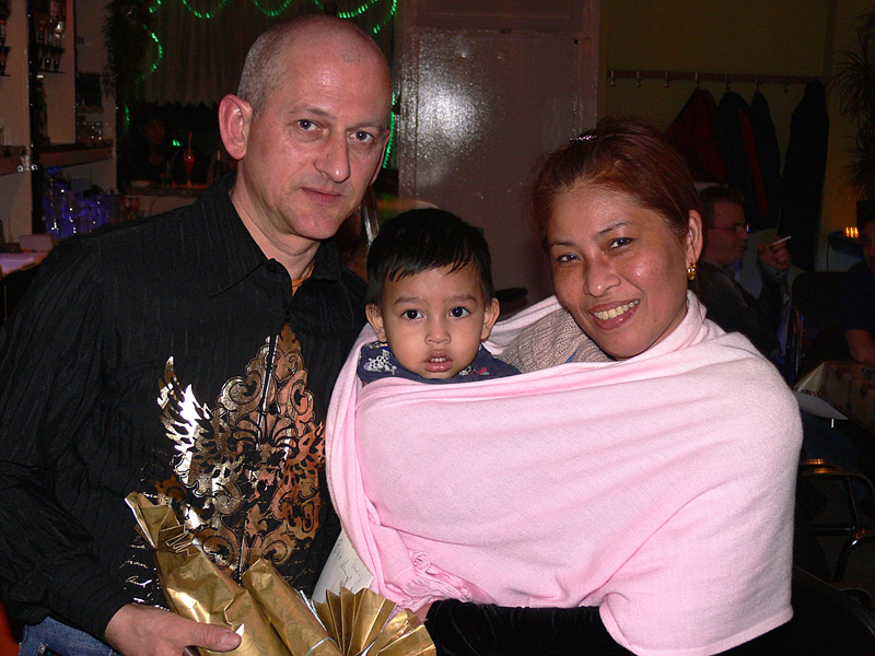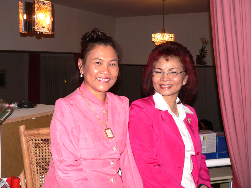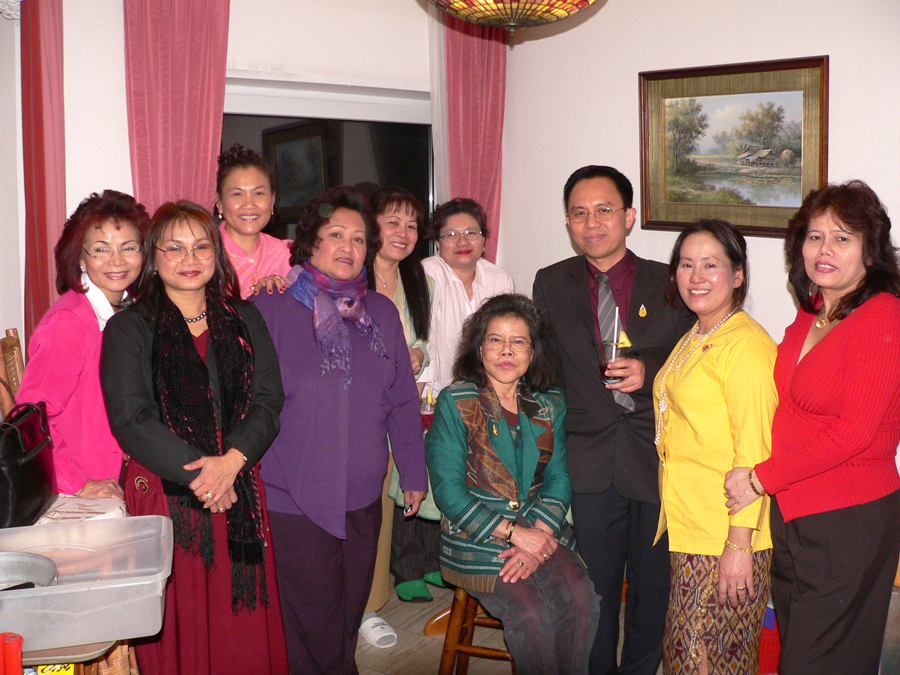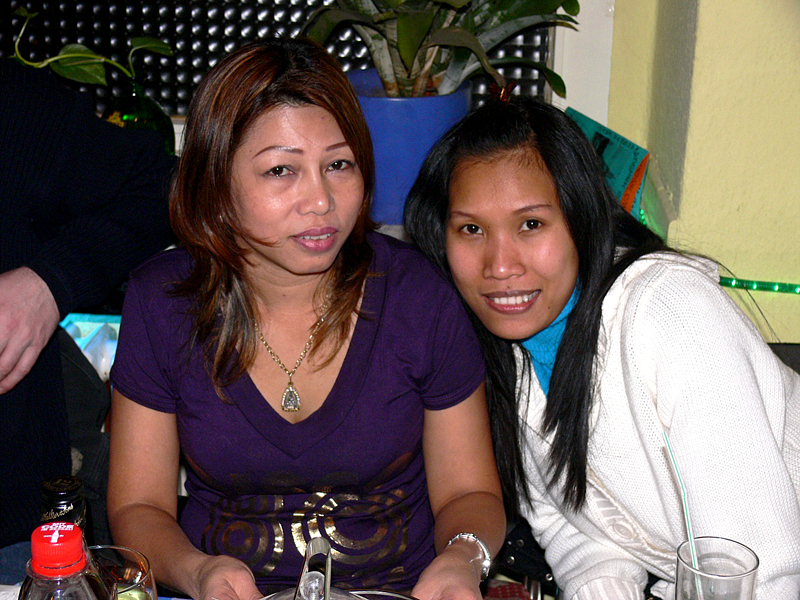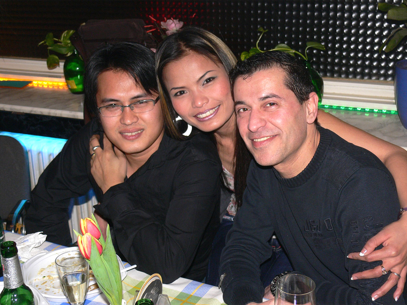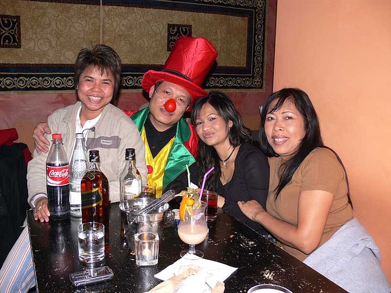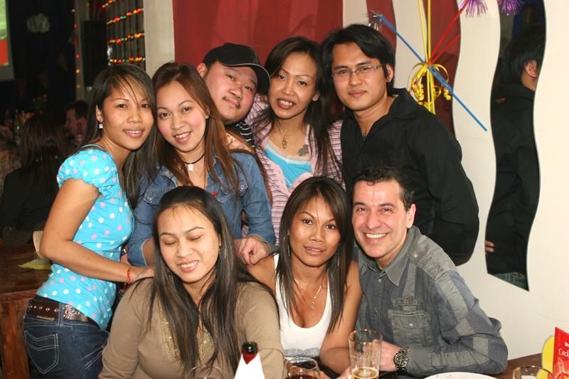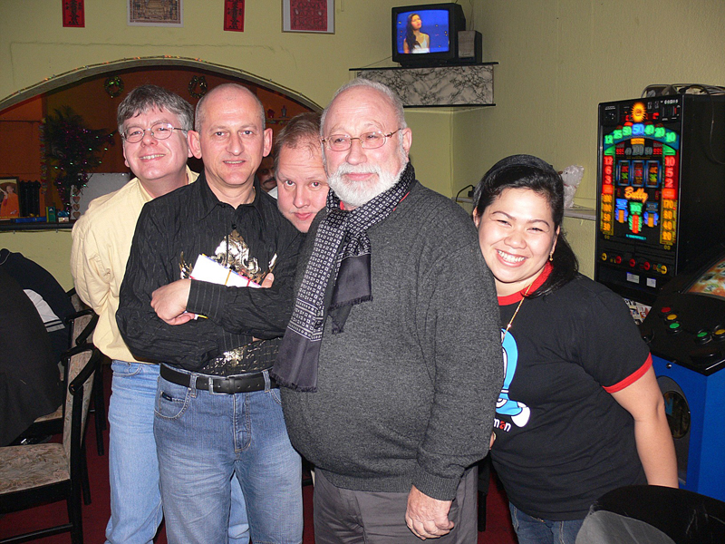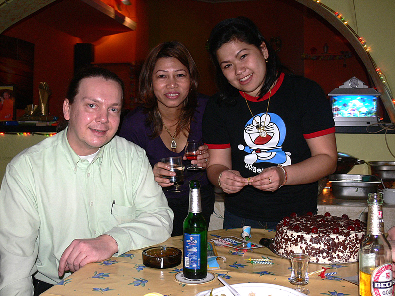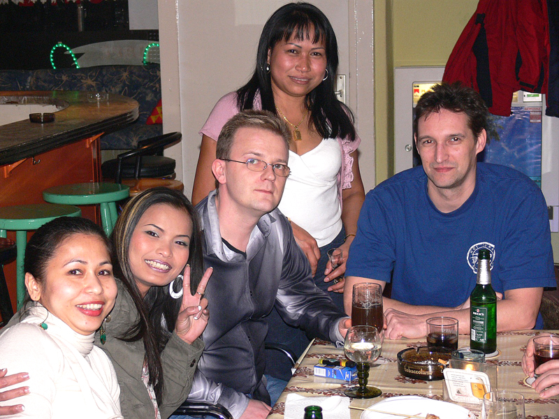 Der Herr in der Badehose, der sich kurz mit den Damen unterhält, ist also kein Essenteilnehmer. Ich kenne ihn seit 1995. Er lebt in Pattaya und gehört in diesem Hotel schon fast zum Inventar. Er holt immer nach dem Frühstück die Wurst ab, die die Farangs zurückgehen lassen, und füttert damit die Katzen. Er wird wohl auch den Personaleingang benutzt haben. Aber Ihr konntet auf dem Foto ja sehen, dass die Damen normal gekleidet waren für ein Frühstück bei 40 Grad Celsius im Winter.