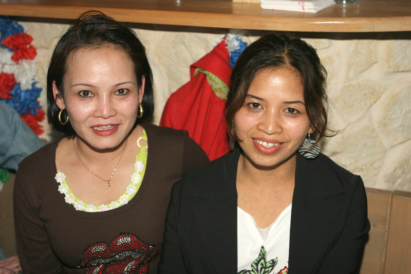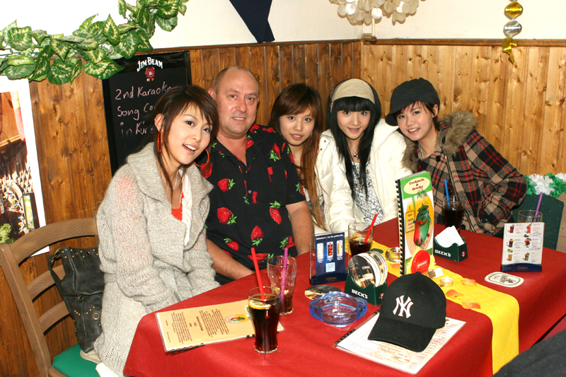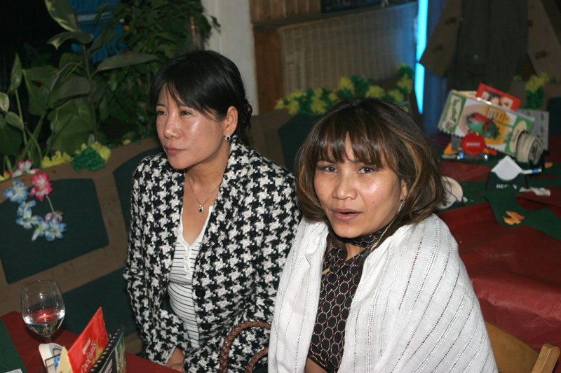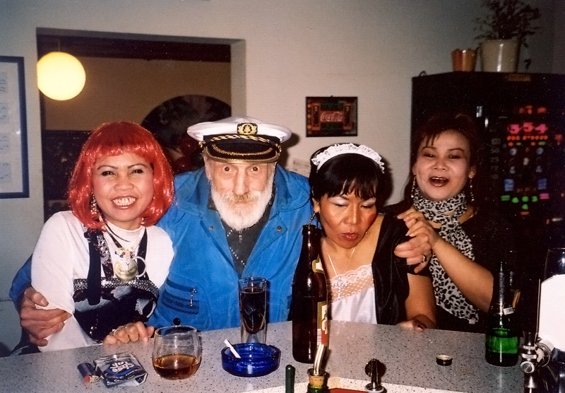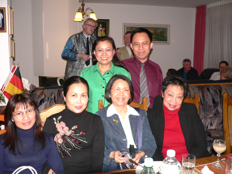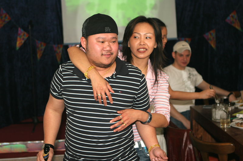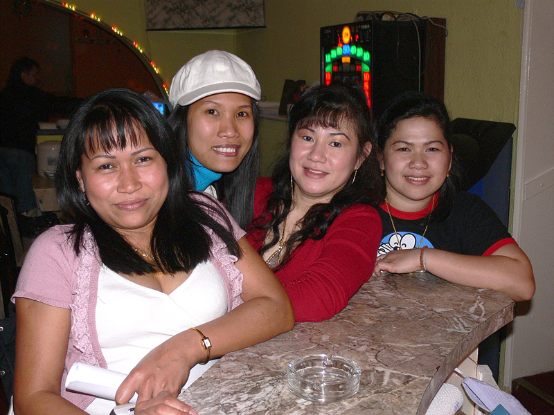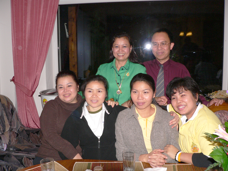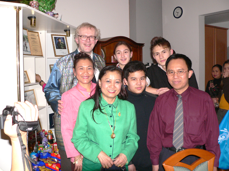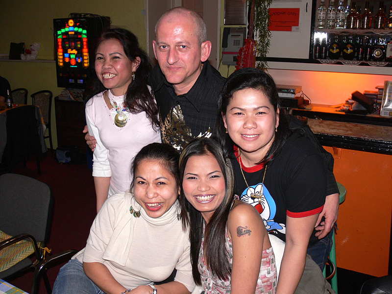Der Herr in der Badehose, der sich kurz mit den Damen unterhält, ist also kein Essenteilnehmer. Ich kenne ihn seit 1995. Er lebt in Pattaya und gehört in diesem Hotel schon fast zum Inventar. Er holt immer nach dem Frühstück die Wurst ab, die die Farangs zurückgehen lassen, und füttert damit die Katzen. Er wird wohl auch den Personaleingang benutzt haben. Aber Ihr konntet auf dem Foto ja sehen, dass die Damen normal gekleidet waren für ein Frühstück bei 40 Grad Celsius im Winter.