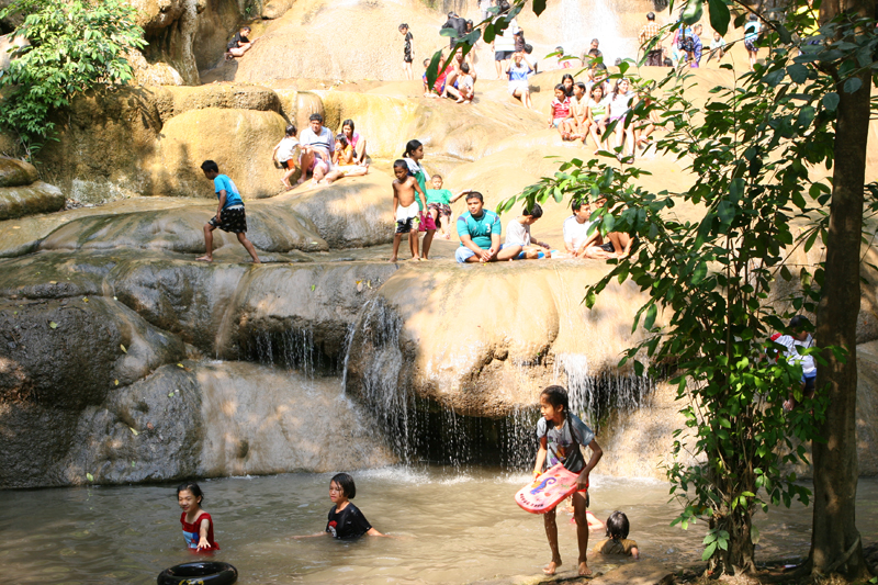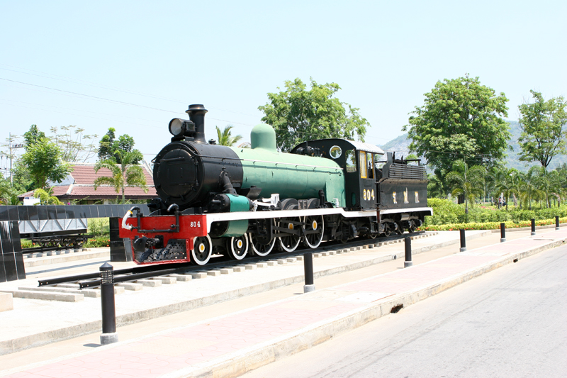 Die Region hat vier Nationalparks. Unser Besuch gilt dem südlichstem, dem Chaloem Rattanakosin Nationalpark. Im südwestlichem Teil befindet sich einer der schönsten Wasserfälle. Angezogen vom kühlem Nass planschen die Kinder im entstandenen flachen Wasserbecken. Etwa 300 Meter weiter rechts steht die Lok mit der Nummer 702 - der Anfang der noch übriggebliebenen berüchtigten Eisenbahnlinie über den Kwai.
