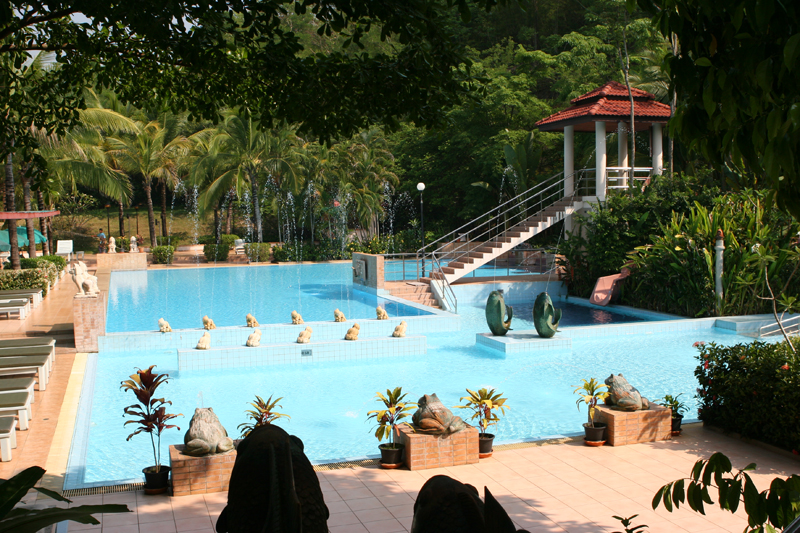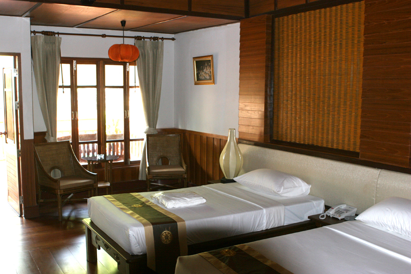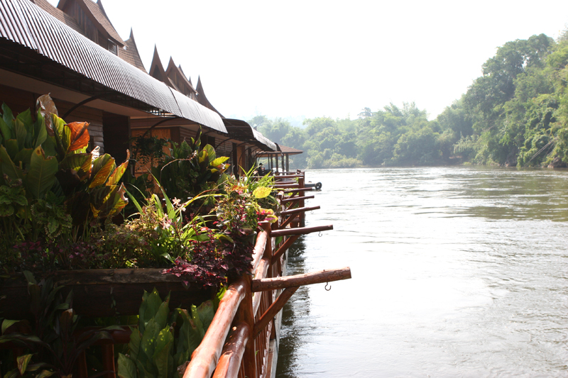 Vom Hotel wühlt sich die Taxe dank gesperrter Straßen ewige Zeiten durch den ewigen Dauerstau bis zur 338. Weiter auf dem Highway No. 4. Höhe Ban Pong ändert sich die Richtung nach Nord-Ost. Der Asphalt erhält jetzt die Nummer 323. In Kanchanaburi hört die Schnellstraße auf. Noch rund 70 Km bis Sai Yok, dem 1. Etappenziel, dem River Kwai Village Hotel. Die Anlage, auch liebevoll Dschungelresort genannt, ist das erste Hotel in der Region. Es fügt sich so fantastisch in die Landschaft ein, dass man denken kann, die einzelnen Häusertracks sind mit der Natur aufgewachsen. Die weitläufige, großzügige Anlage besteht aus mehreren Blocks. Insgesamt 191 Zimmer. Die Preise liegen zwischen 1.900 und 3.000 BHT. Alle Zimmer sind sehr gepflegt und bieten einen kleinen Hauch von Luxus. Funkelnagelneu sind die Bungalows, die direkt auf dem Fluß fest verankert wurden. Die Einrichtung ist typisch Thai. Der riesige Pool lädt jede Wasserratte zum ausgiebigen Baden ein. Für Kinder ist eine entsprechende Badezone eingerichtet. Ein kleiner Wasserfall plätschert vor sich hin und möchte beachtet werden. Ein kleinerer Pool (aber immer noch groß genug) befindet sich inmitten der Anlage. Er ist nur für Schwimmer geeignet. Das Frühstücksbuffet nehmen die Gäste auf der Terrasse am Haupthaus ein. In der Saison wird abends ein Lagerfeuer angezündelt. Das B.B. dazu ist obligatorisch. Ausflüge von 1 - 3 Tagen werden angeboten. Rafting und Elefantentouren dürfen an dieser Stelle nicht fehlen.