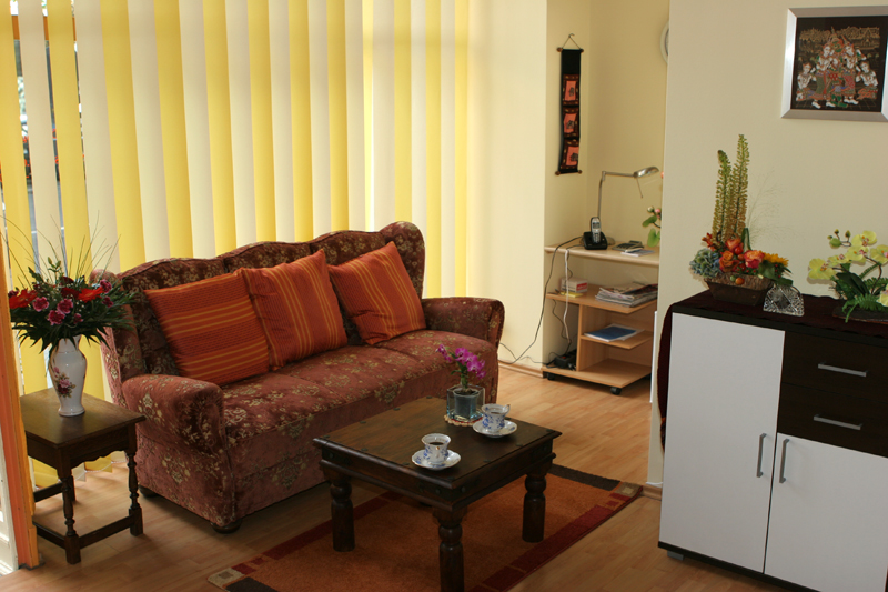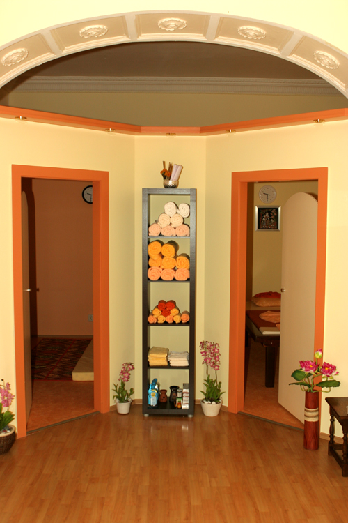 In der Schöneberger Motzstraße (Ecke Ansbacher) wurden sie fündig. Der übersichtliche Laden mit der Hausnummer 65 war früher ein Kosmetiksalon. Ein ideales Objekt, zumal ein Umbau nicht erforderlich war. Nur Decke und Wände bedurften eines neuen Anstrichs. Der Vorraum ist mit vielen Blumen geschmückt. Auf dem gemütlichen Sofa wird dem Kunden gerne Kaffee oder Tee serviert, bevor er sich zur entspannenden Massage begibt. Linker Hand ist eine kleine geschlossene Küche, dahinter der erste Raum mit einer Massageliege. Die Fensterbänke dienen als Ablage für mehrere Blumentöpfe. Rechts ziert ein großer Torbogen die Eingänge zu zwei weiteren Räumen. Alle Farben sind in angenehm warmen Tönen gehalten.