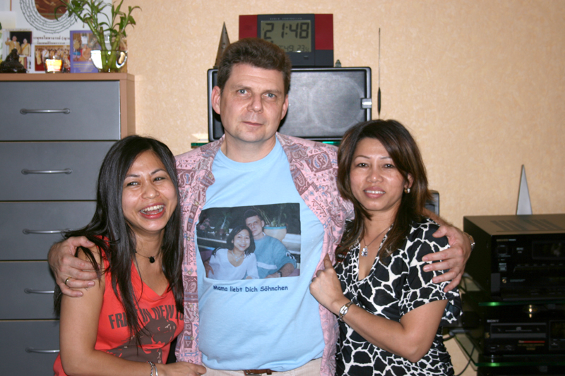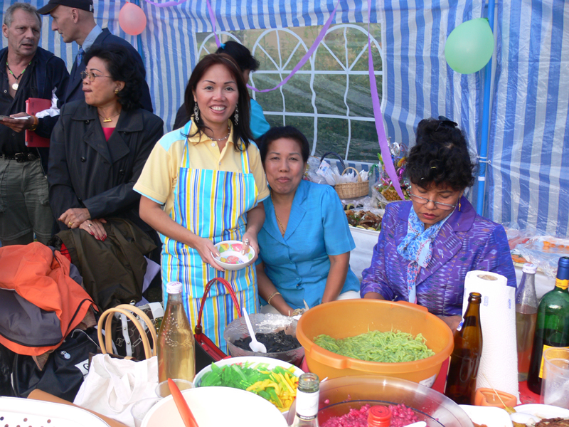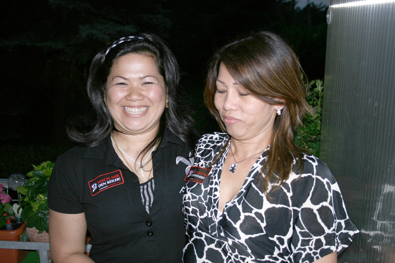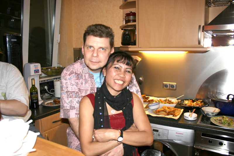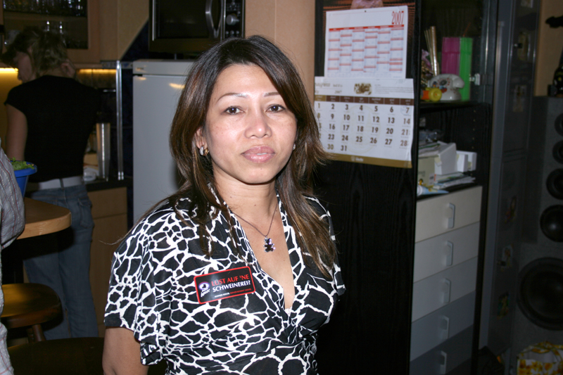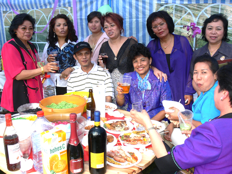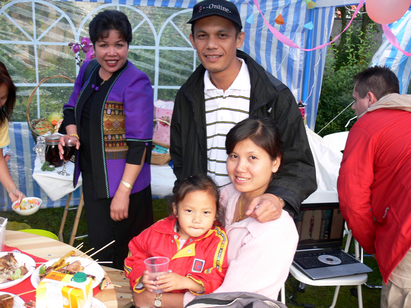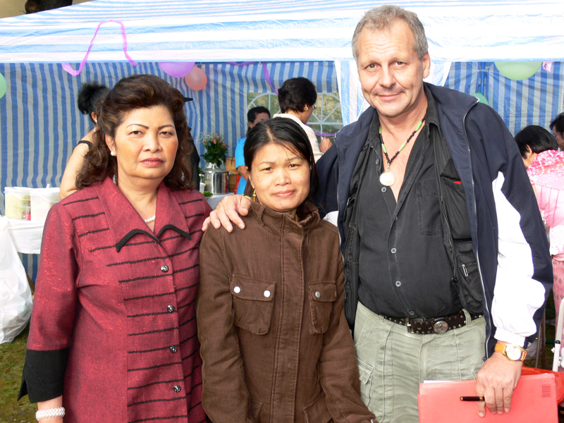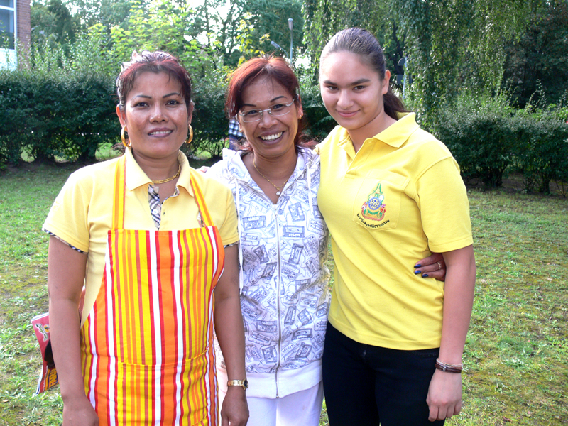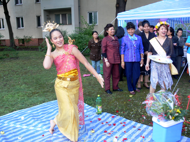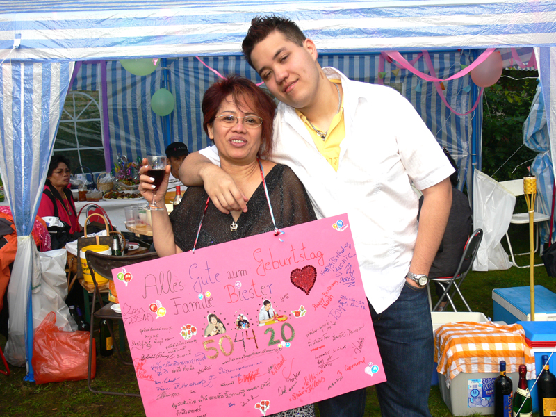 Peng ist eine liebenswerte Thaifrau, die schon lange glücklich mit der Familie in Berlin lebt. Da sind Ehemann Christian (44), Sohn Benny (20) und Tochter Jenti (17), beide in Deutschland geboren. Seit 21 Jahren arbeitet Peng unermüdlich in der Schokoladenfabrik Storck. Zu ihrem 50. am 7. Juli hatte sie sich Freunde und Bekannte zu einer riesigen Gartenparty in Tegel eingeladen. Es war ein Bierzelt aufgebaut, sowie ein großer Grill. Dazu kam noch das umfangreiche Buffet. Laufend wurden die leckersten Grillsachen aufgetischt, ob Garnelen, Tintenfisch, oder Fleischspieße. Das Buffet war auch nicht ohne, diverse Salate gab es, darunter Som Tam, für jeden Geschmack was dabei, selbst Klebereis fehlte nicht. Auch für Farangs gab es Gaumenfreuden, z.B. Nudelsalat, Tomate mit Morzarella. Ich kann gar nicht alles aufzählen, soooo viel und lecker! Dann all die vielen Getränke, mit und ohne Alkohol, na klar, Mekong war auch dabei. Und erst die Kinder, die hatten einen Spaß. Allerlei Spiele wurden gespielt. Dazu die typische Thaimusik, die Gäste lachten und tanzten. Michaelas große Tochter zeigte einen grazilen Thai-Tanz. Und zwischendurch immer wieder was Frisches vom Grill oder vom Buffet - und mittenmang eine strahlende Peng. Das war ihr Tag!