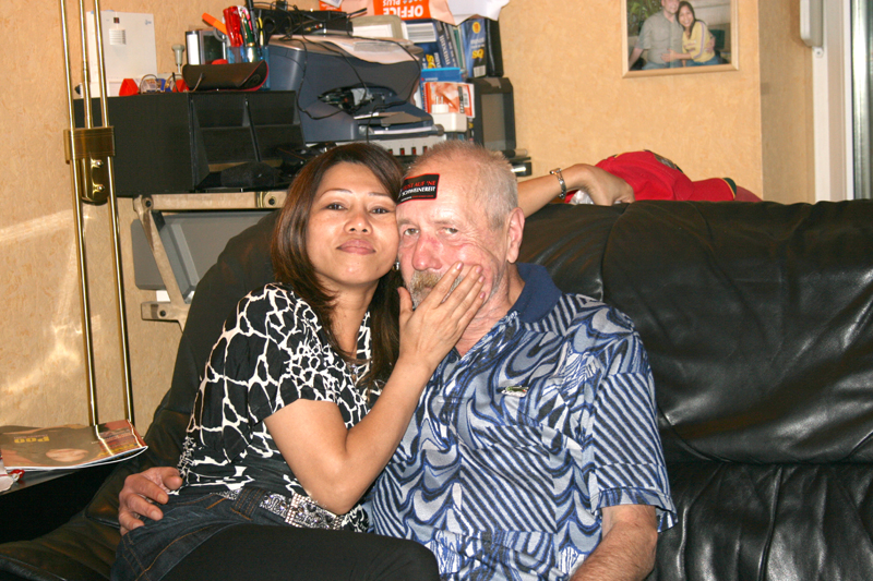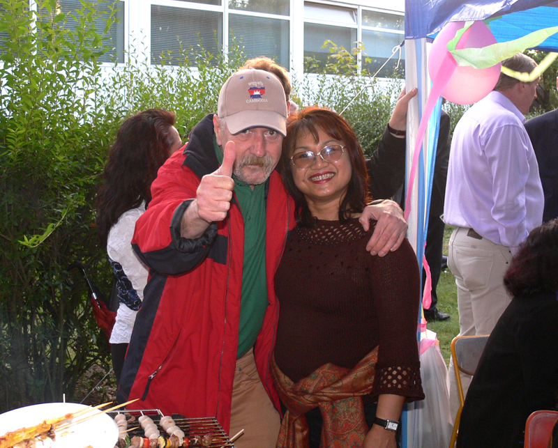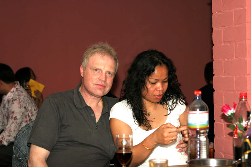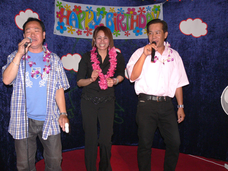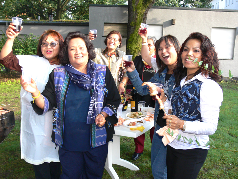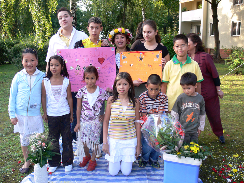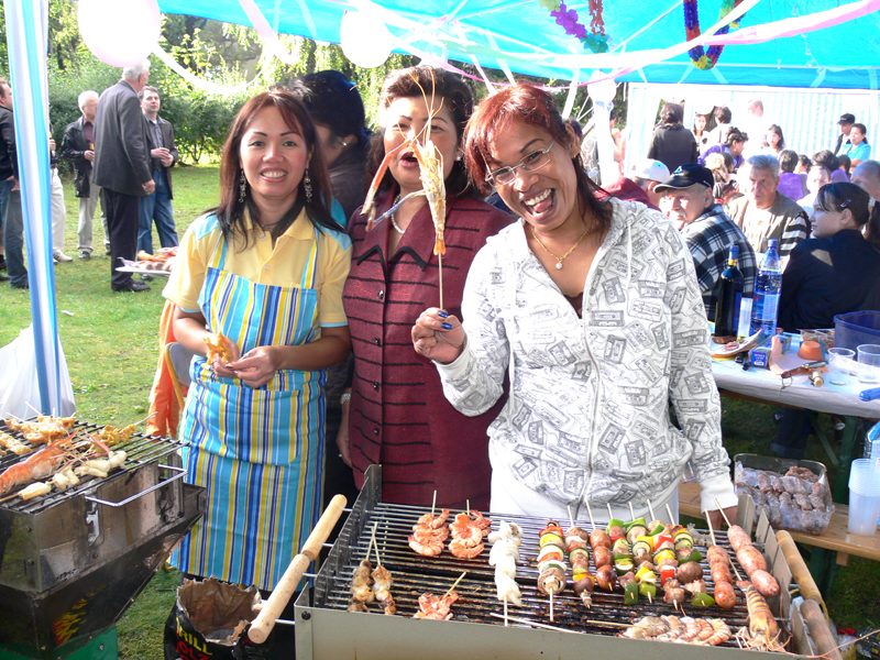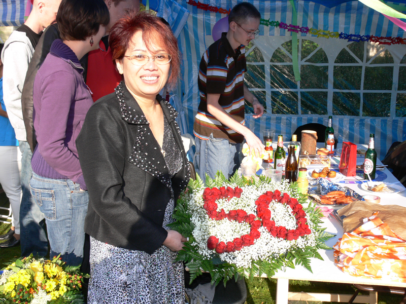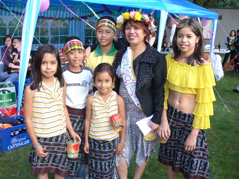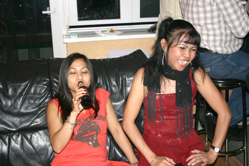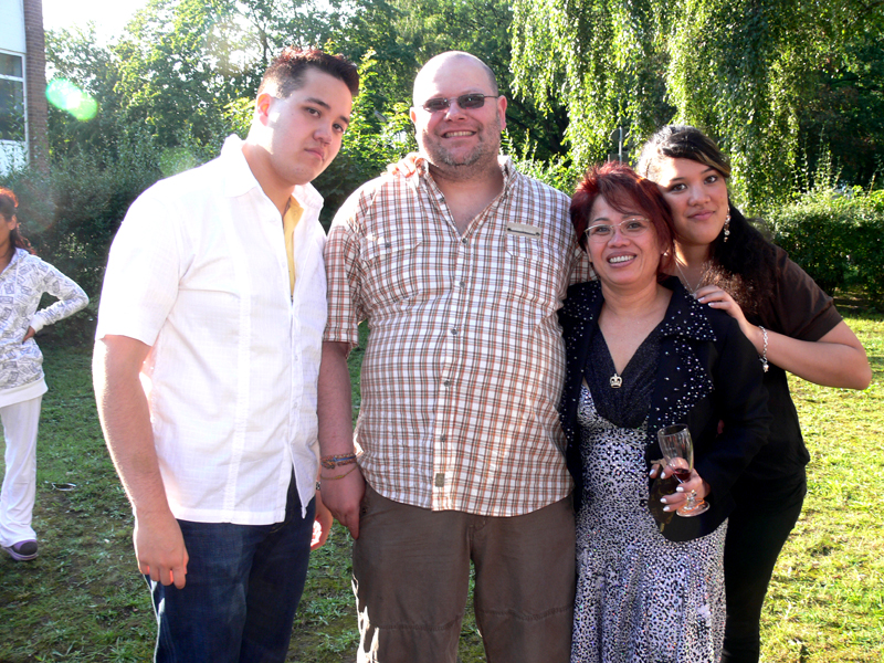 Peng ist eine liebenswerte Thaifrau, die schon lange glücklich mit der Familie in Berlin lebt. Da sind Ehemann Christian (44), Sohn Benny (20) und Tochter Jenti (17), beide in Deutschland geboren. Seit 21 Jahren arbeitet Peng unermüdlich in der Schokoladenfabrik Storck. Zu ihrem 50. am 7. Juli hatte sie sich Freunde und Bekannte zu einer riesigen Gartenparty in Tegel eingeladen. Es war ein Bierzelt aufgebaut, sowie ein großer Grill. Dazu kam noch das umfangreiche Buffet. Laufend wurden die leckersten Grillsachen aufgetischt, ob Garnelen, Tintenfisch, oder Fleischspieße. Das Buffet war auch nicht ohne, diverse Salate gab es, darunter Som Tam, für jeden Geschmack was dabei, selbst Klebereis fehlte nicht. Auch für Farangs gab es Gaumenfreuden, z.B. Nudelsalat, Tomate mit Morzarella. Ich kann gar nicht alles aufzählen, soooo viel und lecker! Dann all die vielen Getränke, mit und ohne Alkohol, na klar, Mekong war auch dabei. Und erst die Kinder, die hatten einen Spaß. Allerlei Spiele wurden gespielt. Dazu die typische Thaimusik, die Gäste lachten und tanzten. Michaelas große Tochter zeigte einen grazilen Thai-Tanz. Und zwischendurch immer wieder was Frisches vom Grill oder vom Buffet - und mittenmang eine strahlende Peng. Das war ihr Tag!