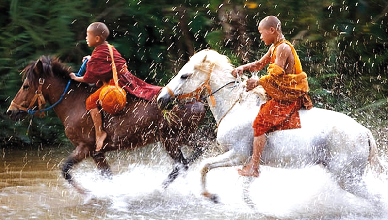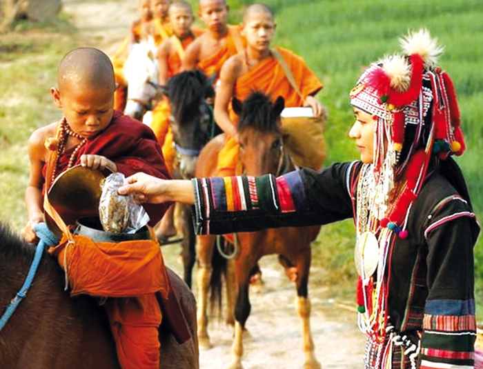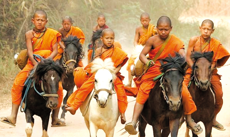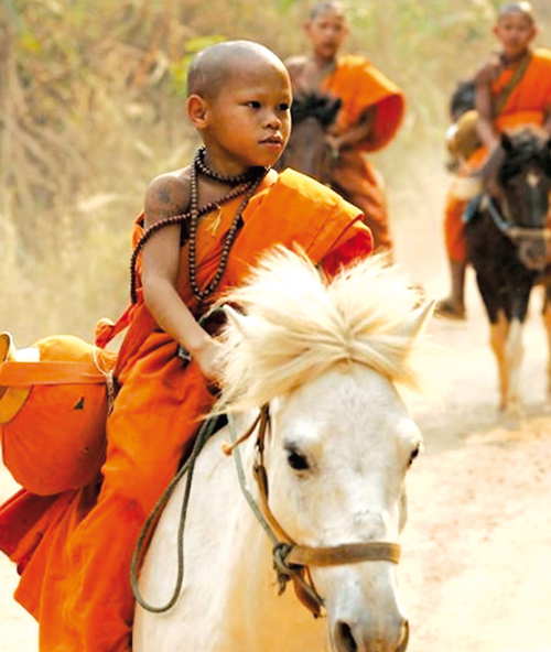 Zeuge eines Almosenganges ganz anderer Art kann man im hohen Norden Thailands in der Provinz Chiang Rai werden. Die bergige Dschungel-Region ist von den Bergvölkern besiedelt, deren Dörfer manchmal Hunderte von Kilometern auseinander liegen. Hier, in der Abgeschiedenheit der Wildnis, im Verwaltungsbezirk Mae Chan, liegt der Tempel Wat Phra Archa Thong (Golden Horse Temple). Um die großen Entfernungen zu überbrücken, bedienen sich Mönche und Novizen der Tiere - auf deren Rücken sprichwörtlich das Glück dieser Erde liegt - der Pferde. Mehr als 100 Tiere befinden sich im Besitz der Mönche, die sie als Fortbewegungsmittel im Grenzgebiet zu Myanmar (früher Burma) nutzen, um auch die entlegensten Dörfer aufsuchen zu können. Sei es für den täglichen Almosengang (sollte man besser Almosenritt sagen?) oder aus einem anderen Grund. Denn ein großes Verdienst der Mönche ist die Hilfe bei der Resozialisierung von Drogenabhängigen in einem Gebiet, welches jahrzehntelang Zentrum des Opium- und Heroinhandels war. Ihnen ist es zu verdanken, dass die Menschen in diesem Teil Thailands auch in Zukunft gute Taten und Verdienste tun können, welche im nächsten Leben angerechnet werden - den reitenden Mönchen von Mae Chan. Carsten Naß