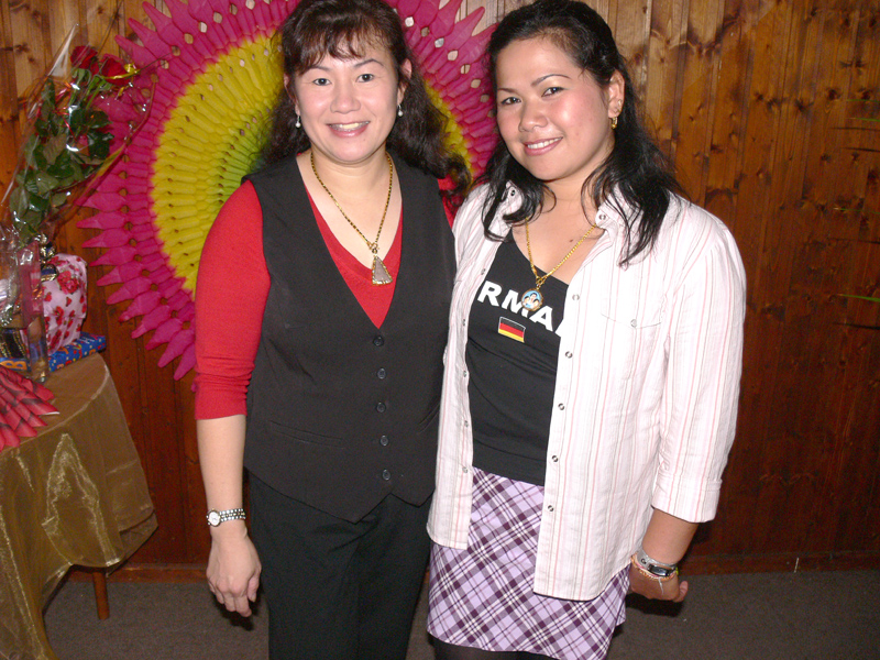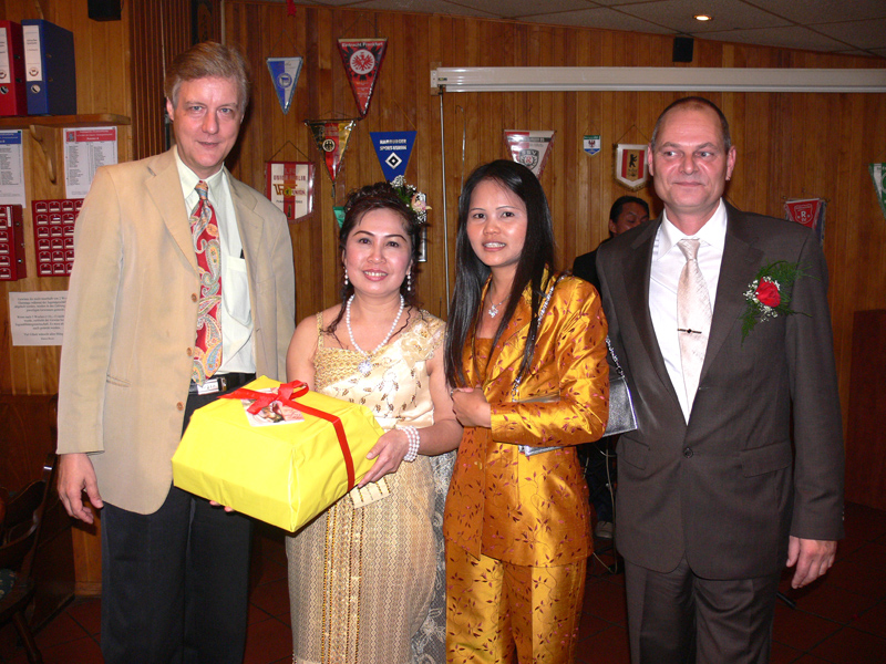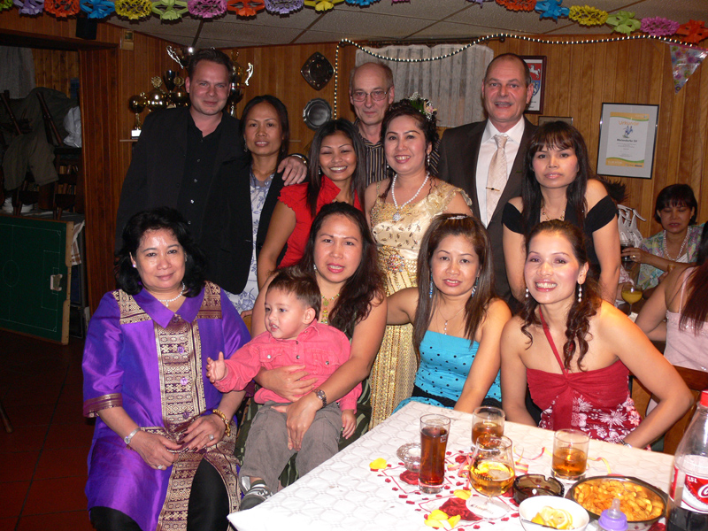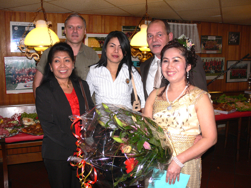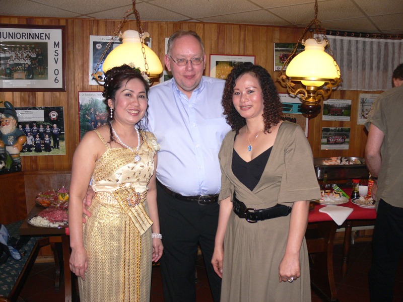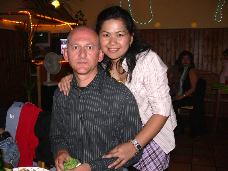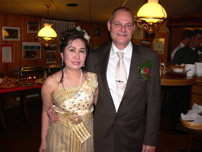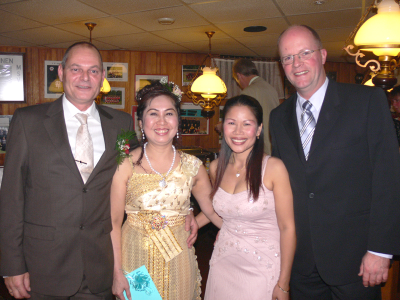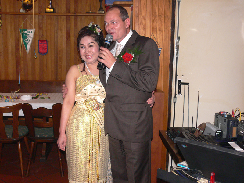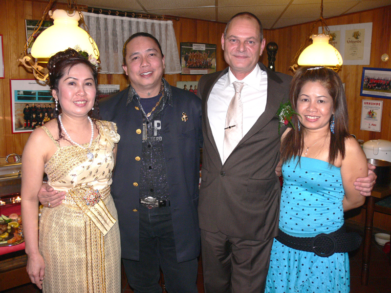 Stolze 62 große und 5 kleine Leute hatten sich am 8. September eingefunden, um mit Nalee und Ronald nachträglich die Hochzeit zu feiern. Sie kennen sich seit 4 Jahren und wollten nun ernst machen. Beide sind übrigens sehr fleißig und angenehme Zeitgenossen. Die Trauung fand einen Monat zuvor während eines Auslandsurlaubes statt. Die prächtige Feier erlebten wir im Vereinscasino des SV Mariendorf. Ein gemütliches Haus mit Berliner Flair und guter Küche. Wirt Thomas hatte das feine Buffet klargemacht (der Krustenbraten war ein Erlebnis). Das Thai-Essen besorgte Nalee (Chefin der Djantschai Thaimassage, Greifswalder Str. 153).