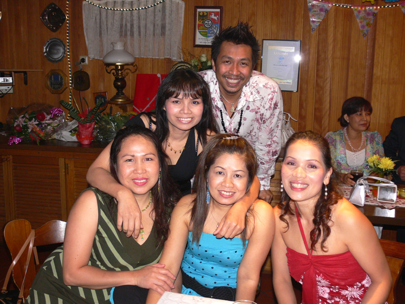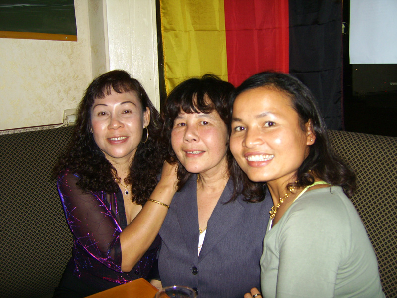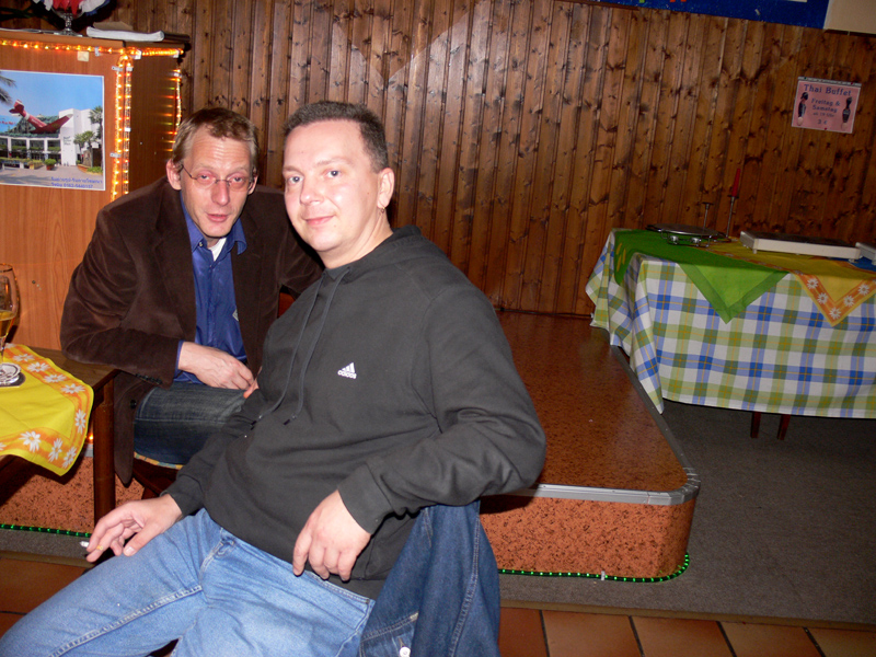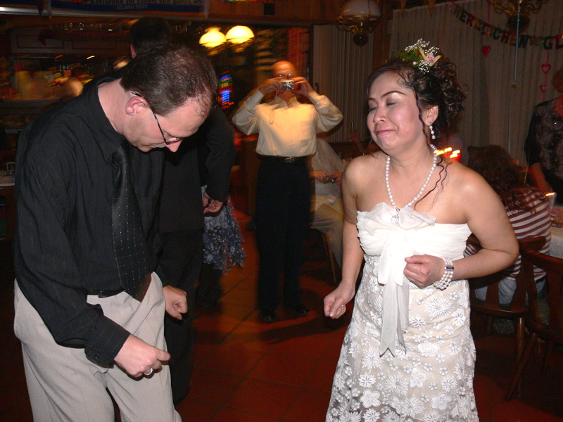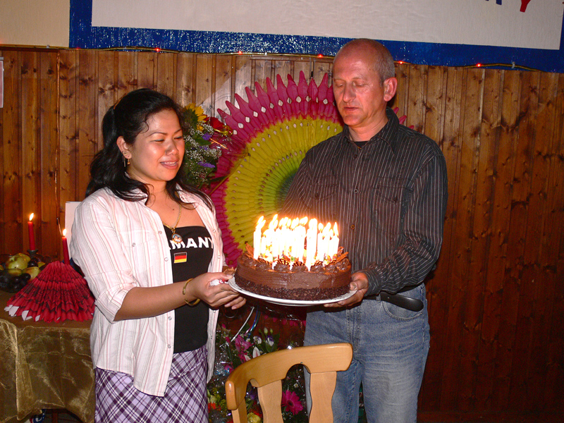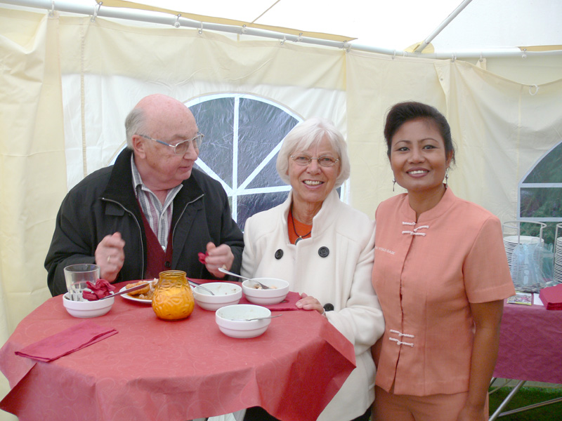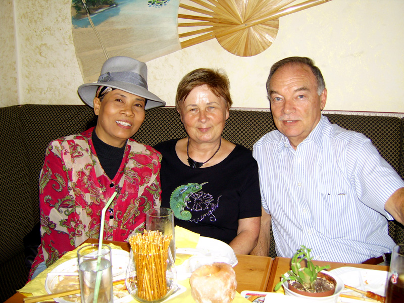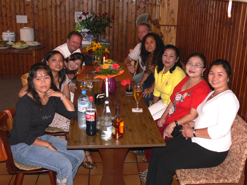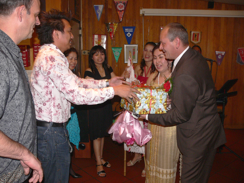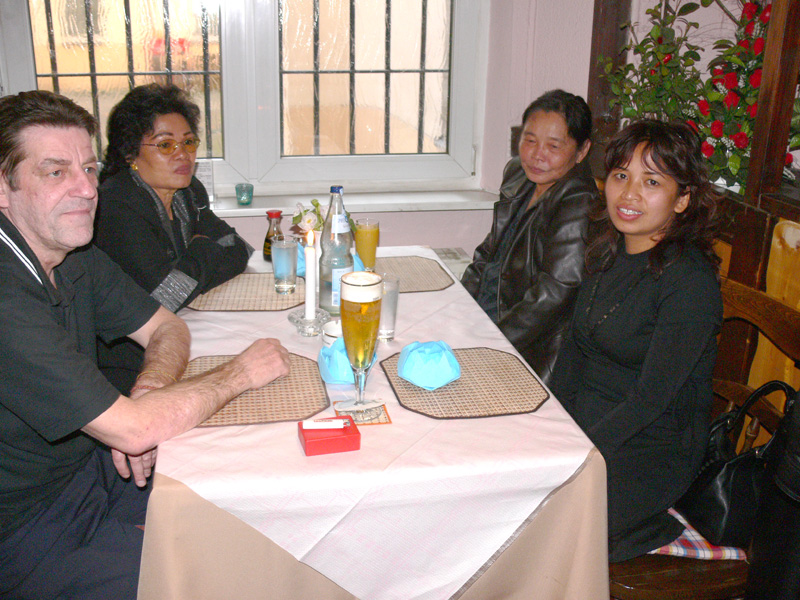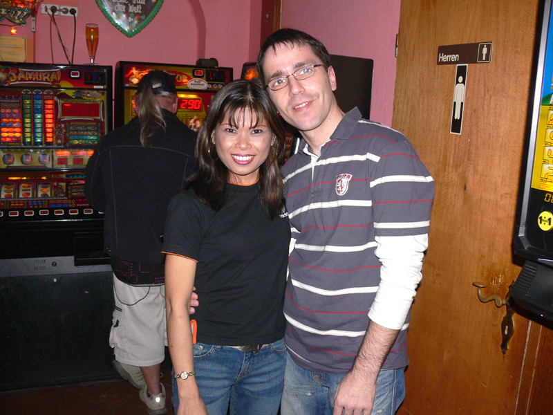 Stolze 62 große und 5 kleine Leute hatten sich am 8. September eingefunden, um mit Nalee und Ronald nachträglich die Hochzeit zu feiern. Sie kennen sich seit 4 Jahren und wollten nun ernst machen. Beide sind übrigens sehr fleißig und angenehme Zeitgenossen. Die Trauung fand einen Monat zuvor während eines Auslandsurlaubes statt. Die prächtige Feier erlebten wir im Vereinscasino des SV Mariendorf. Ein gemütliches Haus mit Berliner Flair und guter Küche. Wirt Thomas hatte das feine Buffet klargemacht (der Krustenbraten war ein Erlebnis). Das Thai-Essen besorgte Nalee (Chefin der Djantschai Thaimassage, Greifswalder Str. 153).