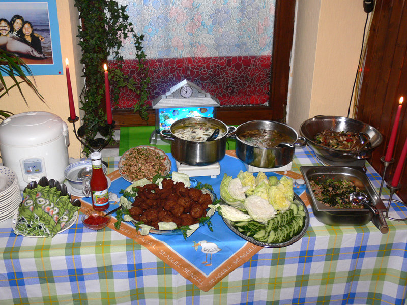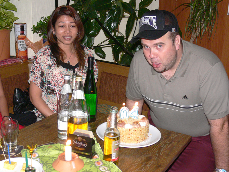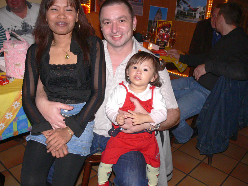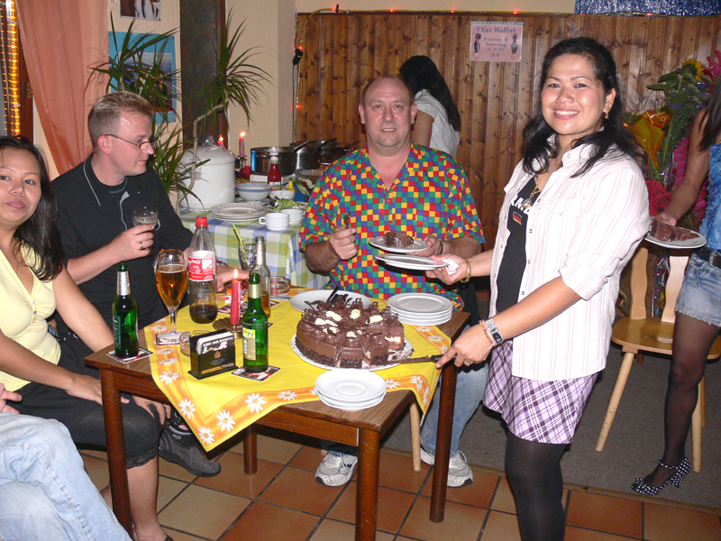 Am 08.09. feierte Peter in Berlin-Neukölln seinen Geburtstag. Welcher Peter? Na der mit dem Buddha auf dem Arm. Für die Gäste gab es ein reichliches Buffet mit allerlei Thaispeisen. Doch der kulinarische Knaller war die Thüringer Ente, die Peter selber gemacht hatte. Davon konnte Biker Uwe nicht genug bekommen und schlug richtig zu (3 x). Unser Lung Helmut war erst leicht irritiert, wer hier eigentlich seinen Ehrentag hatte, denn Peters Tochter war einfach das bessere Motiv und stahl ihrem stolzen Papa die Show. Mit Mama Dee an seiner Seite verzeiht der Vater seiner Natalie. Mögen die Drei immer glücklich sein. Unter den Gästen waren auch Pie Lek mit Mann Frank, Noi & Georg, Gee & Reinald, Tochter Sandy mit Freund und viele andere. Happy Birthday, Peter!