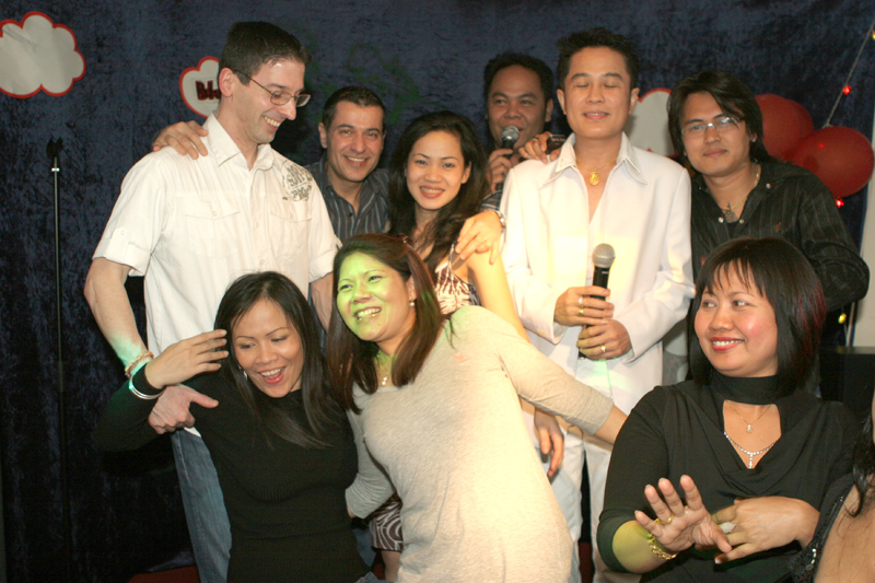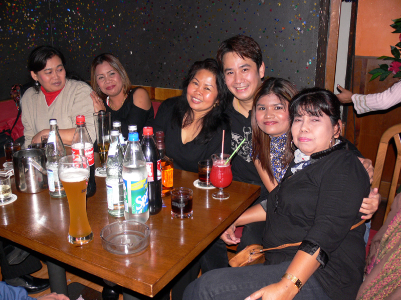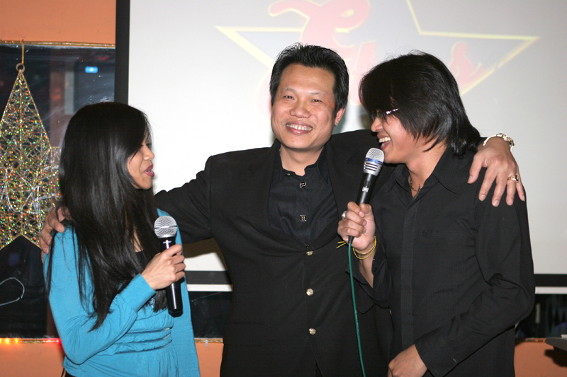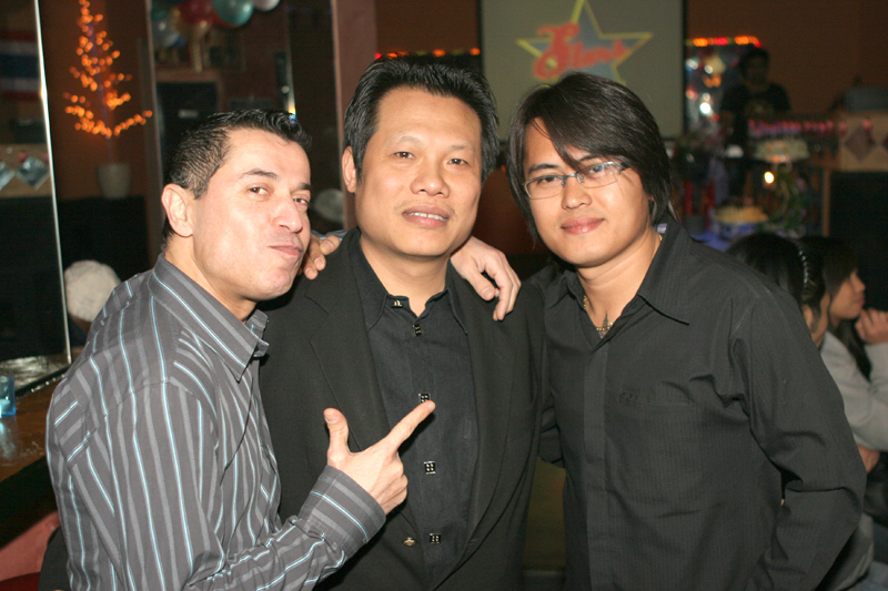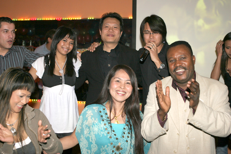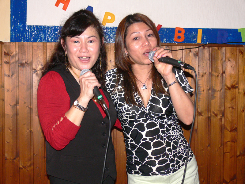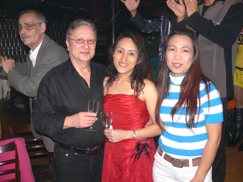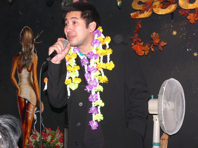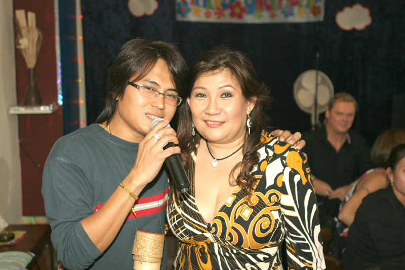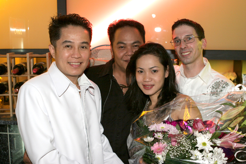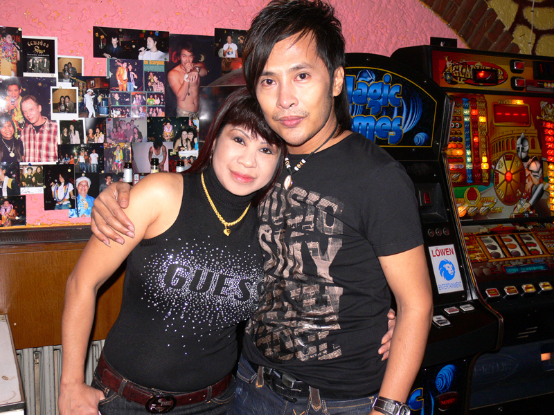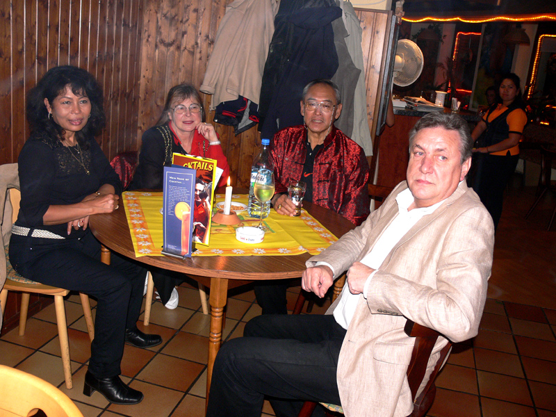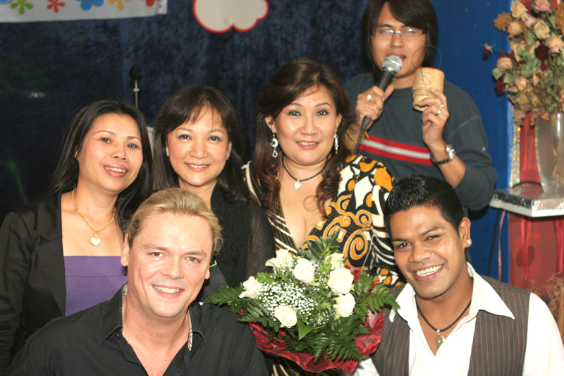 Waren bei der Eröffnung die Wände noch etwas kahl, sind sie nach und nach mit vielen kleinen Spiegeln und Leuchtketten verziert worden. Drei Flachbildschirme zeigen den Text zur Karaokemusik. Im Vorraum hängt eine bunte Bildergalerie mit zahlreichen Fotos von den Gästen. Hier stand auch am 29. September das Thai-Buffet, reichlich und lecker, wie immer, wenn Darika mit Pfanne, Topf und Kochlöffel jongliert. So ließen sich die eintreffenden Gäste nicht lange bitten und griffen gern zu. Mit großen Blumensträußen gratulierten Sombat vom Butterfly sowie Toan von der STARS Disco. Beide konnten auf Grund eigener Veranstaltungen nicht lange bleiben. Toi & Bärchen vom R.C.A. kamen etwas später, blieben dafür länger. Die Frauen ließen das Duo eh nicht gehen, bevor reichlich gesungen wurde.