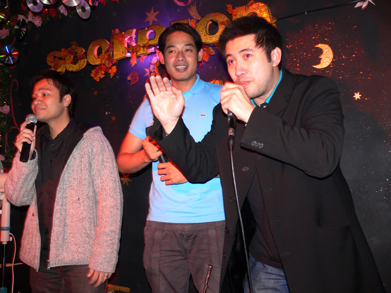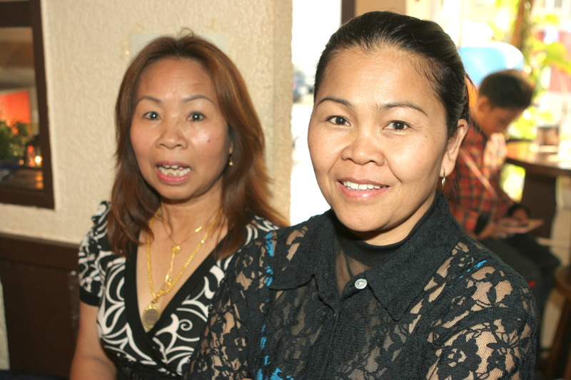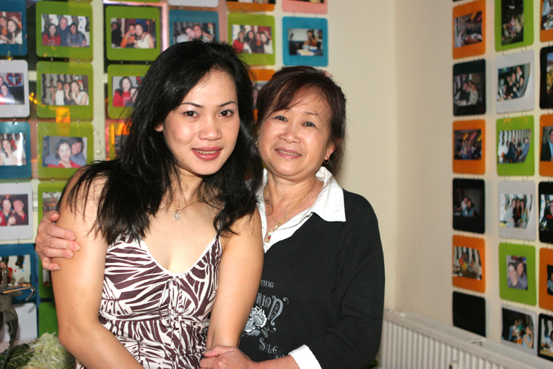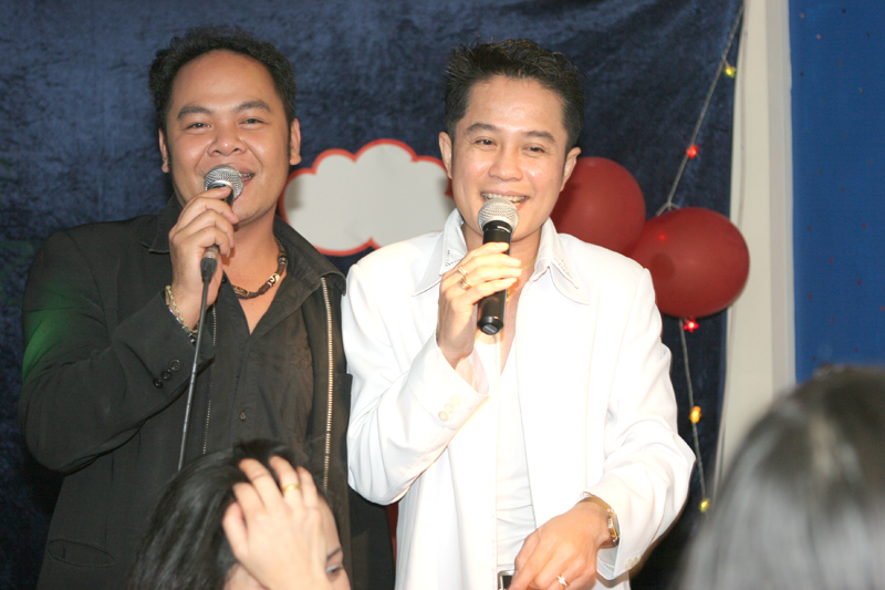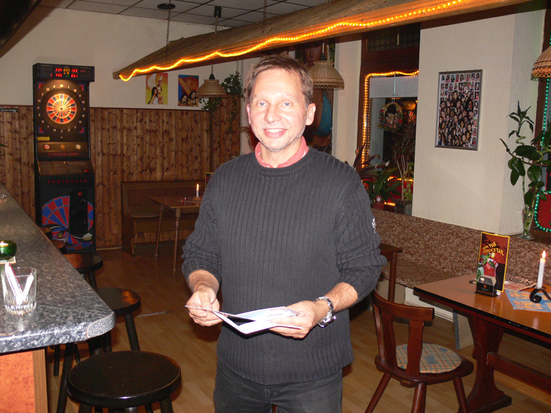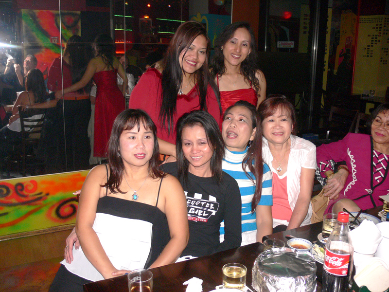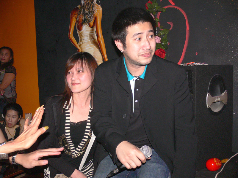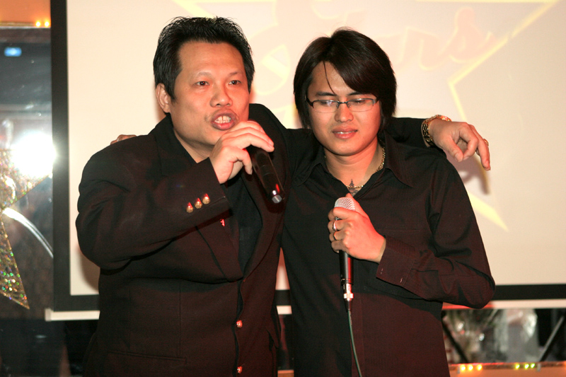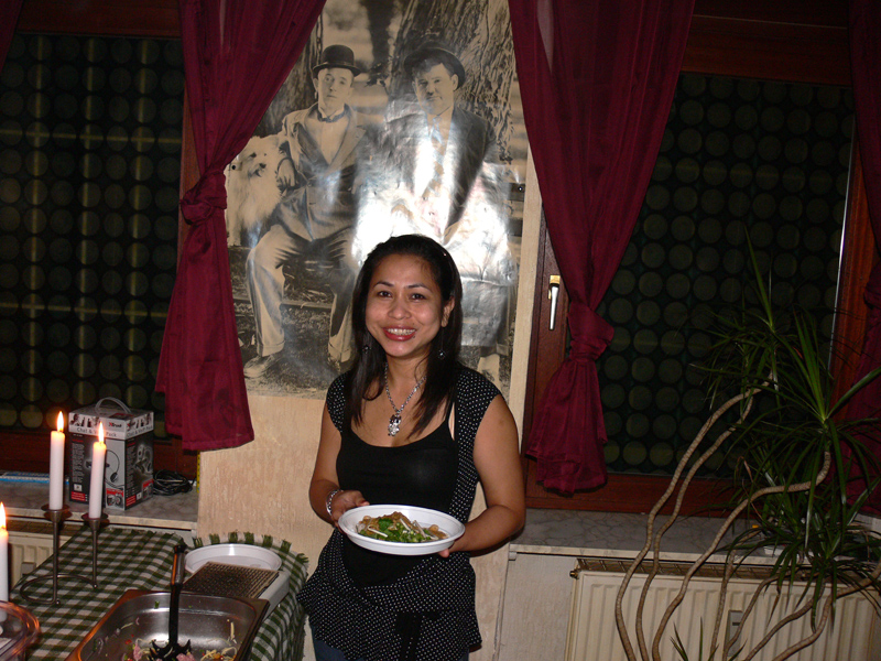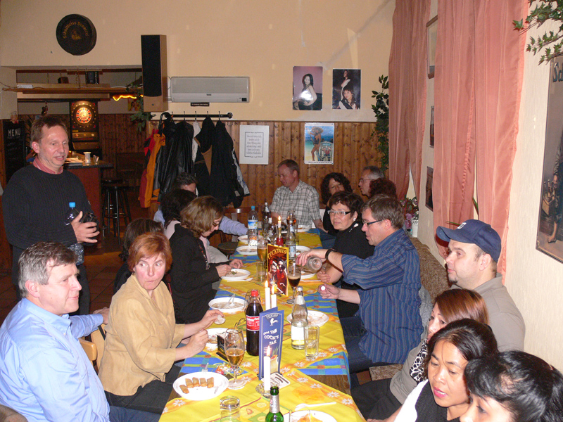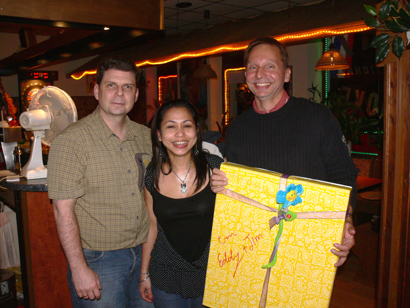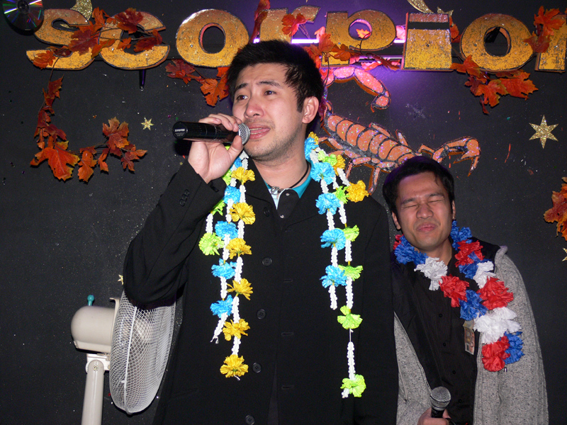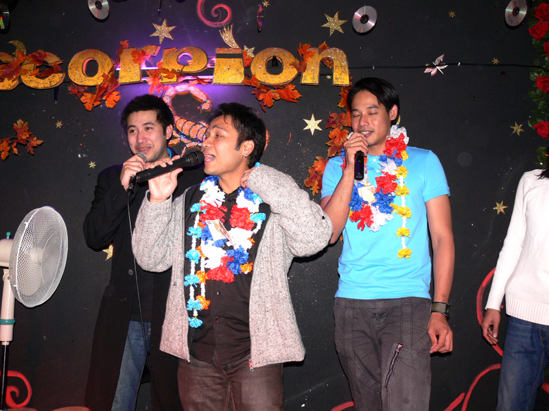 Waren bei der Eröffnung die Wände noch etwas kahl, sind sie nach und nach mit vielen kleinen Spiegeln und Leuchtketten verziert worden. Drei Flachbildschirme zeigen den Text zur Karaokemusik. Im Vorraum hängt eine bunte Bildergalerie mit zahlreichen Fotos von den Gästen. Hier stand auch am 29. September das Thai-Buffet, reichlich und lecker, wie immer, wenn Darika mit Pfanne, Topf und Kochlöffel jongliert. So ließen sich die eintreffenden Gäste nicht lange bitten und griffen gern zu. Mit großen Blumensträußen gratulierten Sombat vom Butterfly sowie Toan von der STARS Disco. Beide konnten auf Grund eigener Veranstaltungen nicht lange bleiben. Toi & Bärchen vom R.C.A. kamen etwas später, blieben dafür länger. Die Frauen ließen das Duo eh nicht gehen, bevor reichlich gesungen wurde.