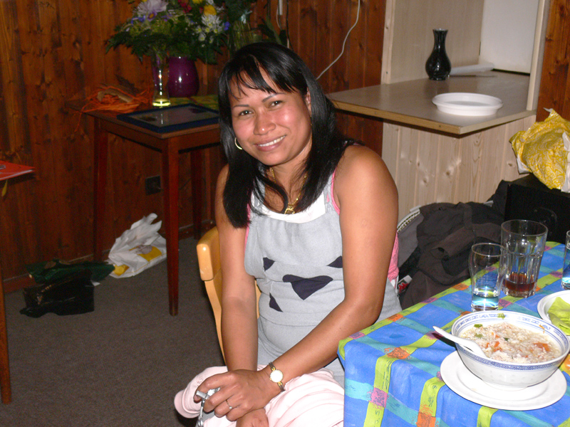 Pee Wan, mit richtigem Vornamen Wilawan, kommt wie viele in Berlin lebende Thaifrauen aus dem Zentrum des Mekong-Beckens, genauer gesagt aus Korat. Seit 12 Jahren weilt sie schon in der Hauptstadt und fühlt sich pudelwohl. Sie sagt, dass dies ihre erste Party seit vier Jahren ist. Warum aber im Blue Sky? Weil die Atmosphäre toll ist, das Essen schmeckt, und das alles zu moderaten Preisen. Rund 20 Gäste nahmen an zusammengestellten Tischen Platz, prosteten sich eifrig zu und gratulierten der Reihe nach - und sangen aus voller Kehle und nach Herzenslust. So sollte sie sein, die Thaiparty. Auch vom FARANG die herzlichsten Glückwünsche. Helmut aus Steglitz