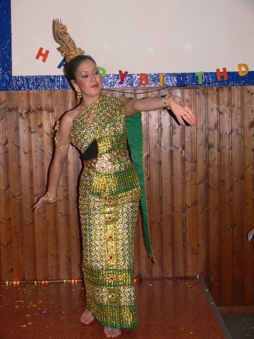 Ein Höhepunkt der Jubiläums-Feier war die lustige Show, die in zwei Etappen vorgetragen wurde. Zuerst brillierte der verkleidete Rang (vom Mao-Thai), dann spielte die Hausherrin selber auf. Buntes Röckchen über, breiter Schal um die Oberweite, und fertig war die Verkleide. Entsprechender Beifall folgte auf dem Fuße. War überhaupt "ne richtig geile Party". In diesem Sinne: Viel Glück und Erfolg weiterhin wünschen die Berliner Thai-Szene und das FARANG-Team. Helmut aus Steglitz