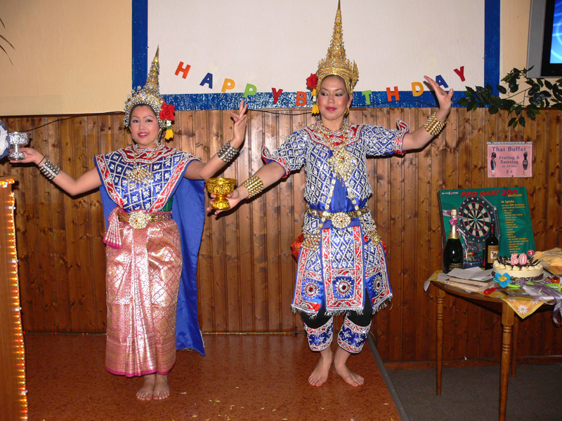 ...und ließ am 29. September im LANNA mächtig die Korken knallen. Es war weit mehr als eine Familienfeier mit der Mama, der Schwester und vielen Kollegen. Ist ja schließlich ein halbes Jahrhundert! Sabina und Linda trugen mehrere Runden Thai-Tanz auf der Bühne vor. Stets in anderen Kostümen. Dukta sei Dank. Danach noch professionelle Karaoke-Beihilfe aus dem nicht allzuweiten Musik-Café R.C.A. in Berlin-Neukölln. Wie man auf den wenigen Fotos dennoch gut sehen kann war es ein gelungenes Fest. Der junggebliebene "Jubilar" und Thailand-Freund versuchte sich sogar in Thai-Tanz-gerechten Fingerübungen unter Sabinas Anleitung. Na bitte, es geht doch noch! Wir freuen uns nun auf Burkhards 100. Geburtstag. Mathias Heinrich