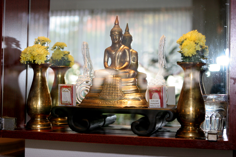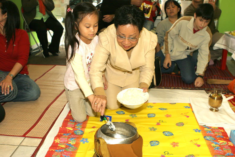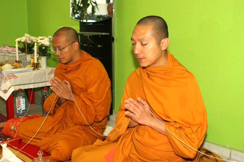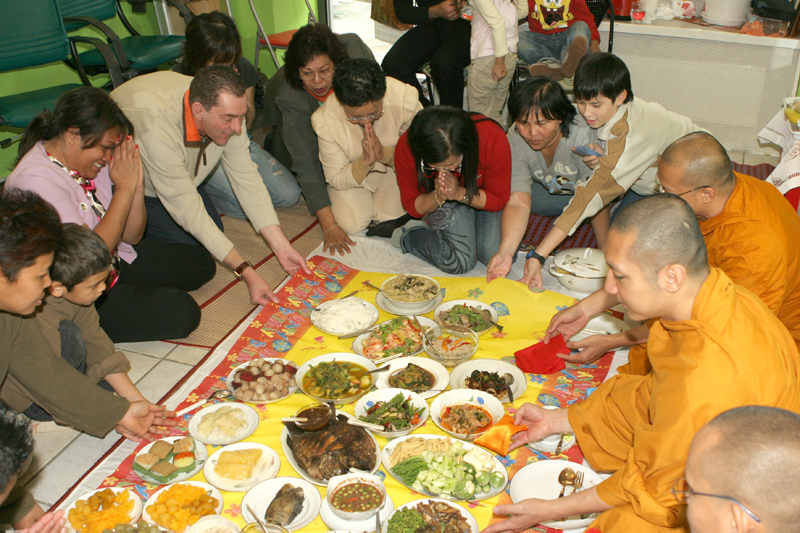 Etwa 10.30 Uhr trafen am 29. September drei Mönche vom Wittenauer Tempel ein, um die buddhistische Weihe-Zeremonie vorzunehmen. Diese recht späte Weihe (das Geschäft hat schon drei Monate auf) hängt mit dem Geburtstag von Chefin Jeaw zusammen. Der war zwei Tage zuvor. So konnten praktisch zwei Fliegen mit einer Klappe geschlagen werden. Zu diesem Zweck wurden die Arbeitsgeräte wie Waschtisch, Stühle und Rollwagen, der die Friseur-Utensilien enthält, weggeräumt. Jetzt war Platz auf dem Fußboden für die Mönche, die Gäste und für die vielen Thai-Speisen. Symbolisch gaben alle Anwesenden einen Löffel Reis in den Topf der Mönche. Nach der Weihe aßen zuerst die Mönche, dann alle gemeinsam. Zahlreiche Kinder und Stammkunden, so auch Mary Kay, waren der Einladung gefolgt.
