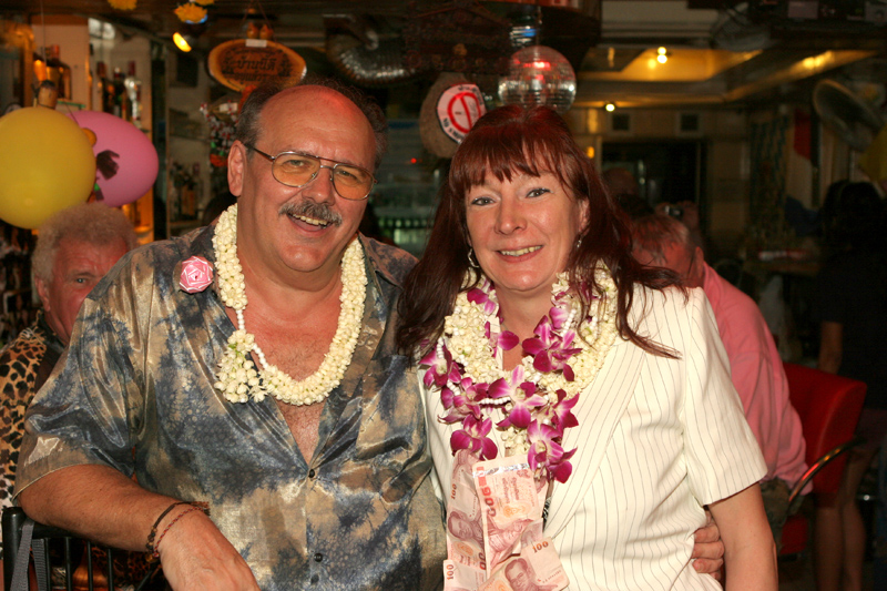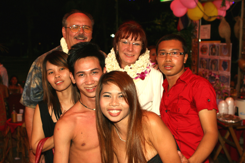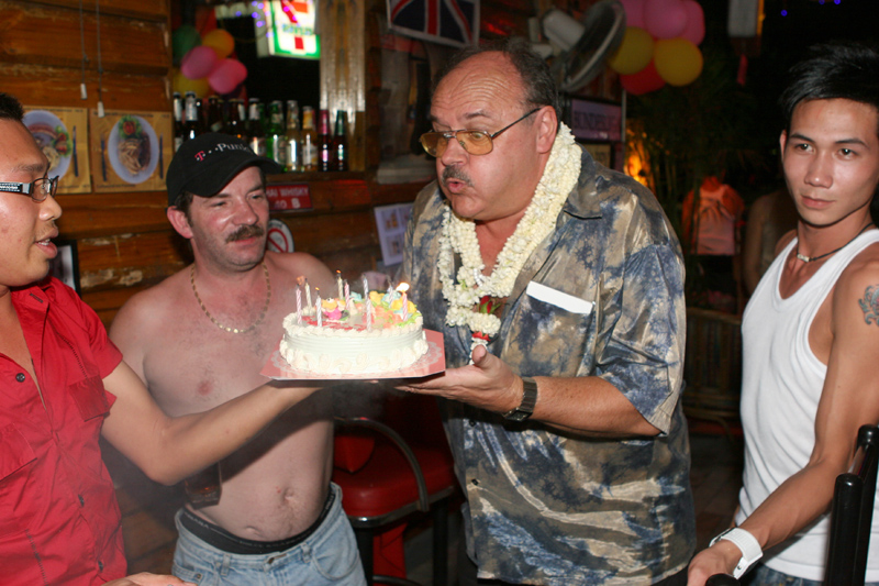 In der Nacht vom 5. zum 6. April war dann der Teufel los. "Happy Birthday, Manne" war die Überschrift. Sonja und Peter sind die Betreiber des kleinen Restaurants & Bierbar direkt an der Beachroad, Höhe Soi 4. Beide sind sehr bemüht um ihre Gäste, deren Stamm immer größer wird. Sie organisierten die Party. Am Eingang tafelten die Anwesenden vom reichhaltigen und schmackhaften Buffet. Gemischtes Deutsch-Thai-Food, hergestellt in der eigenen Küche. Zur Geisterstunde waren zwei Boys da, die überaus leicht bekleidet mit brennenden Kerzen an der Stange tanzten, wobei das Wachs unaufhörlich auf den öligen Oberkörper tropfte. Ein anderer zeigte seine Beweglichkeit an dem inzwischen heiß gewordenen Rundeisen zu lauter Hipp-Hopp-Musik. Tipp steckten die Mädels in das schmale Leinentuch unterhalb der Gürtellinie. Sabine im Schlaraffenland. Euer Schreiberling wandte sich lieber den alkoholischen Genüssen zu. Unter dem Motto: am Abend ein Bier und die Nacht gehört dir wurde der Abend immer länger. Auf dem Nachhauseweg, keine Ahnung wie spät, oder besser wie früh es war, kam dann die bange Frage: Lall ick schon? Happy Birthday, Euch beiden!
