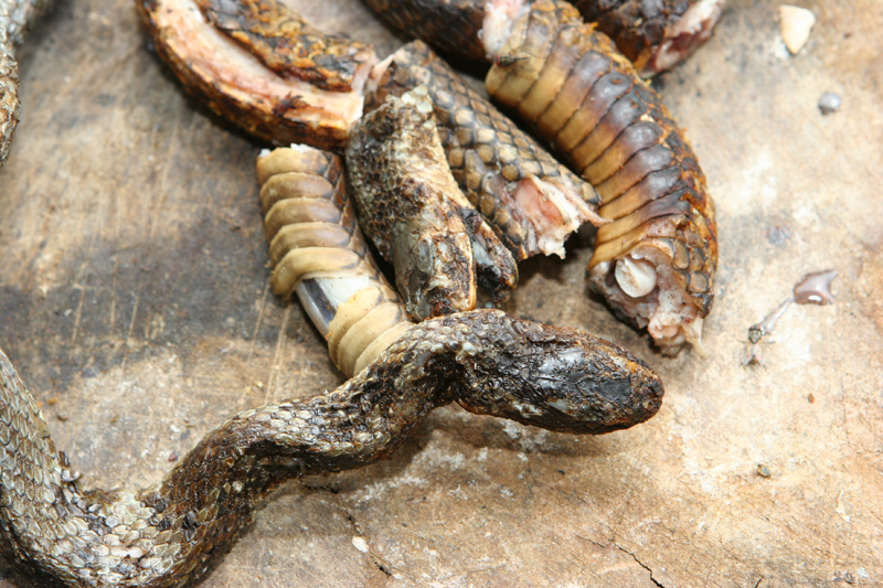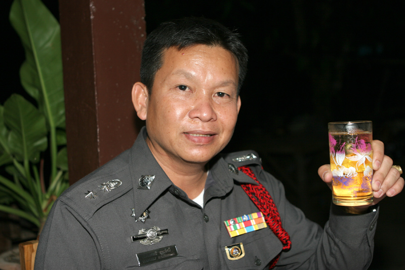 Am Miniflughafen sehen die Passagiere durch die runde Scheibe vier Thaifrauen in nordthailändischer Tracht. Sie begrüßen die Ankommenden mit einem Tanz. Tolle Idee. Beim Aussteigen fällt mein Blick in Richtung Umzäunung. Noree winkt heftig und... der Polizeichef (!), der sich für den Rest des Tages frei nahm und uns nach Hause bringt. Welche Ehre. Das Sawasdee krap fällt besonders höflich aus. Wir steigen in den älteren Benz. Die 86 Km nach Ngao fliegen förmlich vorbei. Eine Geschwindigkeitsbegrenzung gibt es für den höchsten Beamten des Distrikts nicht. Der Empfang bei Norees Familie ist überaus herzlich. Zwei weitere Polizisten gesellen sich zu uns. Anscheinend bin ich der einzige Farang in der näheren Umgebung. Beim geselligen Zusammensein warten viele Frage auf Antworten. Das eisgekühlte Singhabier macht die Runde. Auf dem Tisch warten geröstete Maden auf den Verzehr. Die Tierchen findet man im Bambus. Mühsam werden sie gesammelt und geröstet. Nach zaghaftem Versuch, doch, kann man essen. Schmecken leicht nussig. Daneben steht die Schüssel mit Salat, mit Schlangensalat. Mit Sicherheit nicht jedermanns Sache, sieht jedoch gut aus, riecht gut, und Ihr könnt es ruhig glauben, schmeckt auch gut. Für den Europäer vielleicht ein wenig scharf, aber ein Blatt vom Kohlkraut dazu - perfekt.