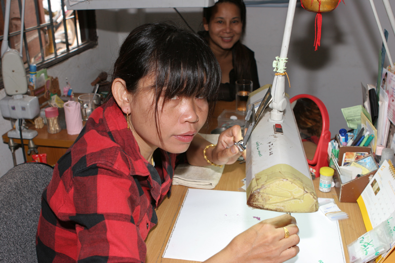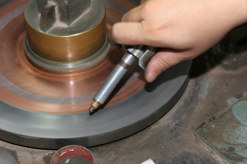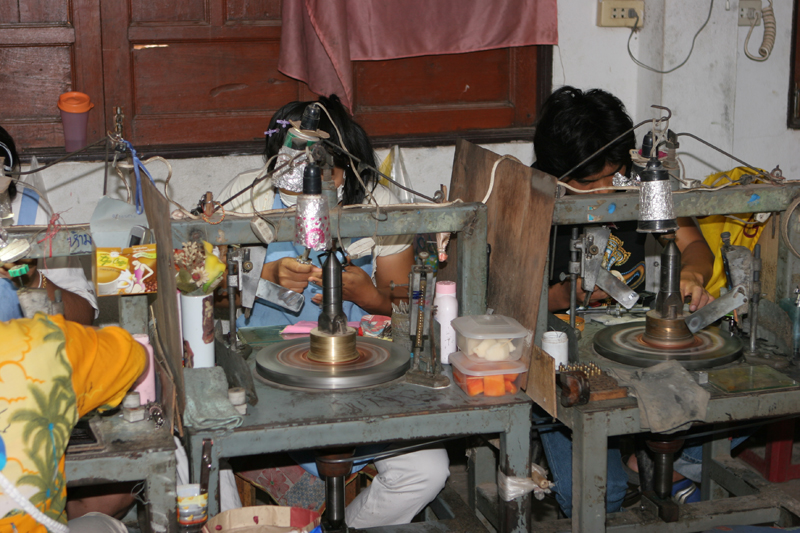 Die Arbeit erfordert bei den Größen zwischen 1 und 1,5 mm Durchmesser ein außergewöhnliches Feingefühl in den Händen. Jeder Stein muss exakt geschliffen werden. Dazu sind mehrere Arbeitsschritte notwendig. Zuerst werden die kleinen Kostbarkeiten durch flache Minisiebe verschiedener Größen geschüttelt, damit große und kleine Steinchen getrennt werden. Im zweiten Arbeitsgang kleben zwei Arbeiter die Saphire auf eine etwa 10 cm lange Spindel. An deren Spitze ist eine Masse, die bei Erwärmung weich wird und so das begehrte Objekt daran klebt. Nummer drei ist der Schliff der Oberseite. Ein erneutes Umspannen ist für den vierten Durchgang erforderlich. Jetzt bekommt die Unterseite (für die Einfassung) ihre endgültige Form. Immer und immer wird während des Schleifvorganges mit der Lupe geprüft. Die einzelnen Arbeitsgeräte zu beschreiben ginge an dieser Stelle zu weit, und eine Schleifscheibe kann sich jeder vorstellen. Gesagt sei, dass alles reine Handarbeit ist. Keine elektronische Unterstützung. Ausschuss gibt es so gut wie keinen. Und wenn einmal, wird nachgeschliffen, auf Kosten der Größe natürlich. Die kritische Endprüfung nimmt Chefin Rob selbst vor. Einfach glänzend.
