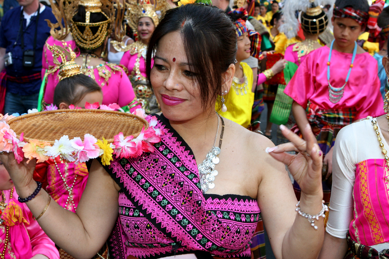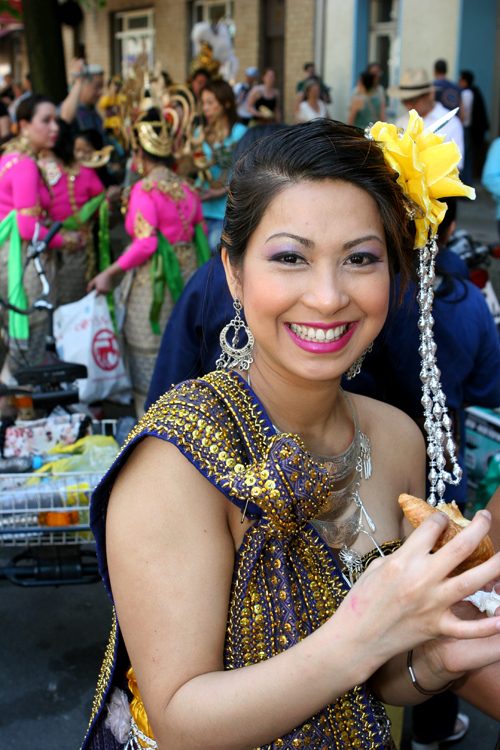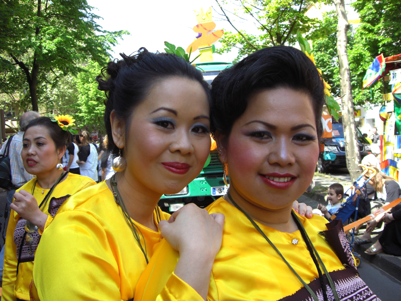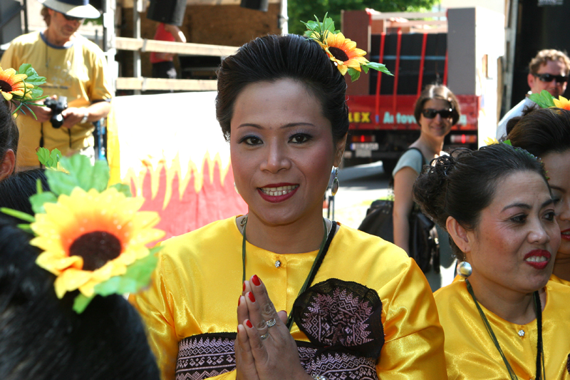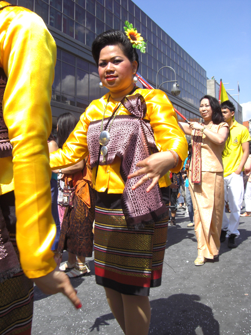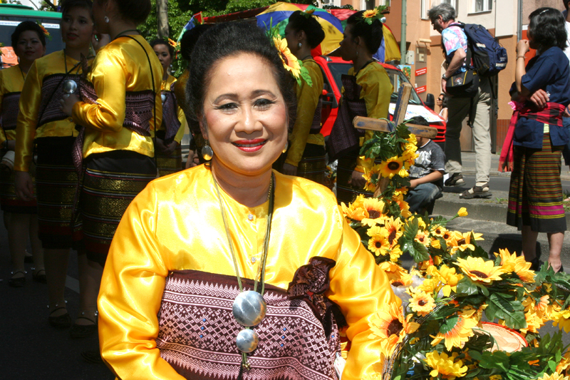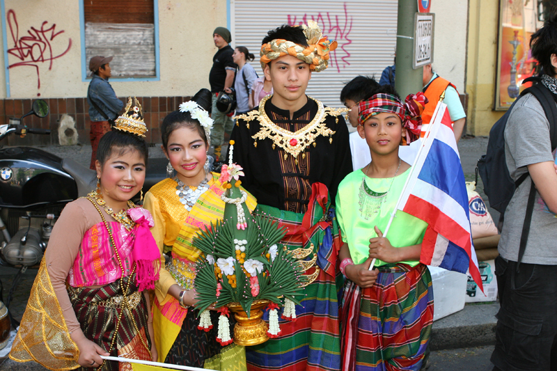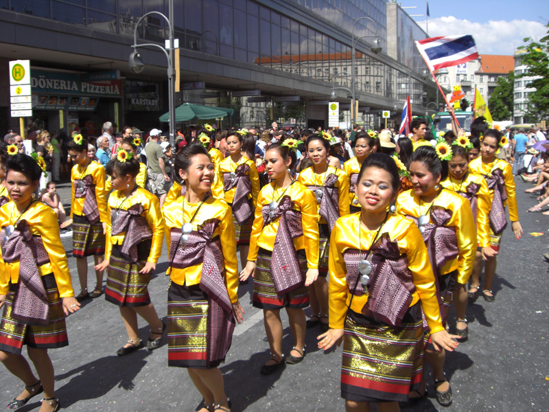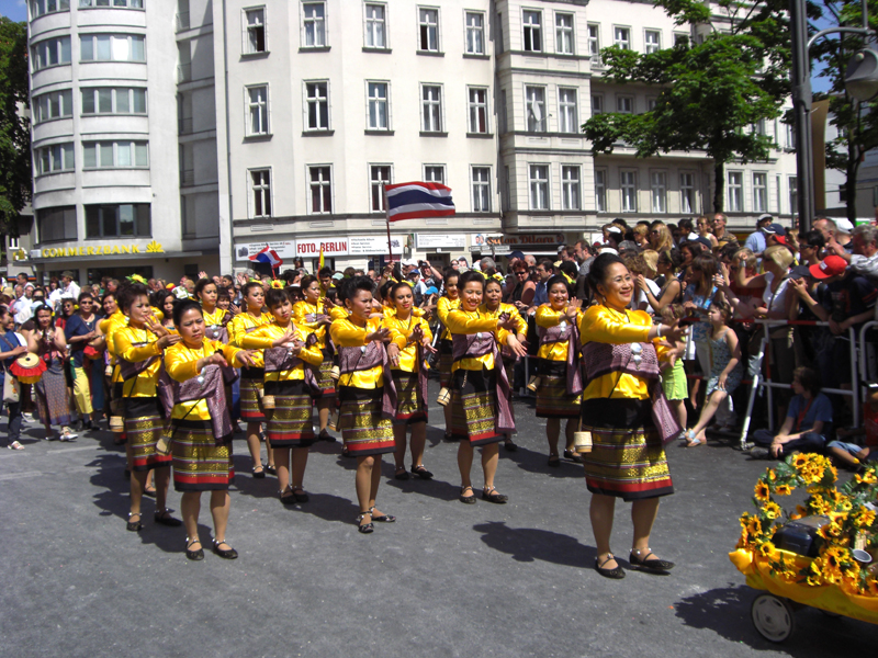 Dieser Tag war wie aus dem Bilderbogen. Sehr heiß und Sonne ohne Ende. Viele stöhnten unter den Kostümen und wegen des langen Weges zu Fuß. Doch tapfer haben alle stundenlang durchgetanzt, getrommelt, gesungen und Sanuk verbreitet. Thailändische Fahnen wurden geschwenkt, farbige Sonnenschirme schützten ein wenig. Die Berliner sahen es erfreut. Viele zückten den Fotoapparat und waren für die exotischen Motive dankbar.