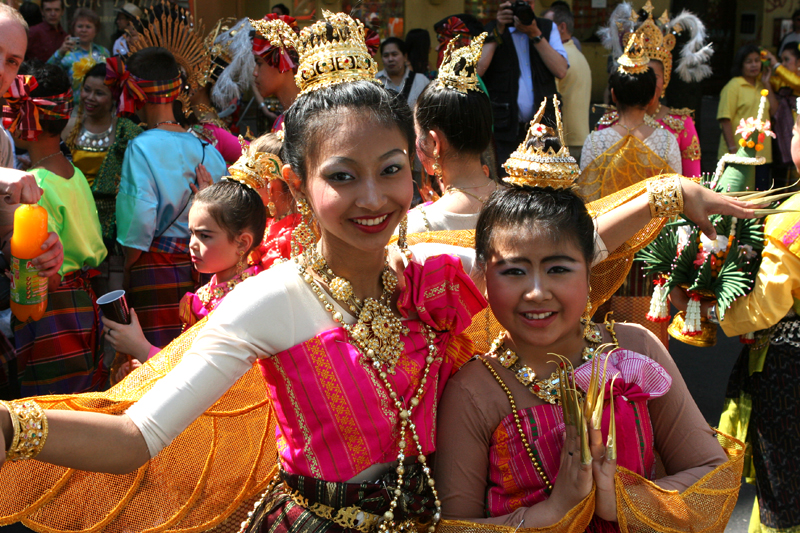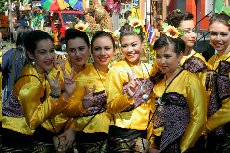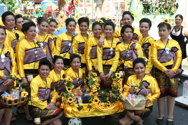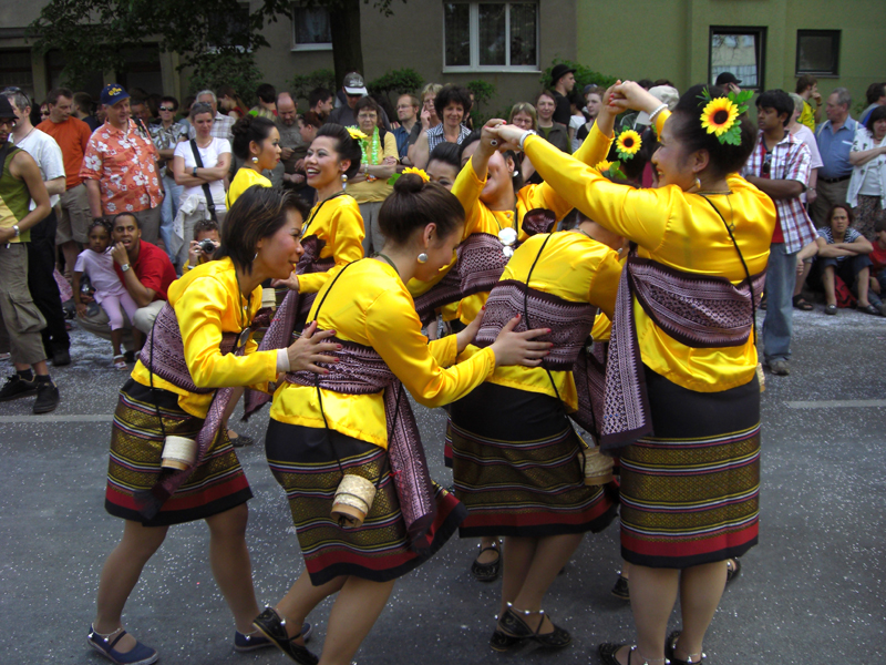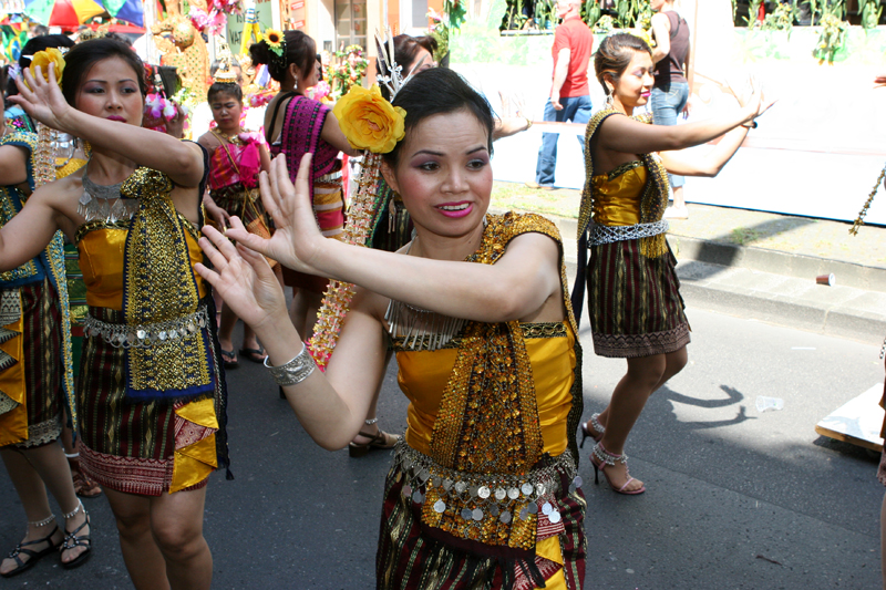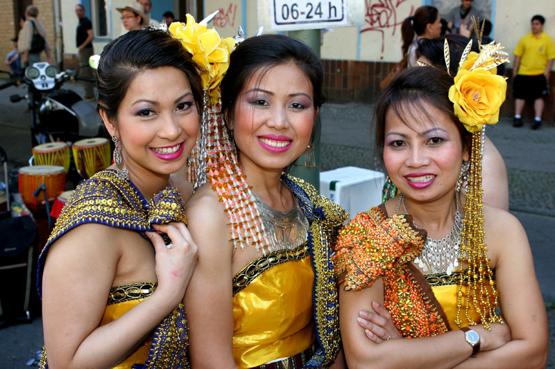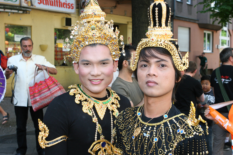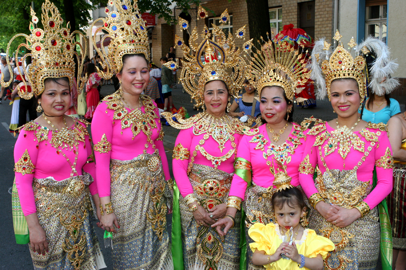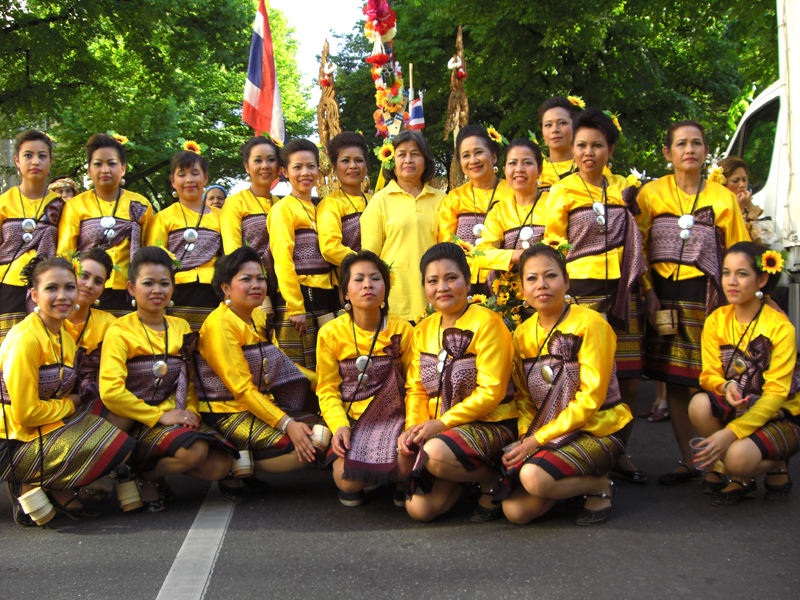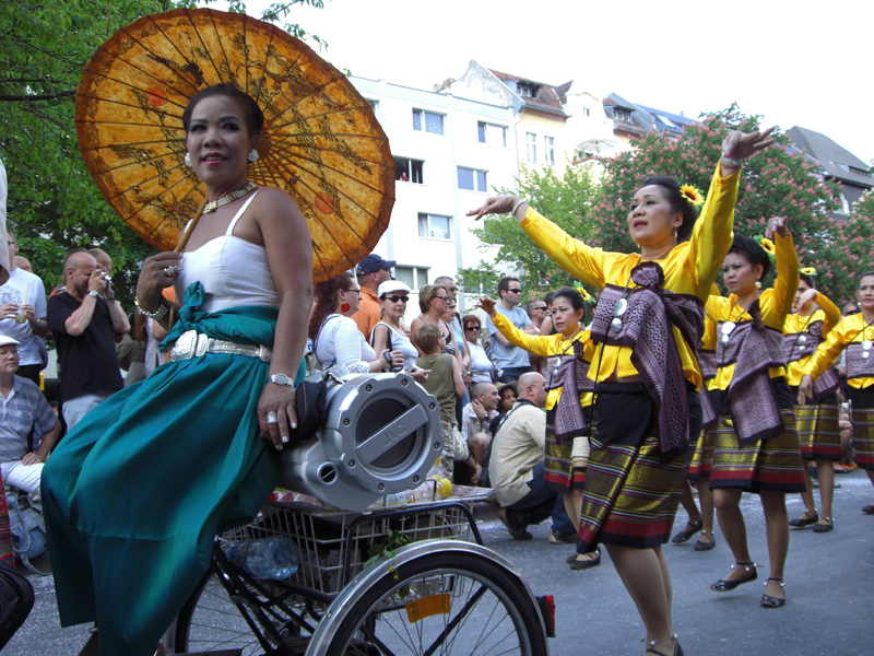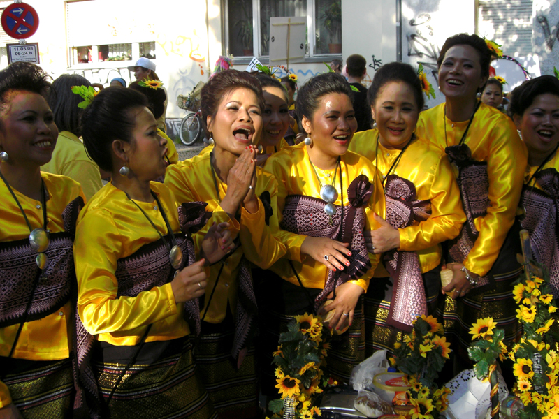 Doch die Berliner Thais machten das Beste daraus. Parallel hatten sich mehrere Tanzgruppen schon Wochen vor dem Termin gut vorbereitet und Tänze eingeübt sowie die Kostüme angefertigt und mehrere Wagen geschmückt. Zu nennen wären da Pa Reno vom Thailändischen Buddhistenverein, der T.H.A.I. e.V., die Truppe um Papa Lo, dann Dimmy & Nenn von Crystal Lotus und Deo vom Schneiderstübchen, Jimmy von der Thon Pho Massage. Nicht zu vergessen die alteingesessene Tanzgruppe namens Baan Mai Ruh Roy mit ihren prächtigen Goldhauben. Sicher habe ich einige Namen vergessen.