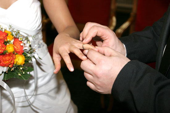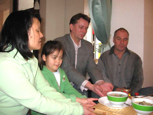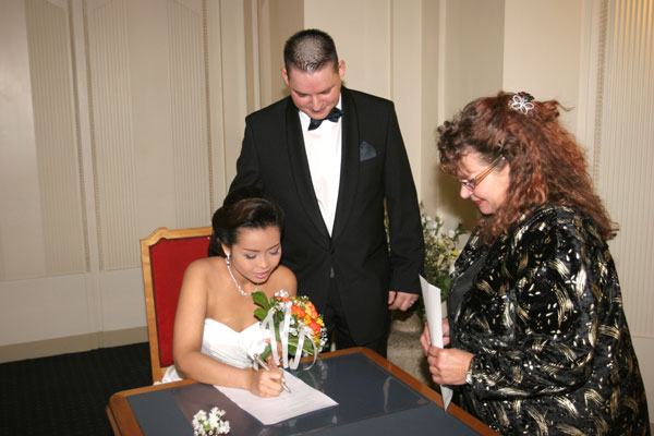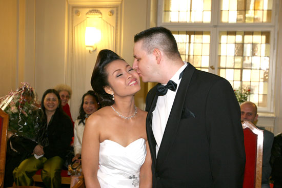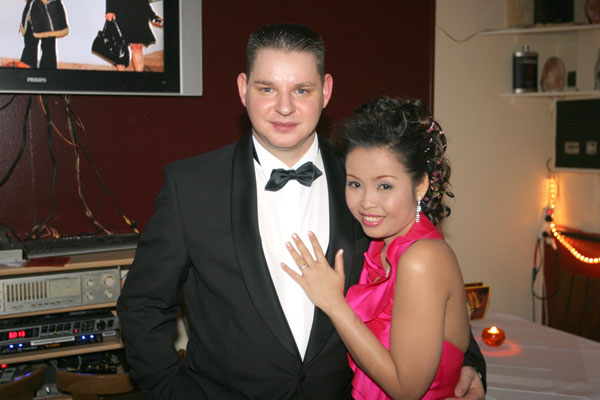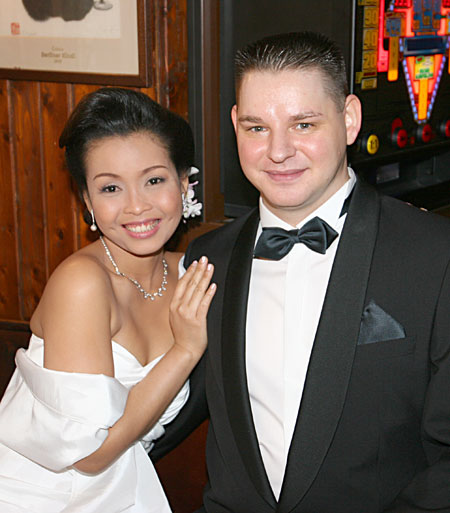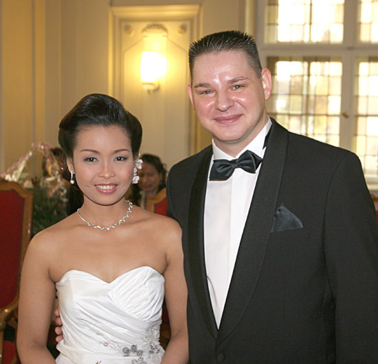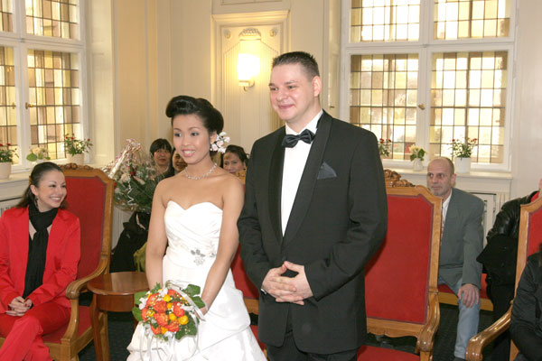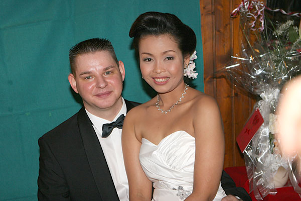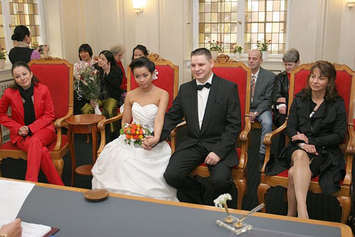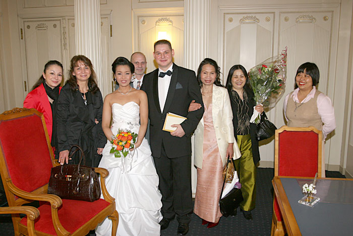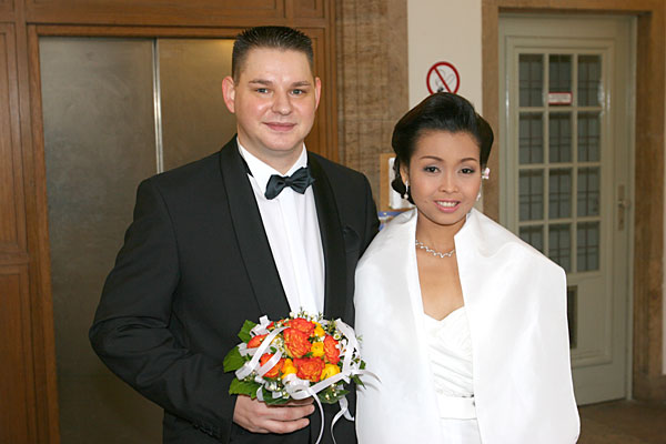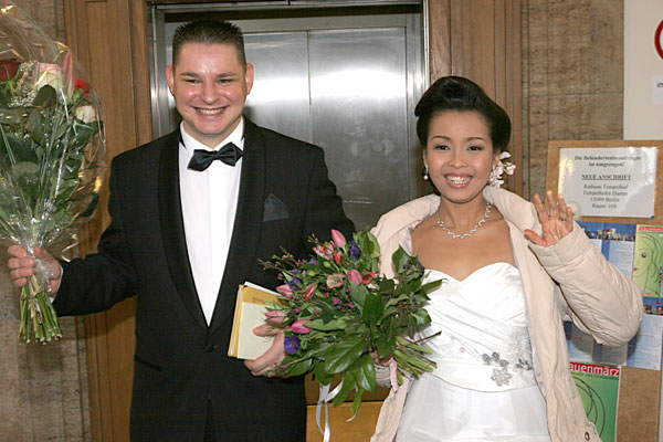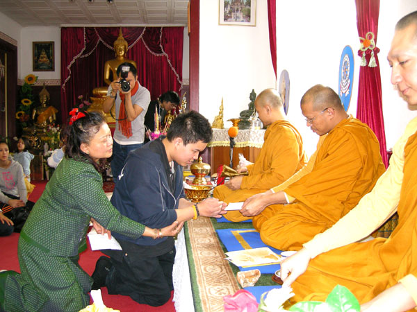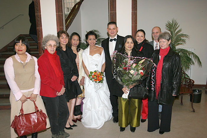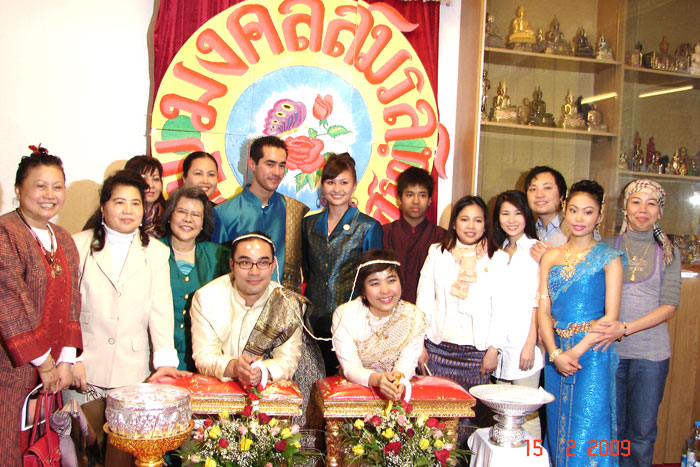 Traditionelle thailändische Hochzeitszeremonie am 15. Februar 2009 im Wat Buddhavihara in Berlin-Wittenau. Bräutigam Ott ist übrigens der Sohn von Khun Renu, der 2. Vorsitzenden des Thailändischen Buddhistenvereins Berlin, Dritte von links, vorne.