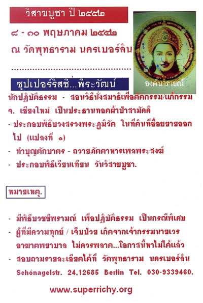 Auf dieser Seite können die Thai-Tempel in Deutschland ihre Informationen veröffentlichen. Der Wat Somdej nutzt dieses Angebot schon regelmäßig. Wir freuen uns auch über diese Akzeptanz unserer Arbeit. Weiter so!