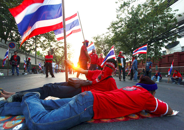 Die Rothemden, wie sie sich selbst nennen, die Anhänger des ehemaligen thailändischen Premierministers Thaksin, haben sich auf dem Gelände des Government House verschanzt. Sie wollen gar nicht hinein. Sie wollen nur den Raum um das Haus herum erobern - und das nach kurzer Zeit auch geschafft.