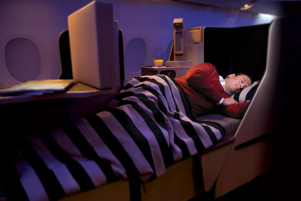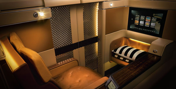 Die 1. Class-Suiten sind 2,08 lang und mit elektrischen Türen-, Sitz mit Massagefunktion (54,9 breit)-, Bett (2 m lang) ausgestattet. Ein Bildschirm (58,4 cm) und ein "Room"-Service vom Feinsten sind, wie viele weitere Details dort, einfach traumhaft!
