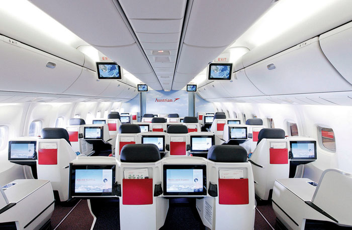 Die Sitze sind mit dezentem, grauem Stoff bezogen und aus edlen, luxuriösen Materialien verarbeitet. Eine ausgeklügelte Sitzaufteilung ermöglicht in der Boeing 777 vier von fünf Fluggästen in einer Reihe den direkten Zugang zum Gang. In der Boeing 767 hat jeder Business Class Gast direkten Gangzutritt. Die Sitzaufteilung in der Boeing 777 ist 1. Reihe: 2-2-1, 2. Reihe: 1-2-2 usw. und in der Boeing 767 in jeder Reihe 1-2-1. Die Austrian Farben, Weiß, Rot und Hellblau dominieren das Erscheinungsbild an Bord und sollen beruhigend und stressmindernd wirken.
