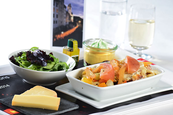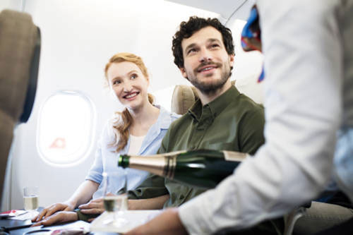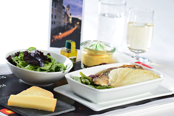 Langstreckenflüge in der Austrian Business Class mit First-Class Service sind ein besonderes Erlebnis. Die Flugbegleiterinnen und Flugbegleiter verwöhnen die Passagiere mit einem mehrgängigen DO & CO Menü, das der mitfliegende Austrian Flying Küchen-Chef an Bord anrichtet und verfeinert. Als Auftakt ein Gruß aus der Küche, gefolgt von Suppe und Vorspeisen vom Service-Wagen sowie von drei verschiedenen Hauptgerichten. Eine Dessert- und Käsevariation schließt den Magen. Der Bordsommelier empfiehlt aus dem exquisiten Weinangebot den richtigen Tropfen passend dazu.
