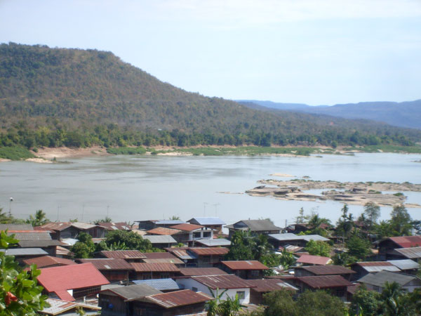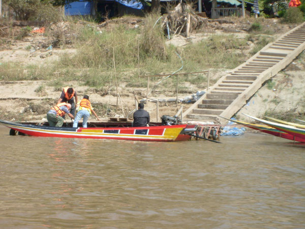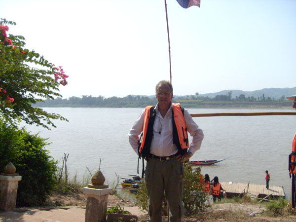 Dann war die Zeit für uns vorbei, und der thailändische Bootsführer drängte zum Aufbruch. Schnell noch ein Abschiedsfoto auf laotischer Seite. Wieder die Uferböschung hinab, rein in das Boot und volles Rohr über den Mekong in Richtung Thailand. Dann war da aufeinmal das Boot der thailändischen Grenzpolizei. Mein Gott, auch das noch, dachte ich und hörte die Stimme unseres Bootsführers: Mai bpen rai, mai bpen rai, no Problem Sir. Volle Pulle ist der an der thailändischen Grenzpatrouille vorbeigesaust, hat dabei gewunken, und die Beamten haben nett und freundlich zurückgewunken. Det wars also. Na bitte, Leute, es geht doch. Mai bpen rai, mai bpen rai, Thailand ist eben anders, was ja auch der jetzige Ministerpräsident immer wieder betont.