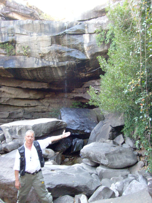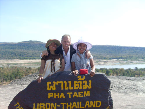 Wir kamen auf ein mächtiges Kliff, 3.000-4.000 Jahre alt. Da ging es mächtig steil abwärts, so 50-80 Meter waren es sicherlich. Das mit der Höhlenmalerei, na ja, bei mittlerweile 37 Grad im Schatten - nur Schatten gab es keinen. Da sagte mein Asthma: "Aber hallo, wo willst du denn hin?" Weit und breit verbrannte Erde, aber ein schöner Ausblick in Richtung Laos (siehe Foto). Ja, da habe ich passen müssen und habe mich auf die angekündigten üppigen Wasserfälle gefreut und auf die exotische Pflanzenwelt. Alle anderen sind also losmaschiert und waren auch recht bald wieder zurück, weil so doll wars dann auch nicht mit der Höhlenmalerei. Nun aber zu den anderen Sehenswürdigkeiten - zu den Wasserfällen, also Natur pur. Aber wo ist das nur, fragten wir uns? Gesucht haben wir sie ja, und was wir fanden, war nun wirklich nicht das, was da so angepriesen wurde. Natur ja, aber leider zum grossen Teil total vertrocknet und der oder die Wasserfälle? Das sah so aus als ob einer vom Felsen pinkelt (ein bischen traurig). In der Info rühmt sich ja der grosse Wasserfall laut Orginaltext: "Soi Sawan Waterfall is a large perennial waterfall originating from 2 main waterways, Huai Sanom off a high and steep cliff and Huai Soi. The two waterways look like two traces of a necklace that meet before merging with Mae Nam Khong River!"