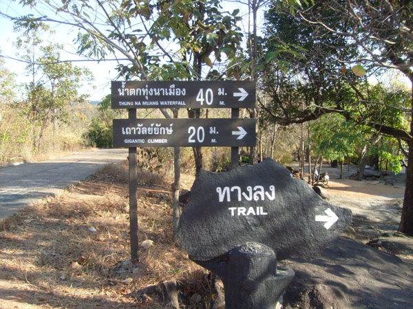 Wie gut, dass ich mittlerweile im Besitz eines Thaiführerscheins bin, damit bezahlt man nämlich Thaipreise, wie mir mal gesagt wurde, und so war es dann auch. Wir bekamen auch ein Infoblatt, wo all die Sehenswürdigkeiten angepriesen wurden: Das gesamte Areal sei 340 Quadratkilometer gross, mit Höhlenmalereien in Sandsteinhöhlen, üppigen Wasserfällen, einem Steingarten und exotischen Pflanzen, einzigartig für diese Gegend. So waren wir auch guter Dinge und machten uns auf den Weg.