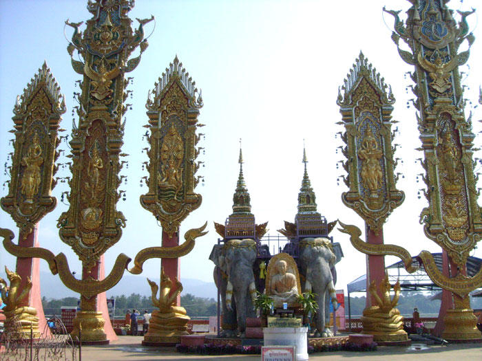 Am nächsten Morgen beim Frühstücksbüfett um 7.30 Uhr kam erneut die Frage: Wohin geht es denn heute? Ich habe das Goldene Dreieck vorgeschlagen, ca. 130 km von Phayao entfernt. Damit waren alle einverstanden, und auf ging's. Von Phayao auf der Strasse 1 in Richtung Chiang Rai, weiter auf der 110, bei Mae Chan dann rechts auf die 1016 bis zum Golden Triangel (Sop Ruak). So heisst der Punkt, wo Thailand an Laos und Myanmar (früher Birma) grenzt.