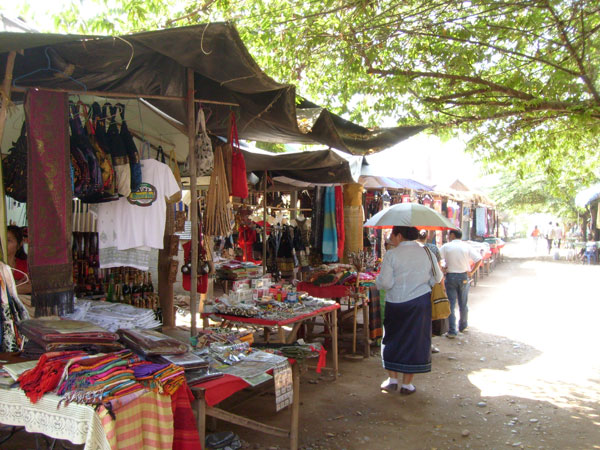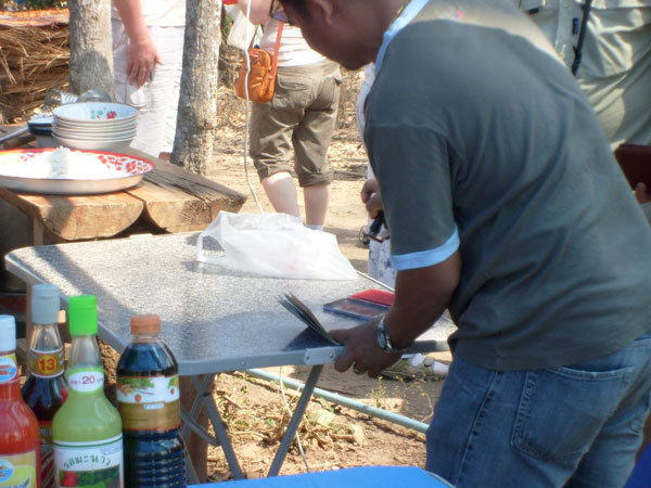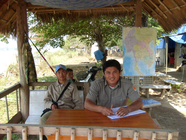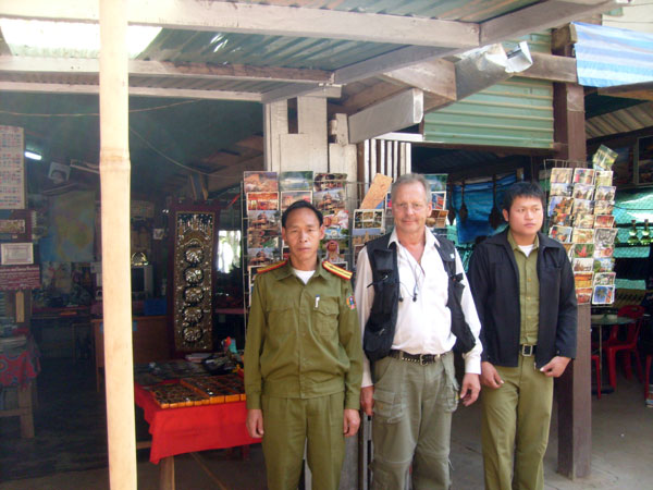 Eine französische Reisegruppe konnten wir bei der legalen Einreise beobachten. Die haben richtig teuer bezahlen müssen für das Visum. Meines Wissens 30 US-Dollar pro Person und dazu der ganze Papierkram, das Warten, alles im Preis inbegriffen. Der ganze Aufwand für zwei, drei Stunden laotischen Basar! Na ja, dachte ich so bei mir, irgendwie müssen die Menschen hier ja auch zu Kohle kommen. Ich habe mich dann noch mit einem Oberst und einem sogenannten Geheimpolizisten der laotischen Armee fotografieren lassen. Beide musste ich aber vorher mit je 50 Baht bestechen.