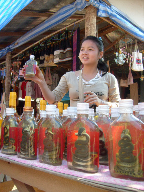 Nun hatten wir die etwas ungewöhnliche Gelegenheit bekommen, ohne ein Visum mal schnell mit einem Mekongboot nach Laos zu schibbern. Zwei Stunden zu 400 Baht pro Boot. Ich war erstmal skeptisch, hatte ich doch eine gewisse Verantwortung. Was ist, wenn... usw. So waren meine Überlegungen. Aber mai bpen rai, mai bpen rai, no Problem, no Problem, sagte der Bootsführer. Raoul (83), Michel aus Frankreich, eben Farangs. Und was ist, wenn die Thaipolizei auftaucht, wenn wir zurückkommen? Meine Frau sagte dann auch den beliebten Ausspruch "mai bpen rai, mai bpen rai". So wagten wir den Trip per Boot. 20 Minuten später Anlegen auf laotischer Seite. Die steile Uferböschung hoch und 20 Baht "Eintritt" pro Person beim laotischen Zoll bezahlt. Wohlgemerkt: Alles ohne Passkontrolle und ohne irgendein Formular auszufüllen, einfach nischt. Als würde man Eintritt für den örtlichen Basar bezahlen. Auf dem waren wir dann auch. Dort sind wir dann rumgeschlendert und haben über die billigen Preise gestaunt. Egal was, es war extrem billig. Michel konnte dann auch beim Kobraschnaps nicht widerstehen und hat eine Flasche davon gekauft.